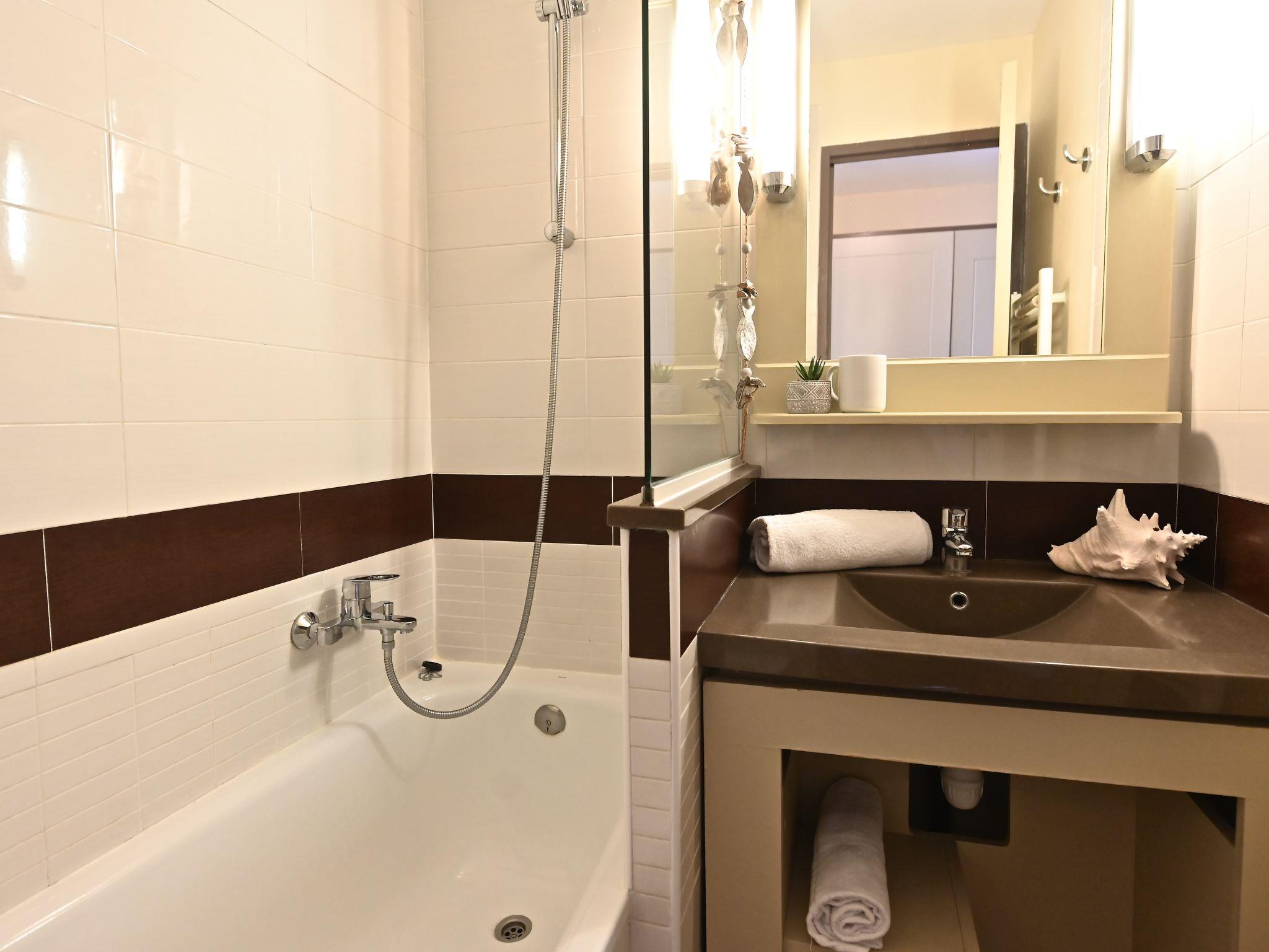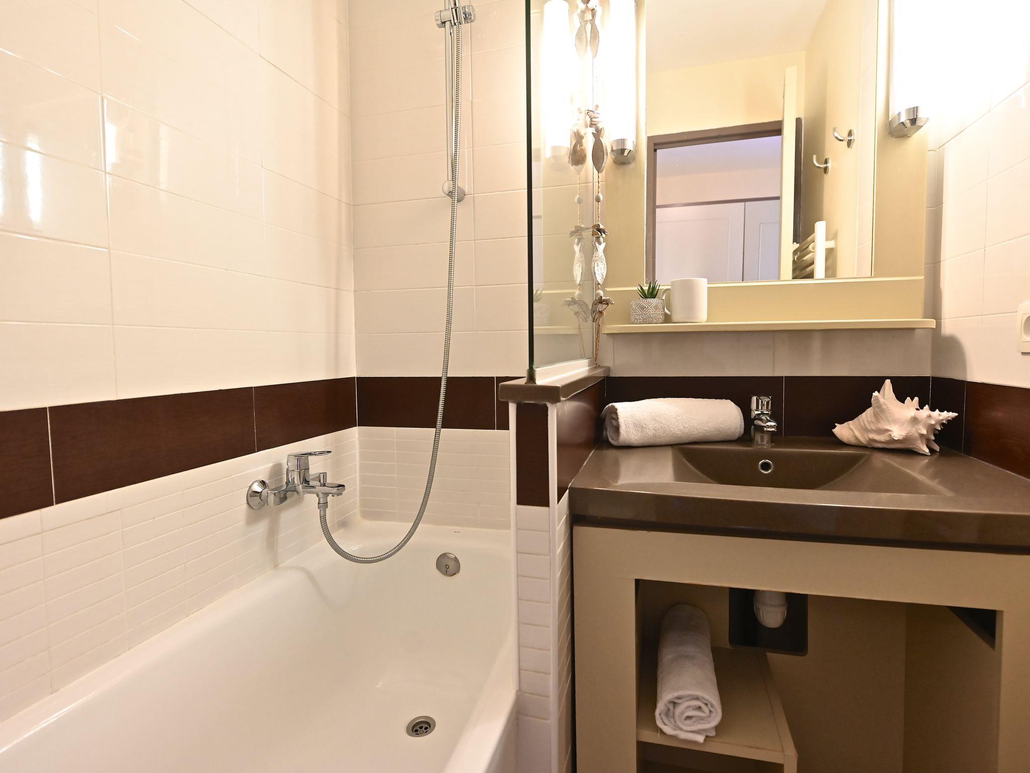 "Le Village (E1 208)", 2-room apartment 30 m2 on 1st floor. Living room with 1 sofabed (160 cm, length 200 cm), TV (flat screen), air conditioning. Exit to the terrace. 1 room with 1 french bed (140 cm, length 190 cm). Kitchenette (4 hot plates, dishwasher, toaster, kettle, microwave, freezer, electric coffee machine, Capsules for coffee machine (Senseo) extra). Bathroom, sep. WC. Electric heating, air-conditioning. Terrace 9 m2, roofed. Terrace furniture. View of the sea. Facilities: Internet (WiFi, extra). Parking. Please note: non-smokers only. Smoke alarm. Offer by a private individual according to Art. 155, IV of CGI.