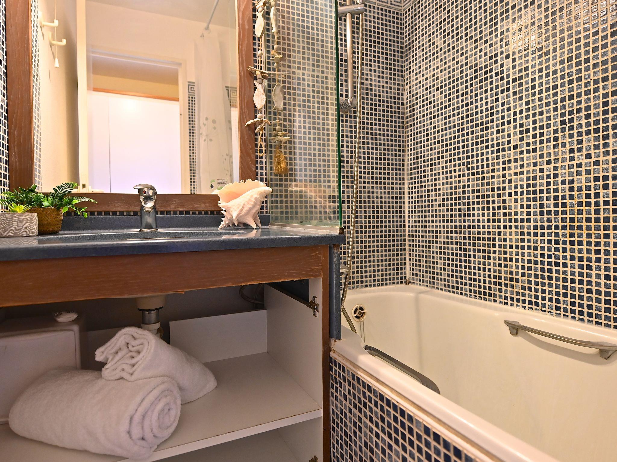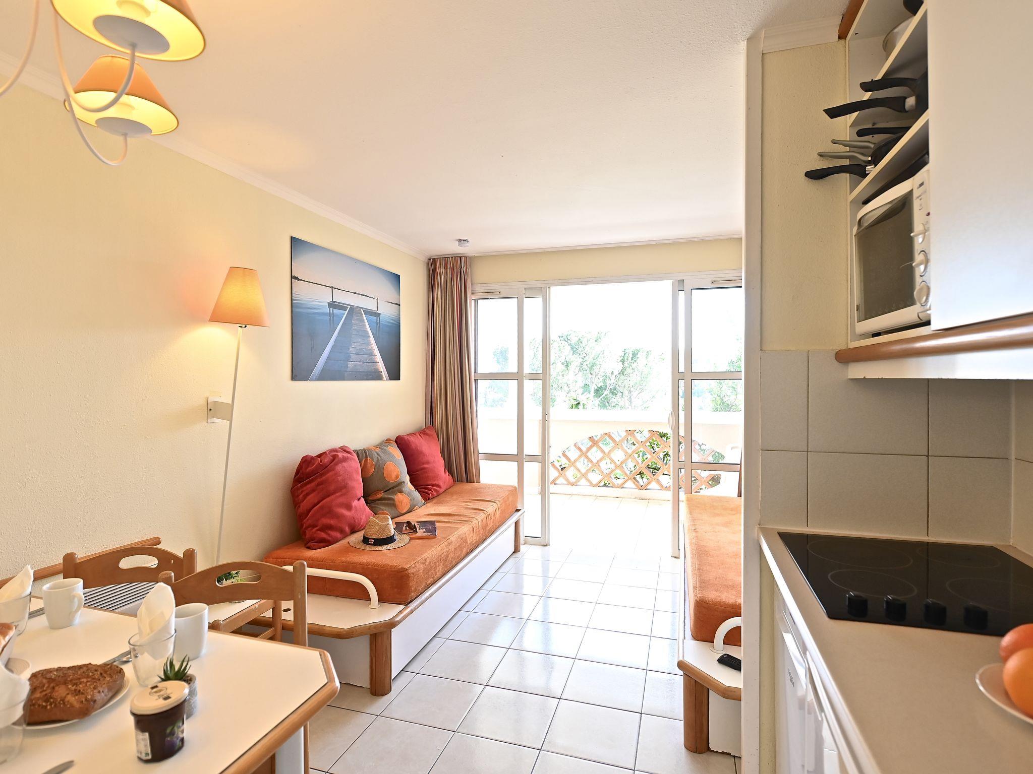 "L'Esquinade (F2 105)", 2-room apartment 28 m2. Living/sleeping room with 1 pull-out bed (2 x 80 cm, length 190 cm), TV (flat screen). Exit to the terrace. 1 small room with 1 french bed (140 cm, length 190 cm). Kitchenette (4 hot plates, dishwasher, toaster, kettle, microwave, electric coffee machine). Bathroom, sep. WC. Electric heating. Terrace 10 m2, roofed. Terrace furniture. View of the sea. Facilities: Internet (WiFi, extra). Parking space n 2598 (roofed). Please note: non-smokers only. Maximum 1 small pet/ dog allowed. Smoke alarm.