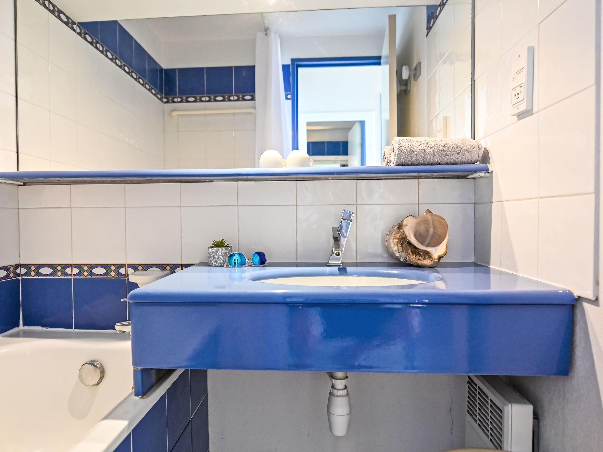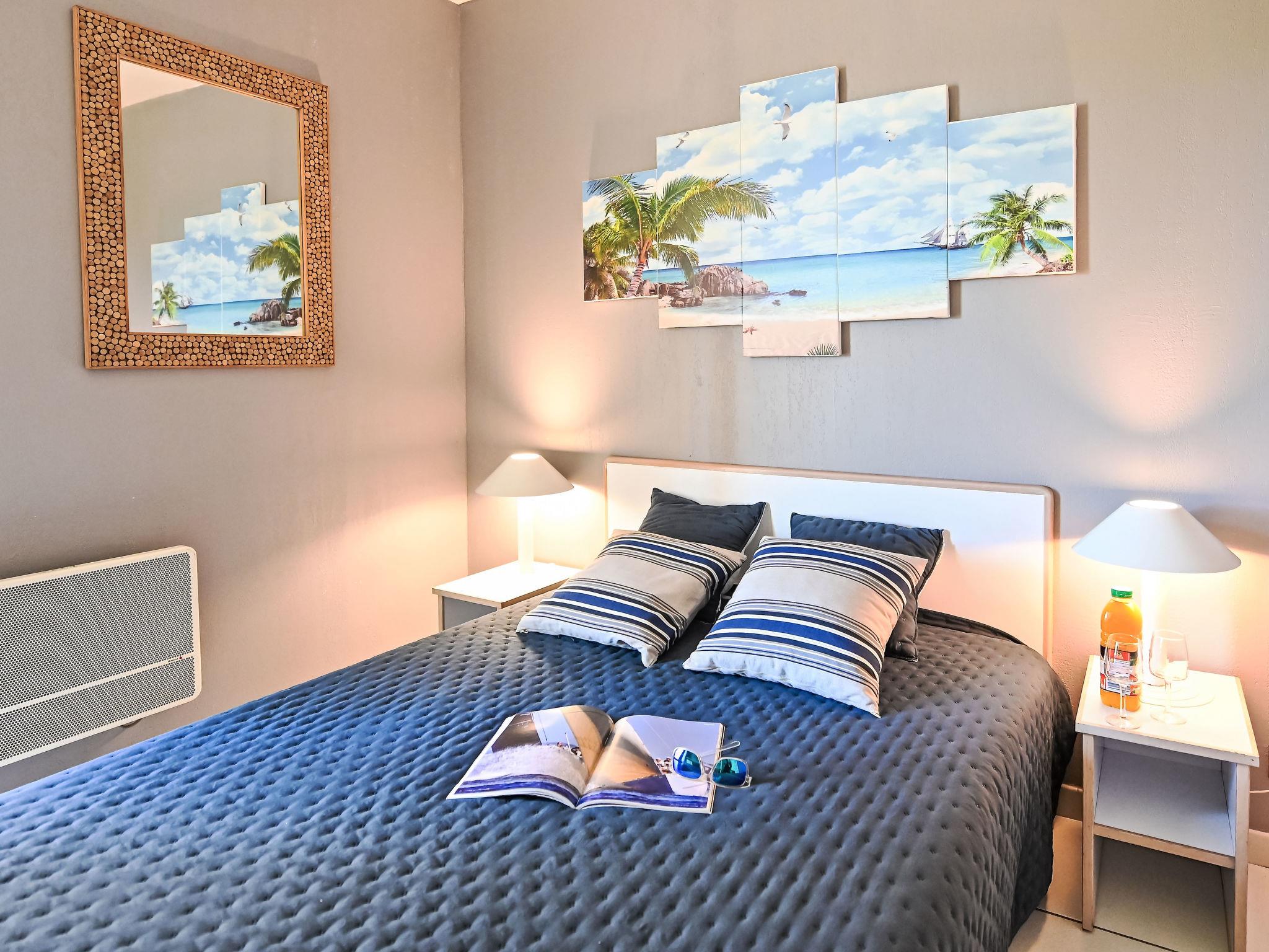 "Les Bastides (I3 049)", 2-room apartment 36 m2, on the upper ground floor. Living room with 2 sofabeds (80 cm, length 190 cm), TV (flat screen). Exit to the garden, to the terrace. 1 room with 1 french bed (140 cm, length 190 cm). Exit to the terrace. Kitchenette (4 hot plates, oven, toaster, kettle, microwave, freezer, electric coffee machine). Bath/WC. Electric heating. Terrace 10 m2, patio. Terrace furniture. View of the sea. Facilities: Internet (WiFi, extra). Parking (1 car) at the house. Please note: non-smokers only. Maximum 1 small pet/ dog allowed. Smoke alarm. Offer by a private individual according to Art. 155, IV of CGI.