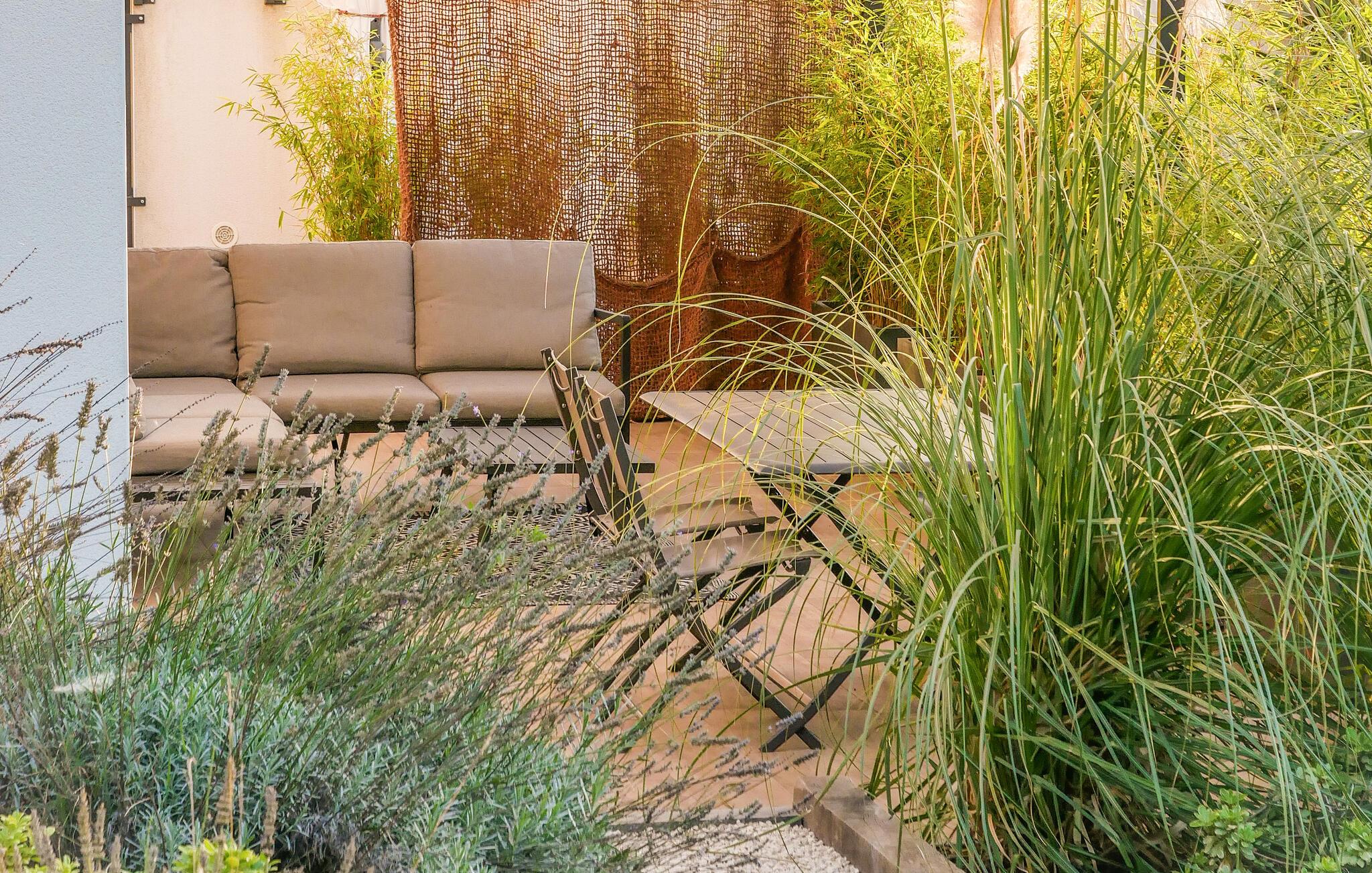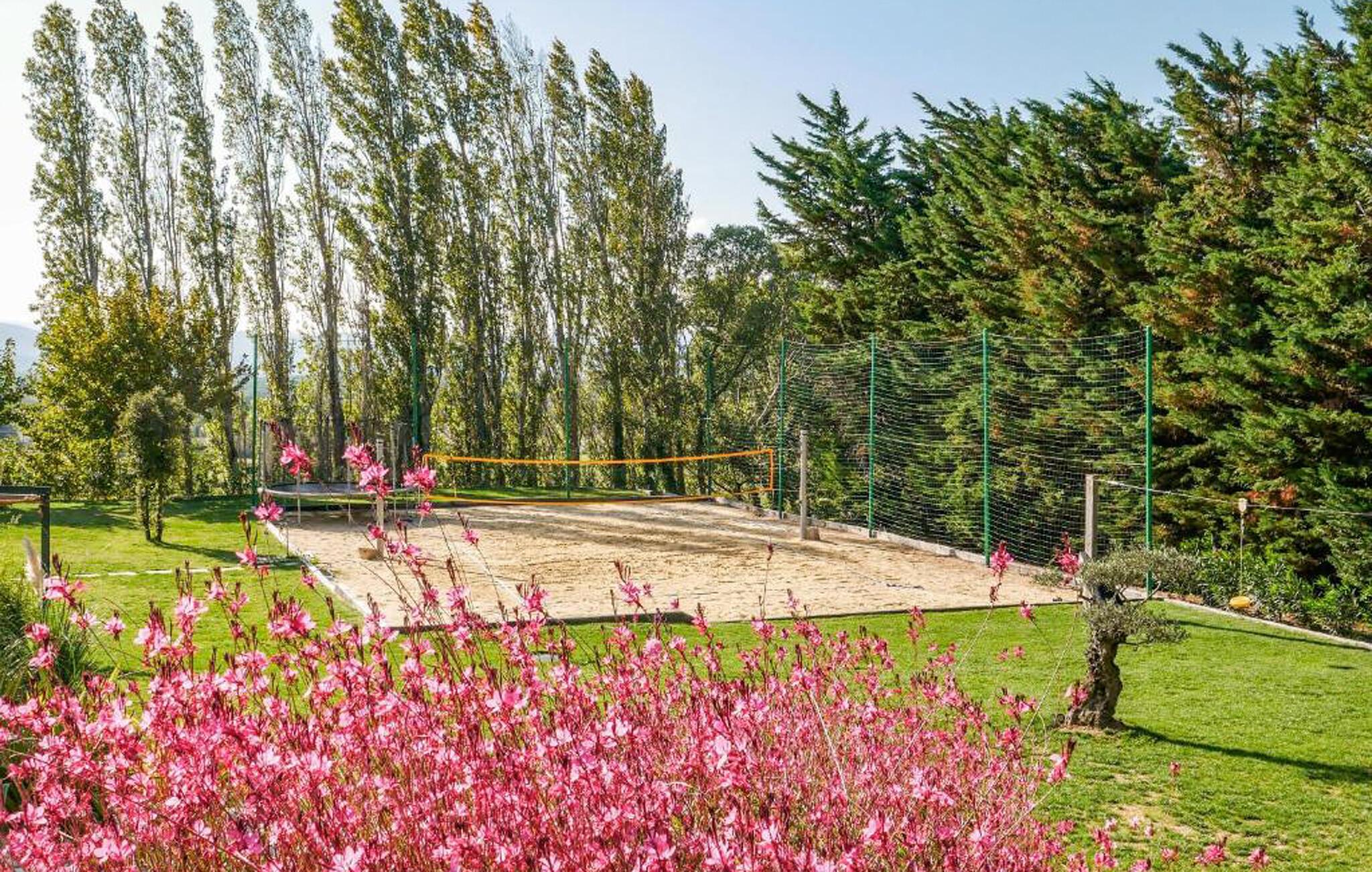 Det välskötta utomhusområdet har en skuggig terrass där ni kan äta frukost, prata över ett glas vin och njuta av mysiga grillkvällar. Ta ett uppfriskande dopp i den vackra poolen och njut av den fridfulla atmosfären med en siesta på en solstol, medan barnen njuter av de härliga lekplatserna utomhus.