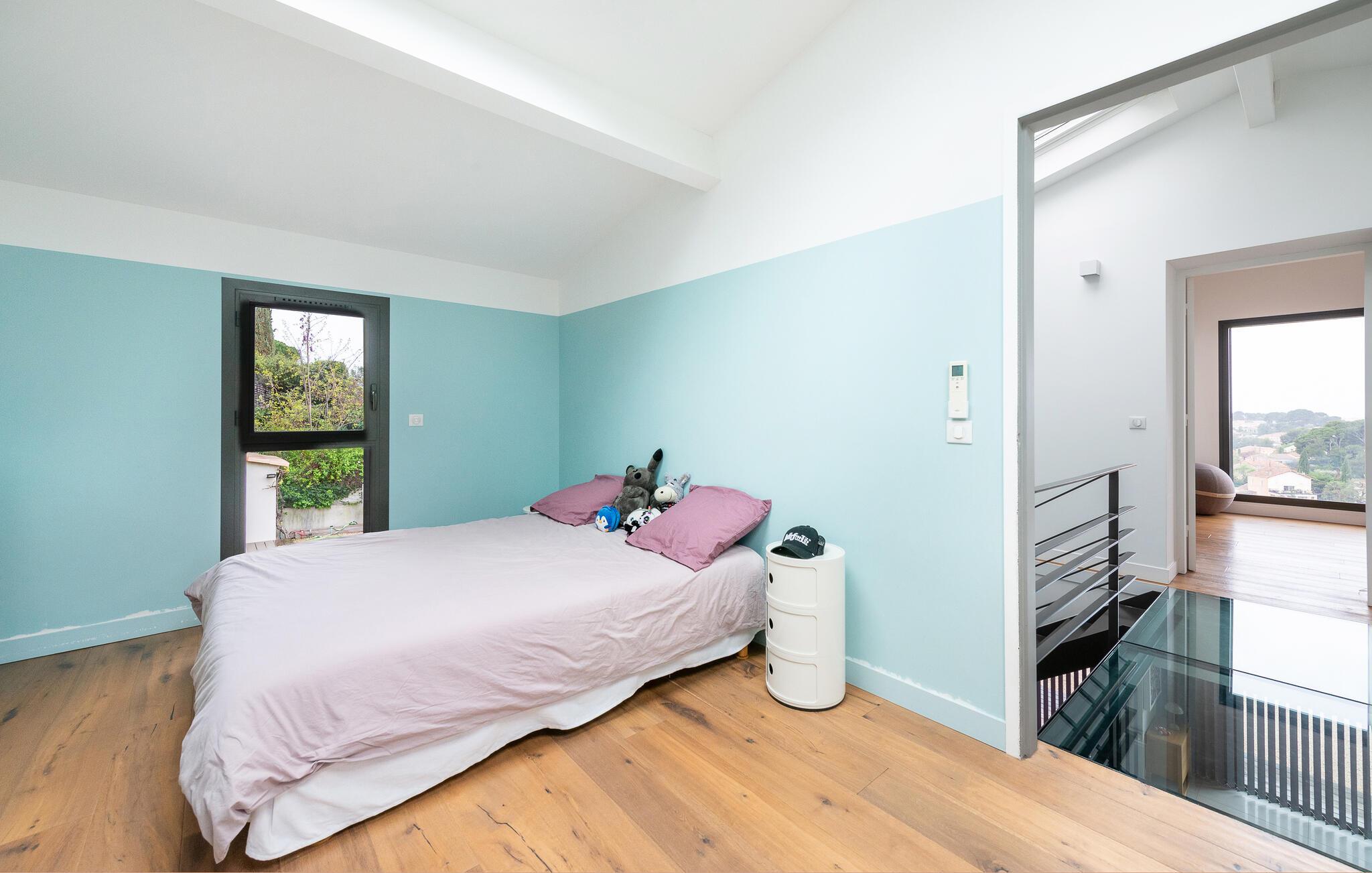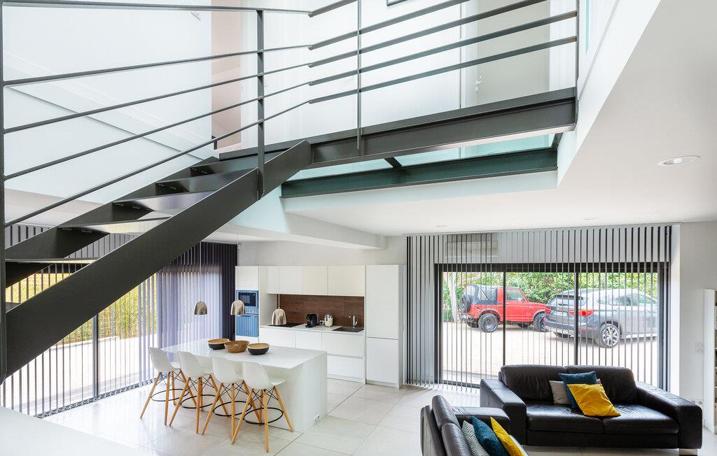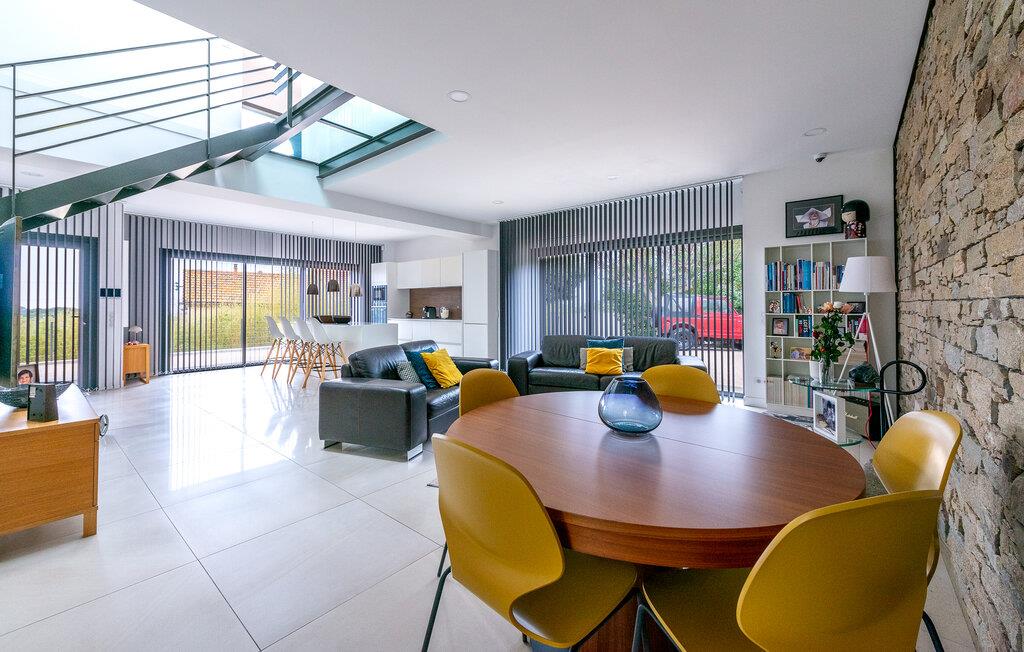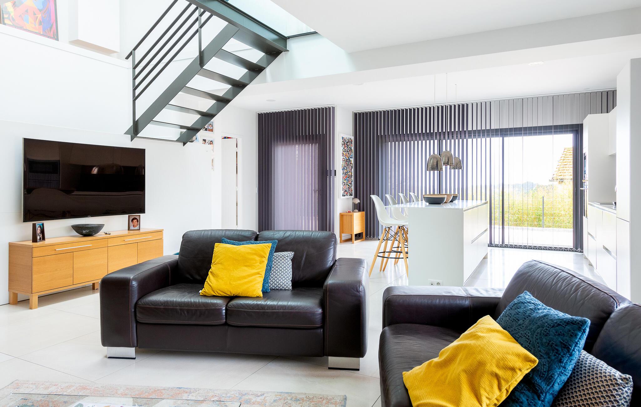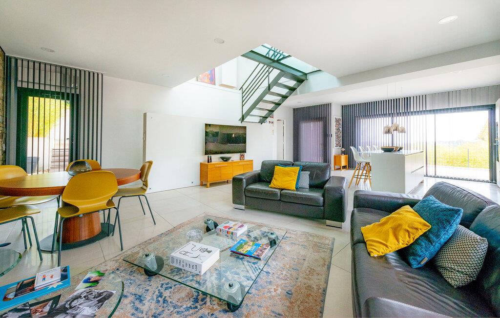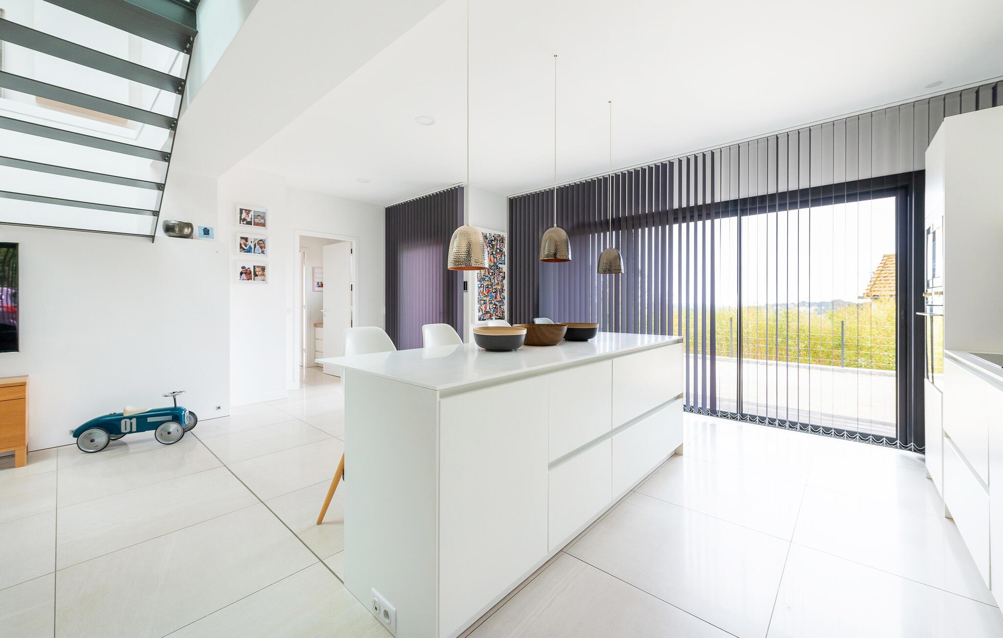 Res tillsammans med din familj till detta underbara semesterhus, som erbjuder dig öppna och ljusa rum på två våningar som inbjuder dig att umgås i soffan, spela spel vid matbordet eller laga mat tillsammans. Ta den stora trappan till de vackra sovrummen på övervåningen, som erbjuder en vänlig och avkopplande miljö med fönster från golv till tak och takfönster.