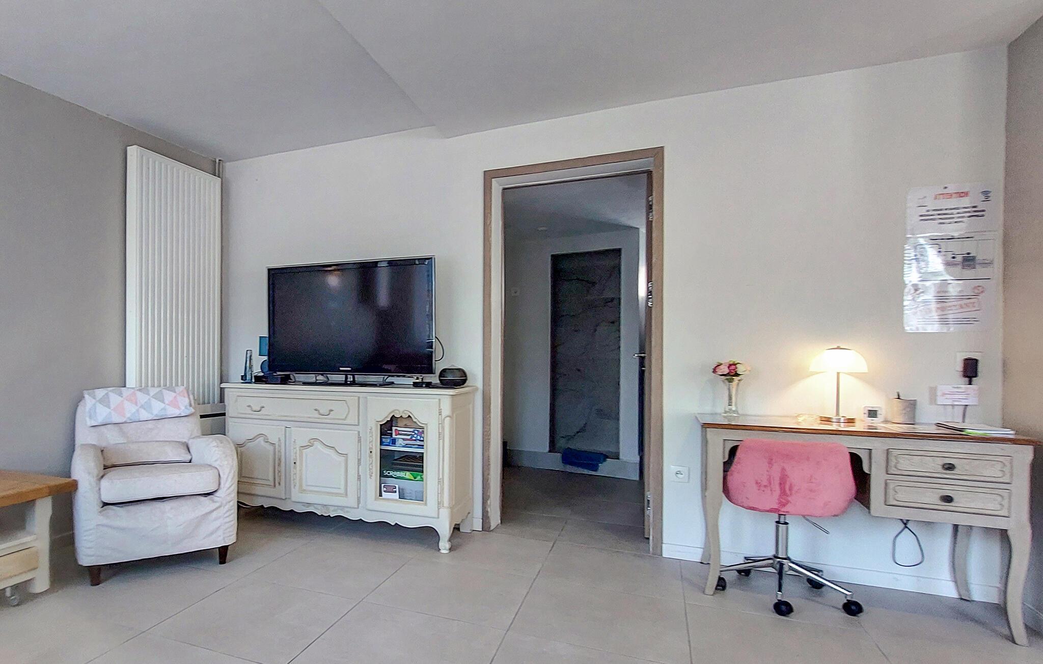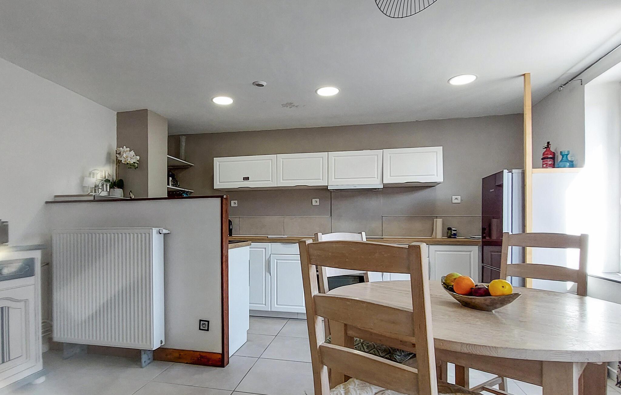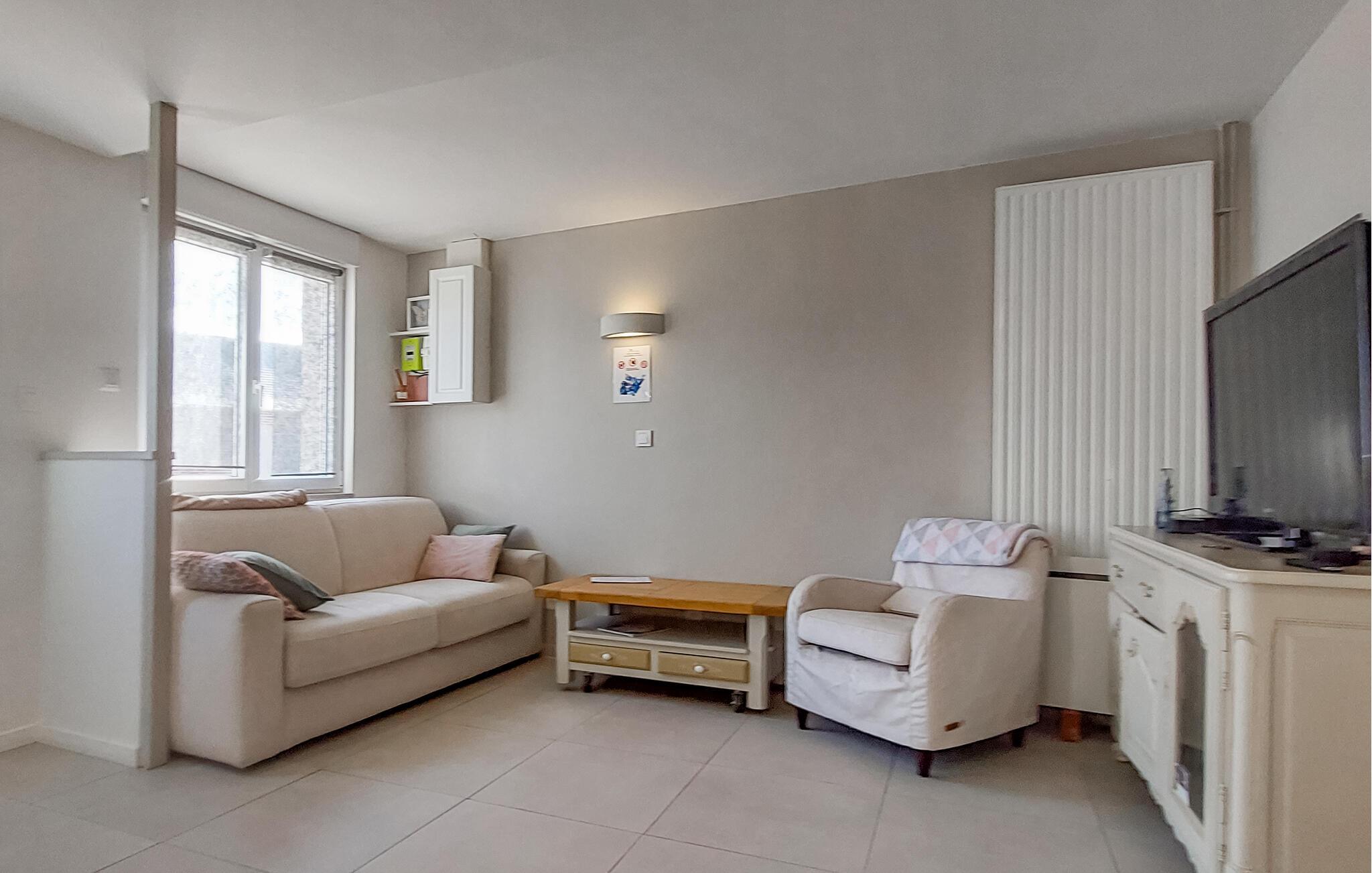 Njut av lite tid i detta vänliga semesterhus i en lugn by i Normandie. Gör dig bekväm i den mysiga soffan i vardagsrummet och använd TV:n för avkopplande kvällar. Den enkla designen med ljusa väggar och varma träelement skapar en mysig atmosfär, medan det rymliga pentryt inbjuder dig att förbereda dina favoriträtter. Det intilliggande matbordet ger plats för mysiga måltider tillsammans.