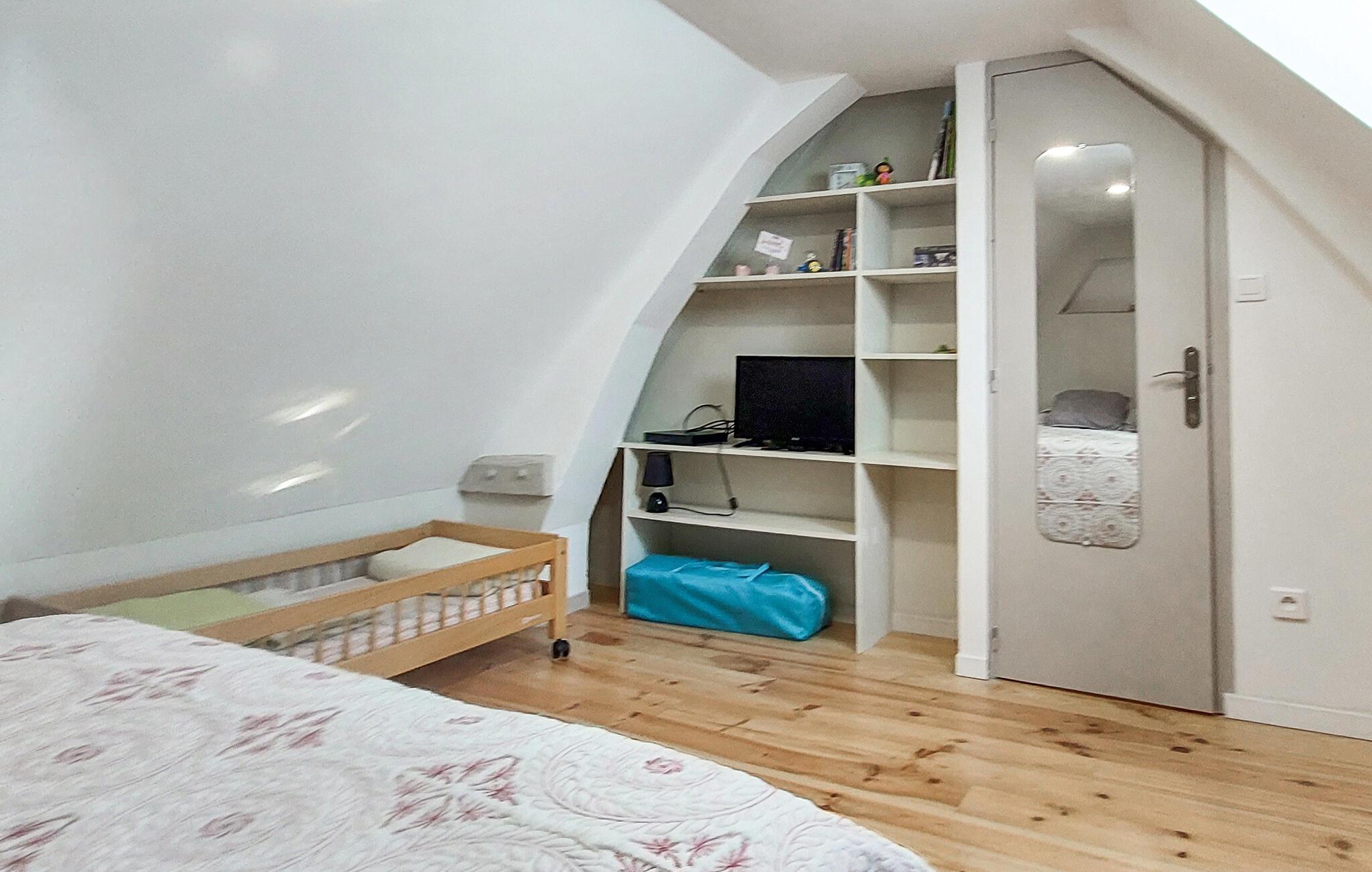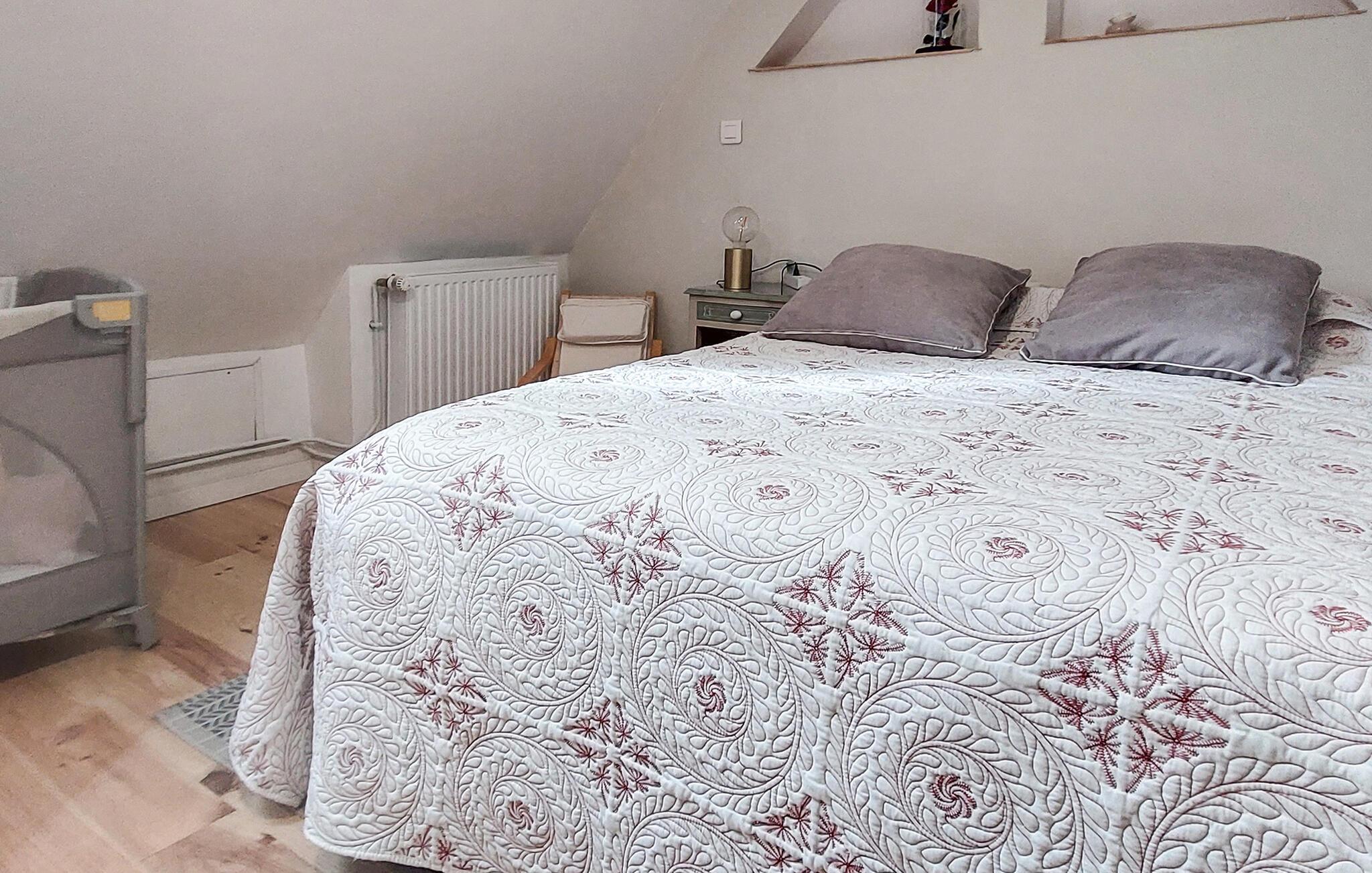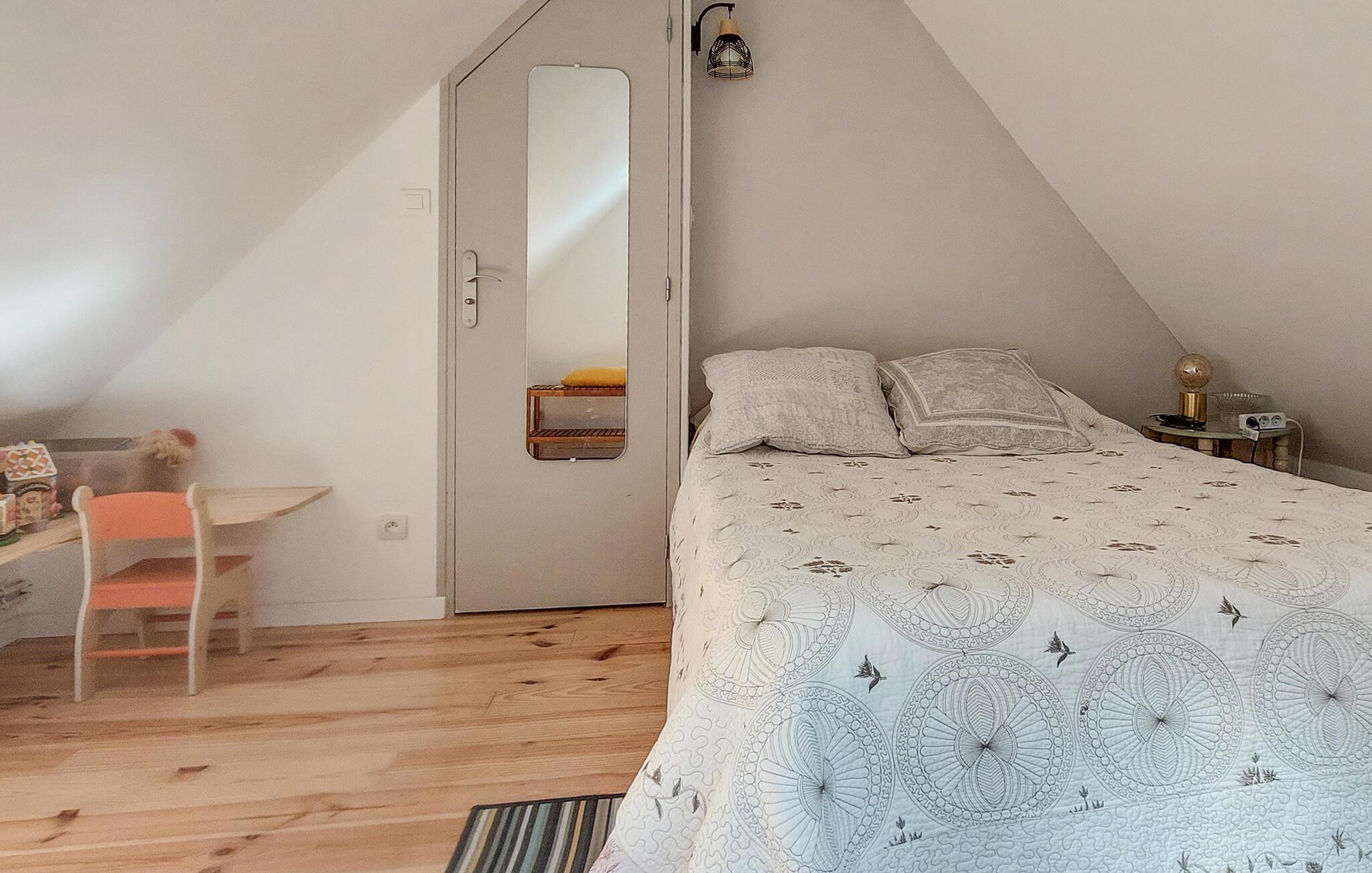 Njut av lite tid i detta vänliga semesterhus i en lugn by i Normandie. Gör dig bekväm i den mysiga soffan i vardagsrummet och använd TV:n för avkopplande kvällar. Den enkla designen med ljusa väggar och varma träelement skapar en mysig atmosfär, medan det rymliga pentryt inbjuder dig att förbereda dina favoriträtter. Det intilliggande matbordet ger plats för mysiga måltider tillsammans.