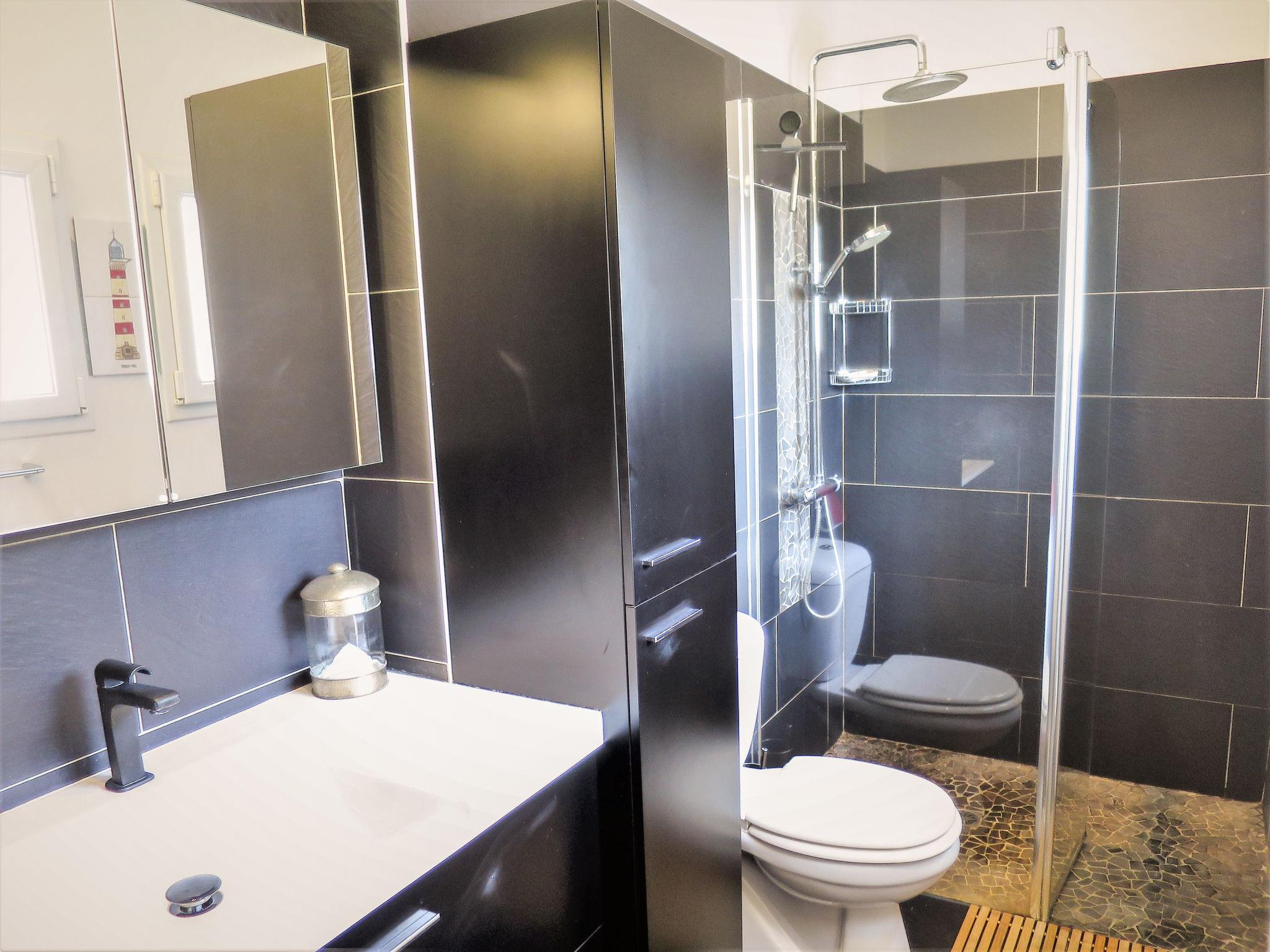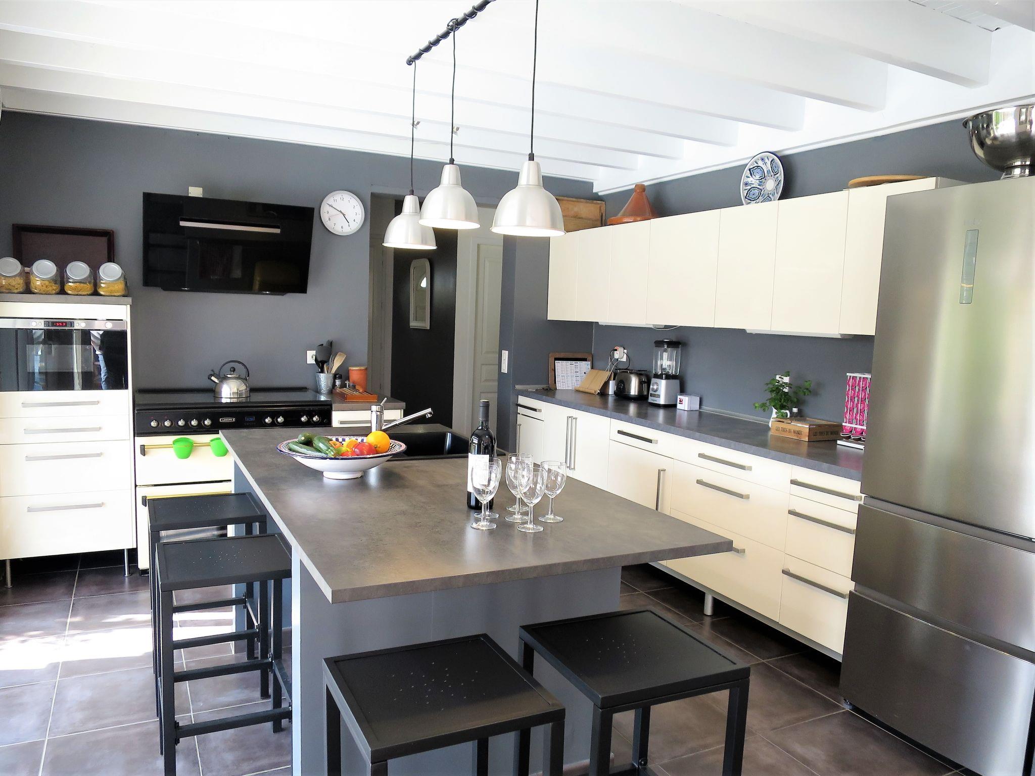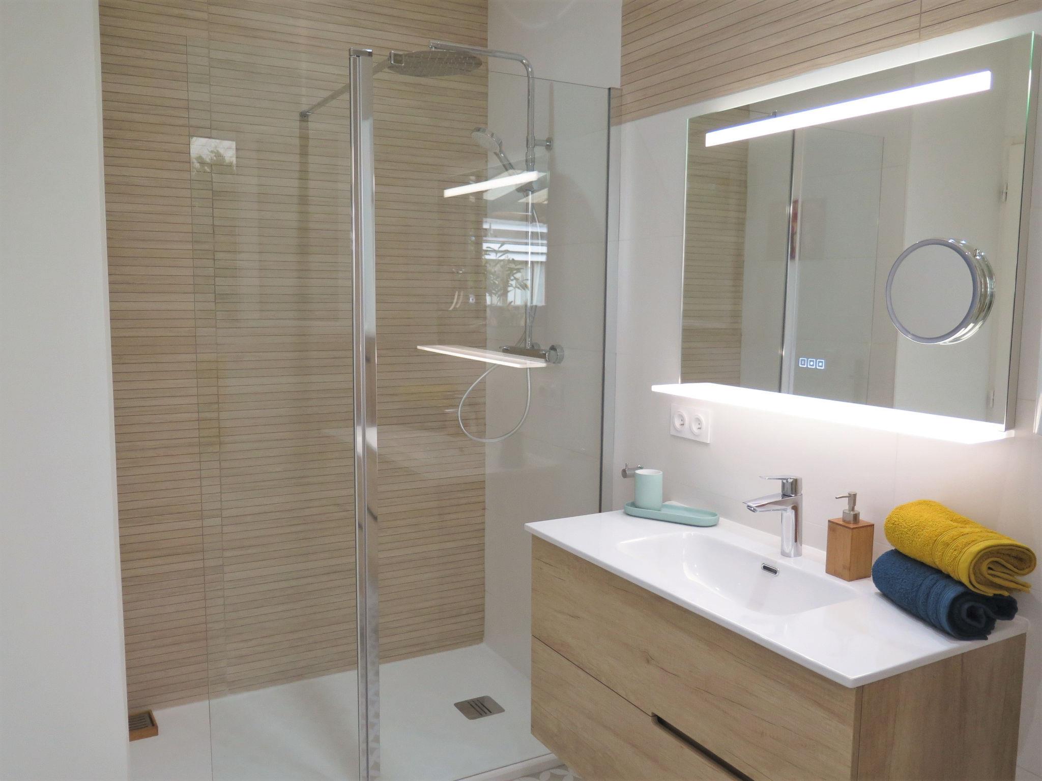 " Villa Camélia", 4-room house 110 m2. Beautiful and modern furnishings: living/dining room with dining table and TV (flat screen), CD-player. Exit to the terrace. 1 room with 1 french bed (140 cm, length 190 cm), shower/WC. 1 room with 1 french bed (140 cm, length 190 cm). 1 room with 1 french bed (160 cm, length 200 cm). Open kitchen (oven, dishwasher, 4 induction hot plates, toaster, kettle, microwave, freezer, electric coffee machine) with bar. Exit to the terrace. Shower, sep. WC. Electric heating. Terrace 30 m2 partly roofed. Terrace furniture, barbecue (portable), deck chairs (6), box-room. Facilities: washing machine, dryer, iron, children's high chair. Internet (WiFi, free). Please note: non-smoking house. Smoke alarm. 3300500004663