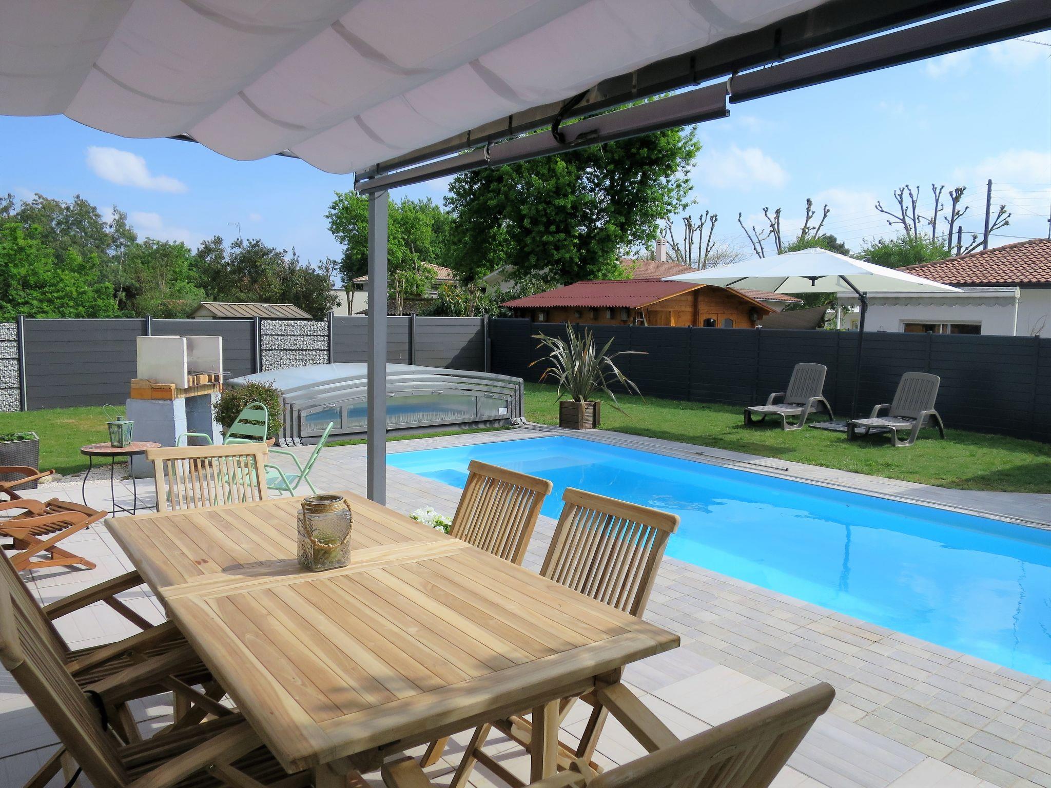 Beautiful villa "Camélia". 1 km from the centre of Andernos les Bains, 40 km from the centre of Arcachon, 45 km from the centre of Bordeaux, 1 km from the sea, in a cul-de-sac. Private: property 750 m2 (fenced), well-kept garden with lawn and wildlife garden, indoor pool (7 x 3 m, depth 150 cm, seasonal availability: 01.Jul. - 15.Sep.) with shutter cover. Terrace, parking at the house on the premises. Bus stop "Capsus" 900 m, sandy beach "Plage du Bétey (Bassin)" 1 km. Golf course (9 hole) 6 km. Nearby attractions: Plage du Grand Crohot (Océan Atlantique) 16 km.