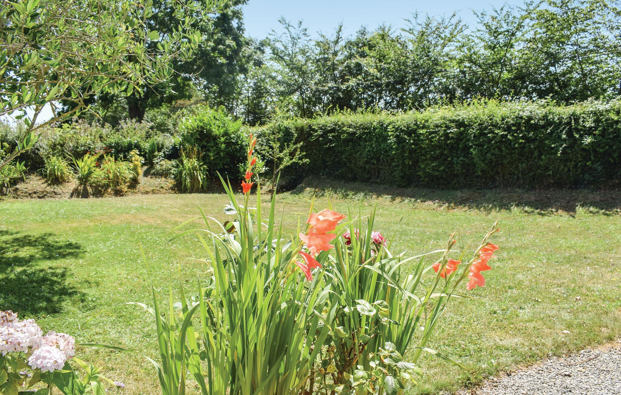 Det finns en härlig trädgård på framsidan av huset, en fruktträdgård på sidan och en vildblommig äng på baksidan som är full av vildblommor och fjärilar på våren och sommaren.