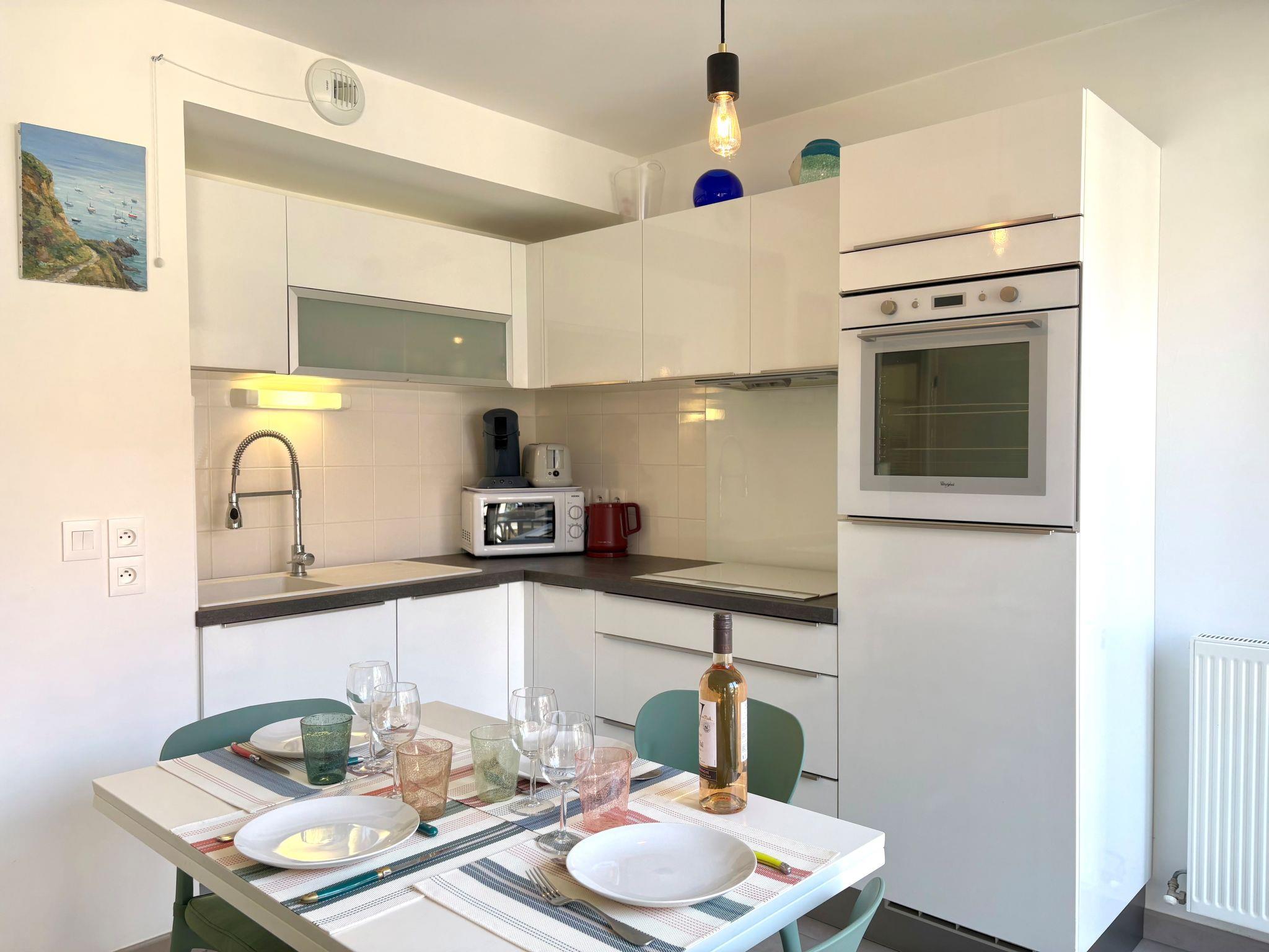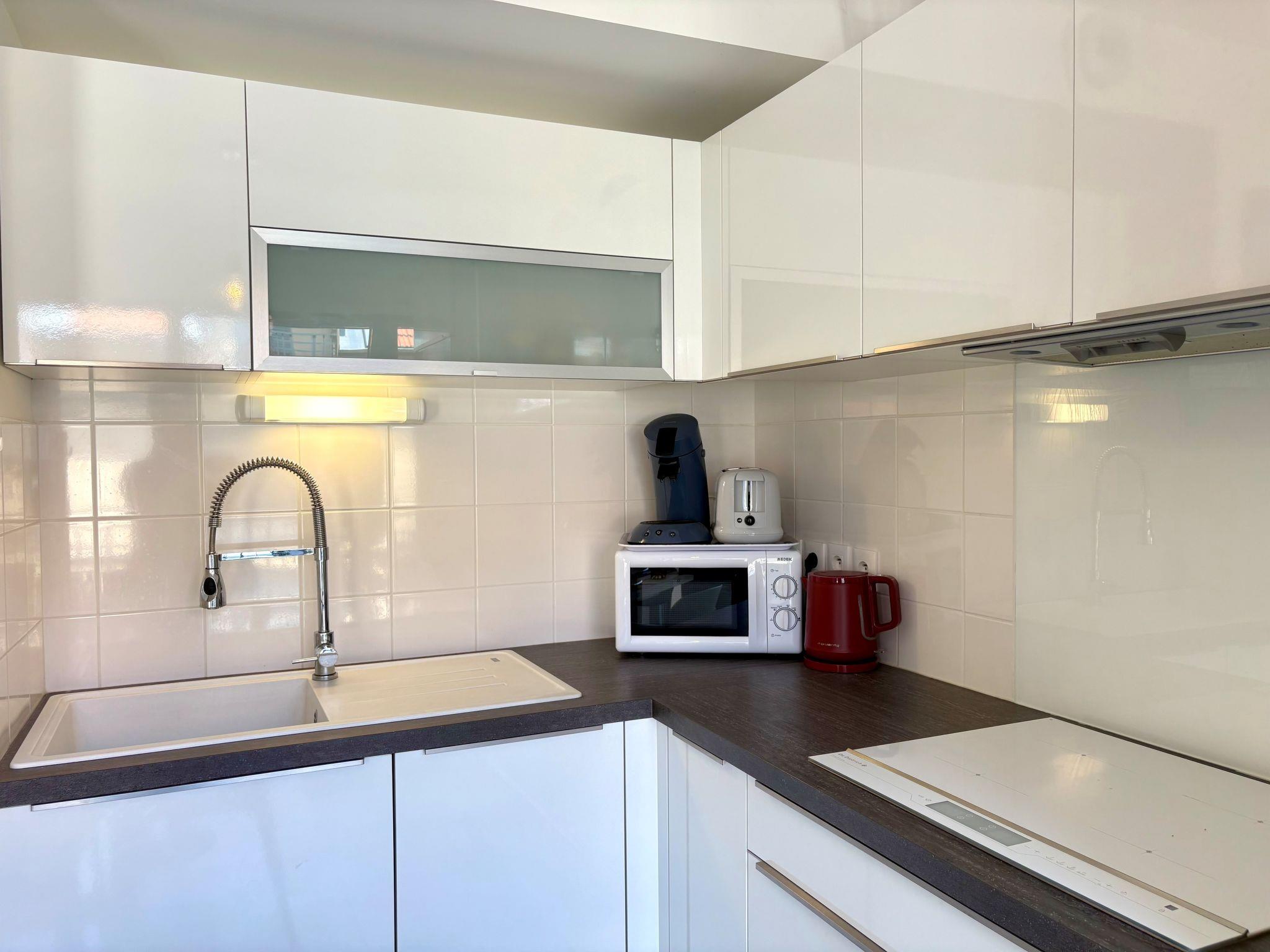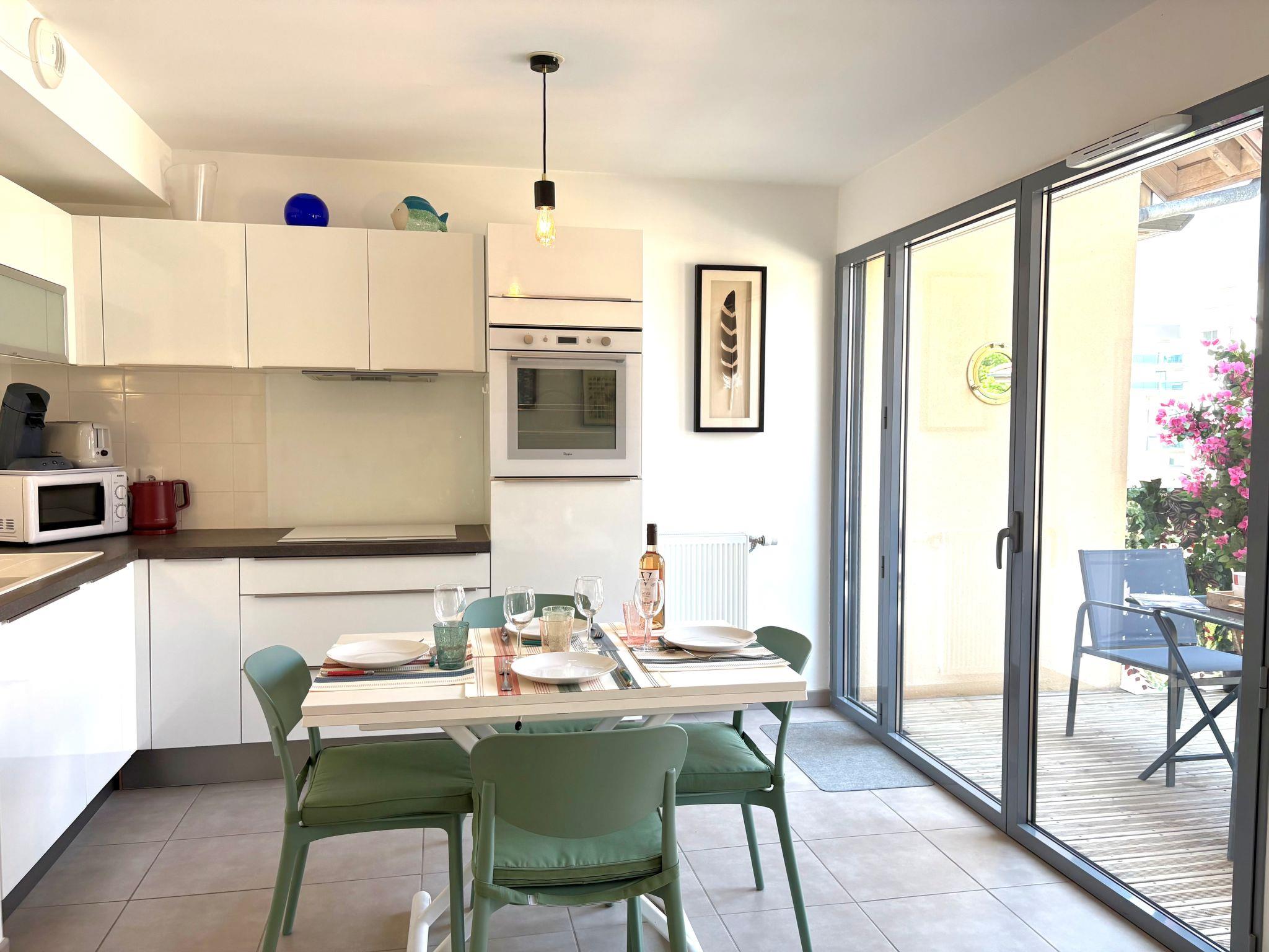 2-room apartment 42 m2 on 2nd floor. Comfortable and beautiful furnishings: living/dining room with 1 double sofabed (1 x 140 cm, length 190 cm), TV (flat screen). Exit to the terrace. 1 room with 1 french bed (1 x 140 cm, length 190 cm). Open kitchen (oven, dishwasher, 4 induction hot plates, toaster, kettle, microwave, electric coffee machine, Capsules for coffee machine (Senseo) extra). Shower, sep. WC. Electric heating. Terrace 5 m2, north facing position and, east facing position. Terrace furniture. Facilities: washing machine, iron, hair dryer. Internet (WiFi, free). Garage space n 37 (1 car). Please note: smoke alarm. Offer by a private individual according to Art. 155, IV of CGI. 330090036421B