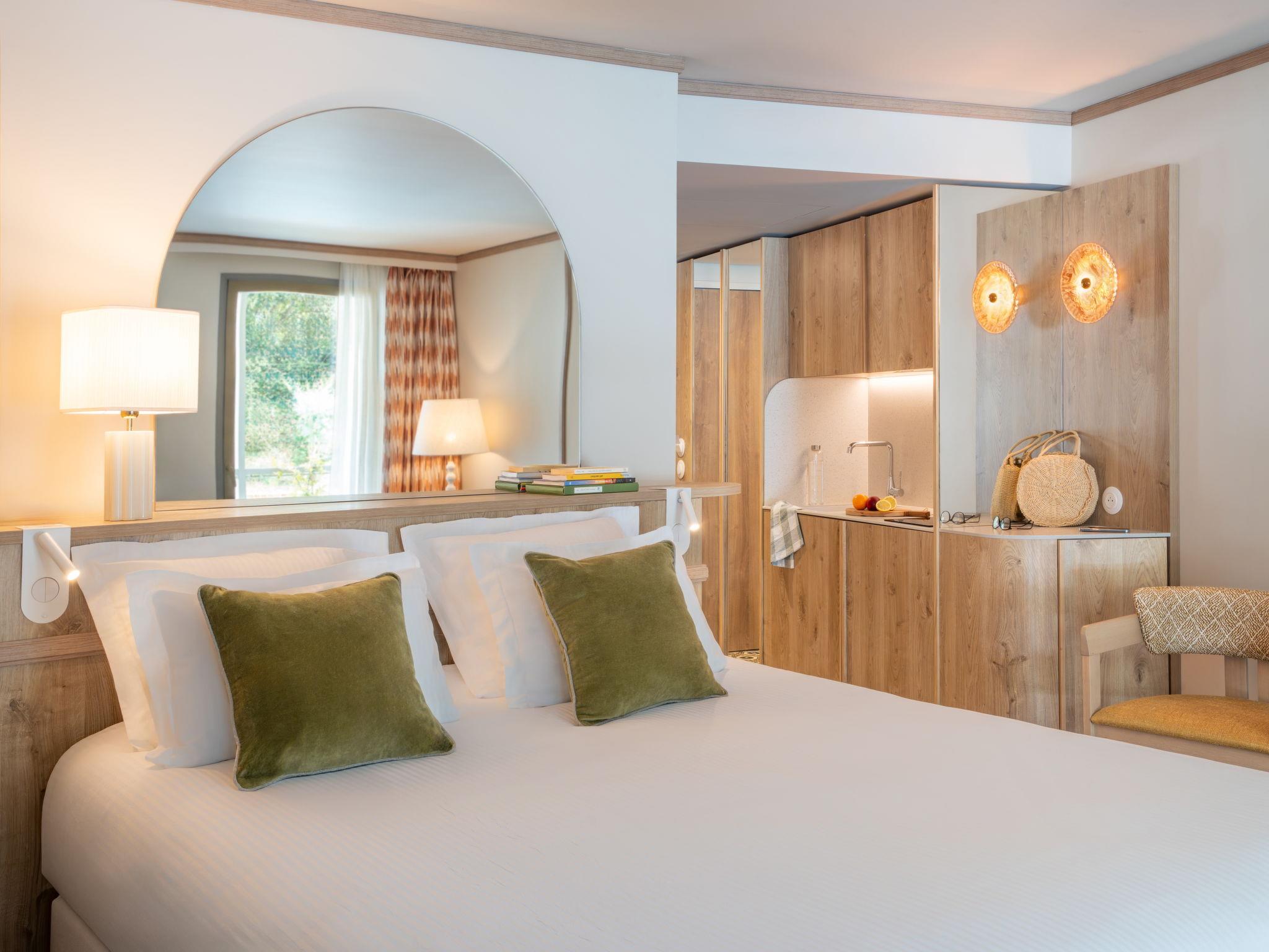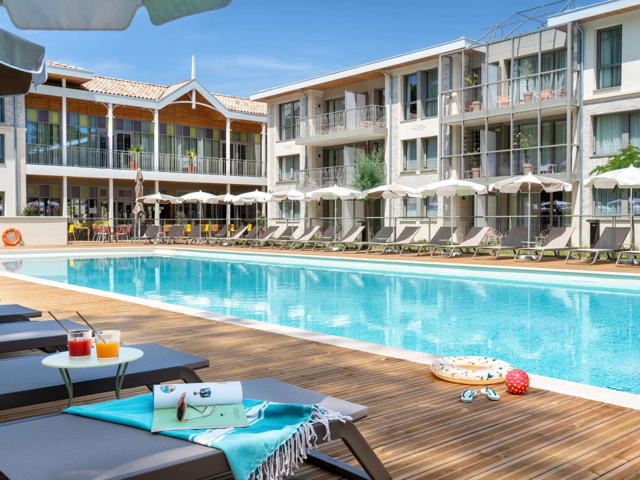 Very beautiful aparthotel "La Résidence", 3 storeys, built in 2025. On the outskirts, 3 km from the centre of Arcachon, in the residential district, 10 m from the edge of the forest, 100 m from the sea, 100 m from the beach. For shared use: park 6'290 m2 (fenced), swimming pool heated (28 x 7 m, depth 100 - 150 cm, seasonal availability: 01.Apr. - 30.Oct.) with shutter cover. WC in the pool area. In the house: reception, restaurant, bar, breakfast room, fitness room, bicycle rental. Room cleaning daily on request (extra). Parking (extra). Shop 3 km, restaurant, bus stop 50 m, sandy beach "Pereire" 100 m. Golf course (18 hole) 3 km, tennis 200 m, cycle lane 100 m. Nearby attractions: Arcachon 3 km, Bordeaux 75 km. Hiking paths: Dune du Pilat 7 km. Please note: baby equipment on request (included). The photograph shows a typical example.