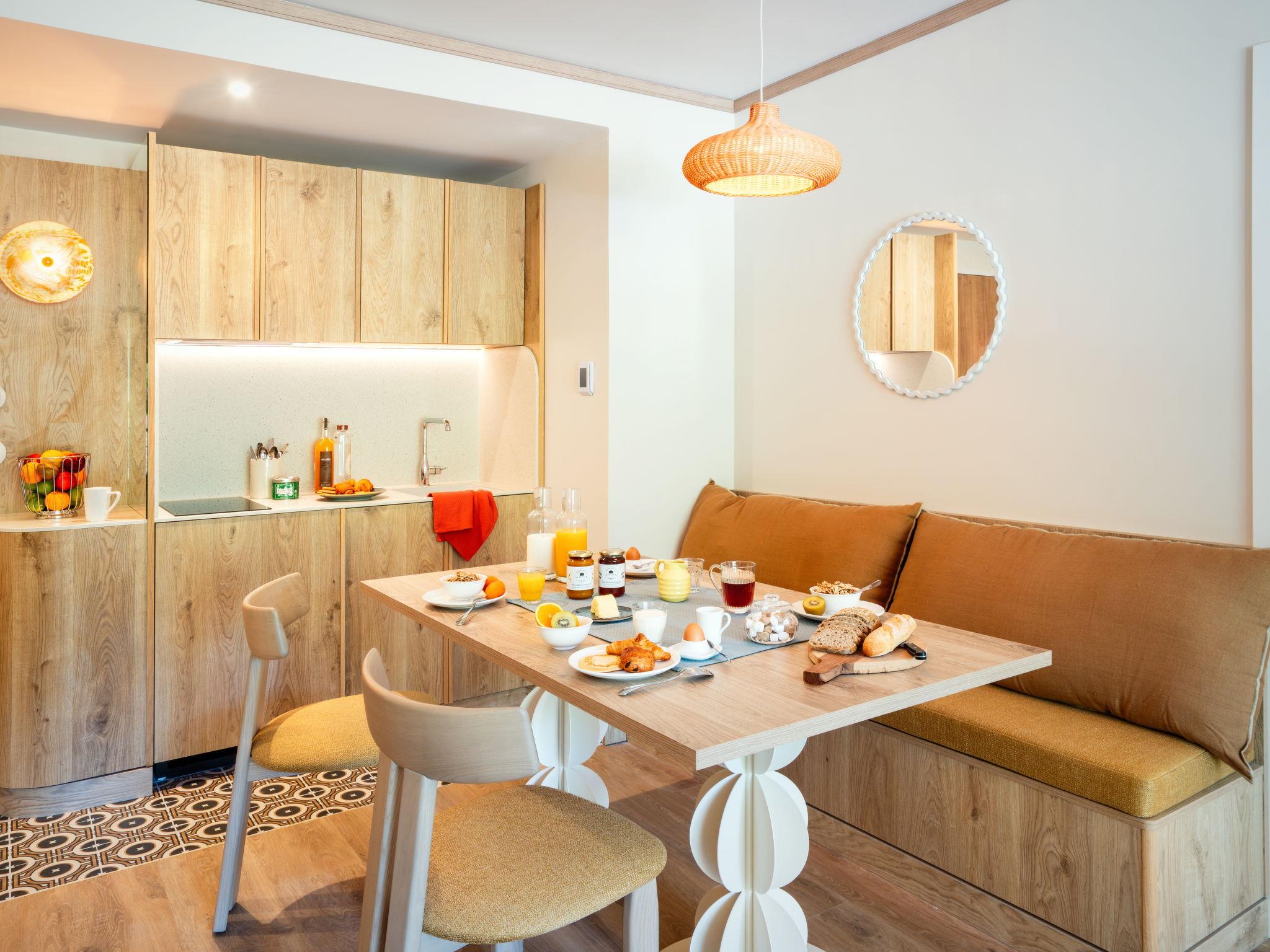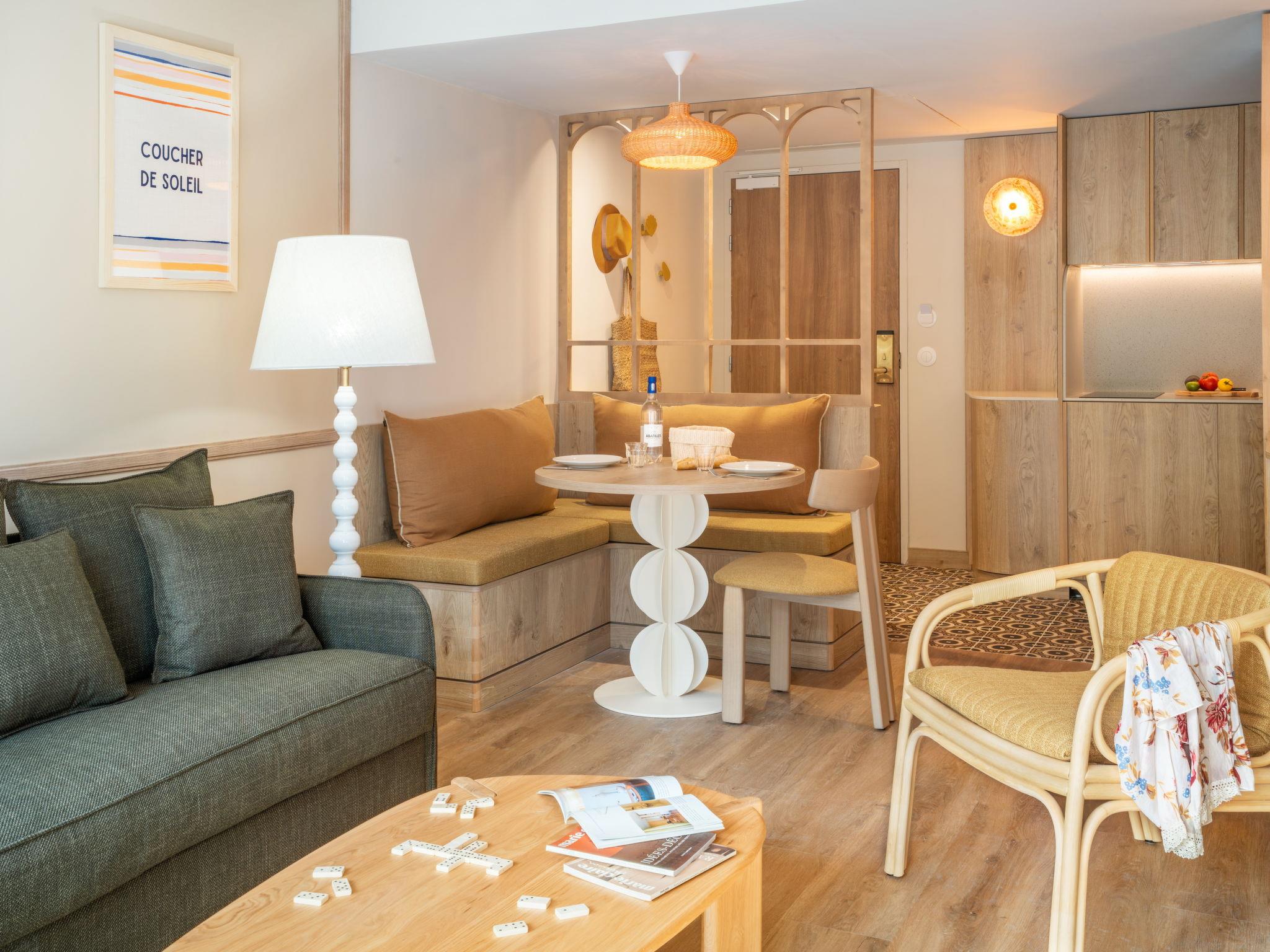 "La Résidence", 2-room apartment 41 to 55 m2. Modern furnishings: living/sleeping room with 1 double sofabed (160 cm, length 200 cm), dining table, satellite TV and air conditioning. Exit to the balcony. 1 room with 1 french bed (160 cm, length 200 cm), air conditioning. Open kitchen (dishwasher, 2 ceramic glass hob hotplates, kettle, microwave, electric coffee machine, Capsules for coffee machine (Nespresso) extra). Shower, sep. WC. Heating, air-conditioning. Balcony. Balcony furniture. Facilities: safe, hair dryer. Internet (WiFi, free). Parking (extra, roofed, 1 car). Please note: non-smokers only. Maximum 1 small pet/ dog allowed. Smoke alarm. Offer by a commercial proprietor according to Art. 155, IV, CGI FR3355.602.2