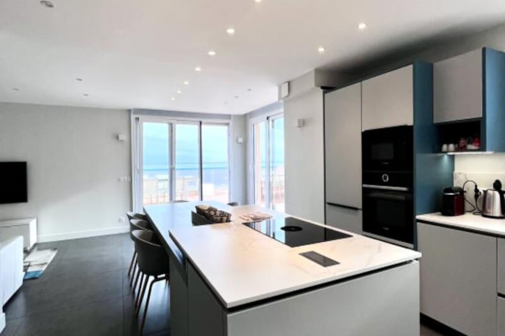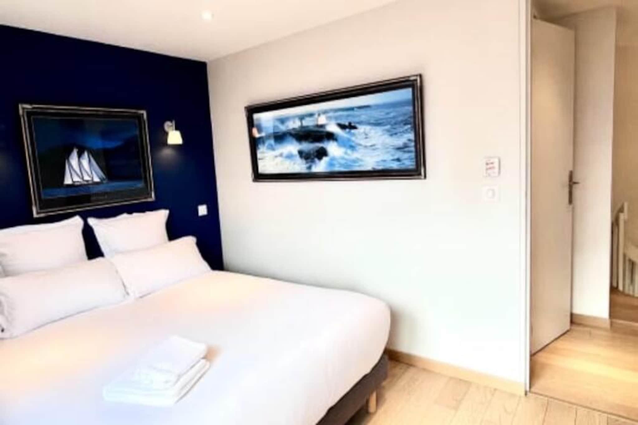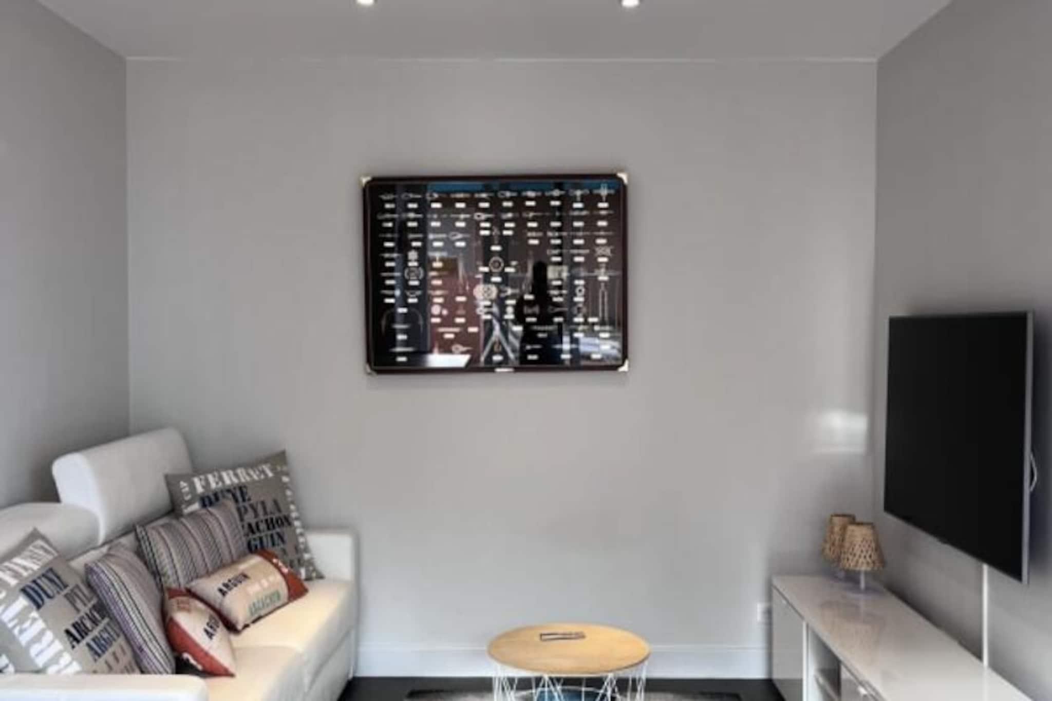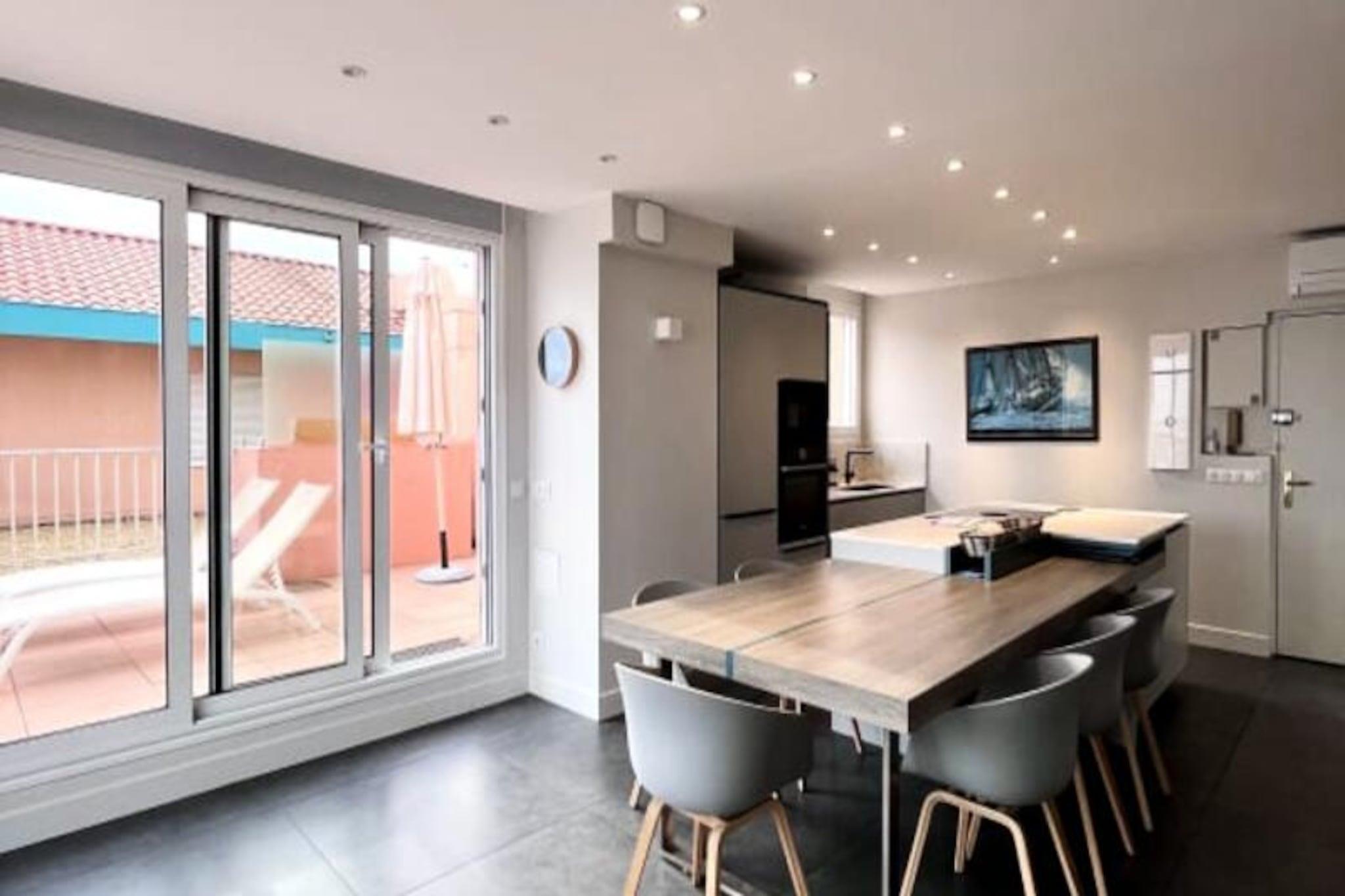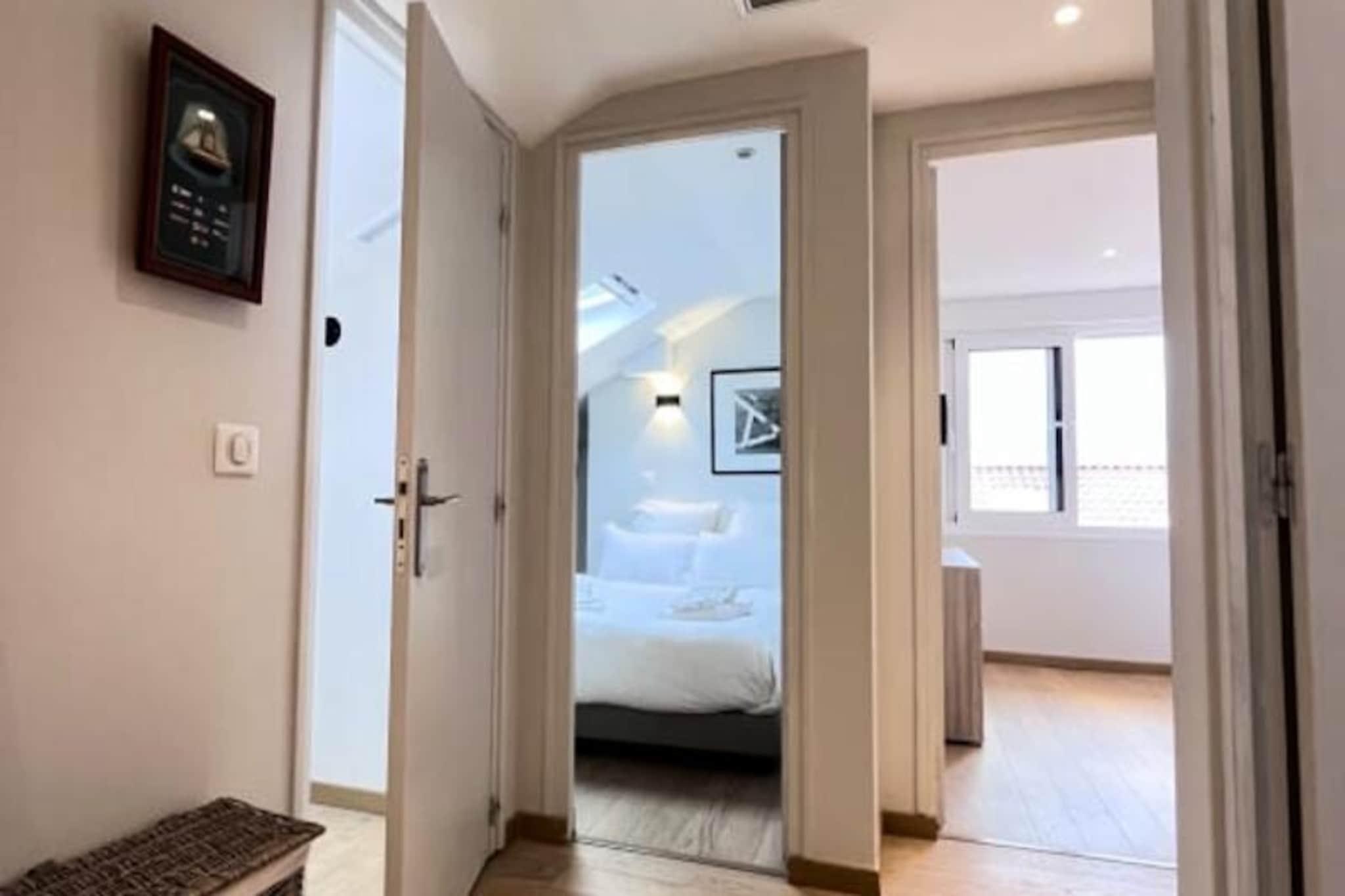 Med det milda ljudet av vågor som slår mot stranden erbjuder denna fantastiska duplexlägenhet i den prestigefyllda Résidence Eugénie en oöverträffad strandnära tillflyktsort i hjärtat av Arcachon. Belägen på den ikoniska Boulevard de la Plage inbjuder denna fastighet dig att vakna upp till en fantastisk panoramautsikt över bukten och njuta av direkt tillgång till den gyllene sanden bara några steg bort. Oavsett om du njuter av morgonkaffet på den 60 m² stora L-formade terrassen eller promenerar längs stranden, är varje ögonblick här genomsyrat av Arcachonbuktens charm och lugn. Inuti blandar den totalrenoverade lägenheten på 75 m² sömlöst modern komfort med kustnära elegans. Det öppna köket, utrustat med allt du behöver, flyter in i ett ljust och luftigt vardagsrum, perfekt för att koppla av efter en dag med utflykter. Med två rymliga dubbelrum och ett vindsrum som är perfekt för barn, rymmer detta hem bekvämt upp till sex gäster. Höghastighetsinternet, luftkonditionering och sängkläder ingår för en stressfri vistelse, medan genomtänkta detaljer som bäddade sängar vid ankomst och städning vid avresan bidrar till bekvämligheten. Läget är oslagbart. Bara en kort promenad från Arcachons livliga centrum hittar du ett härligt utbud av butiker, restauranger och nöjesalternativ. För dem som anländer med bil ingår en privat och säker parkeringsplats. Husdjursvänliga boenden finns tillgängliga på begäran, vilket gör detta till en idealisk semester för hela familjen. Oavsett om du är här för att njuta av solen, njuta av färska skaldjur eller helt enkelt koppla av vid bukten, erbjuder denna exceptionella fastighet den perfekta miljön för en oförglömlig semester. Upplev Arcachons magi och skapa minnen som varar hela livet.