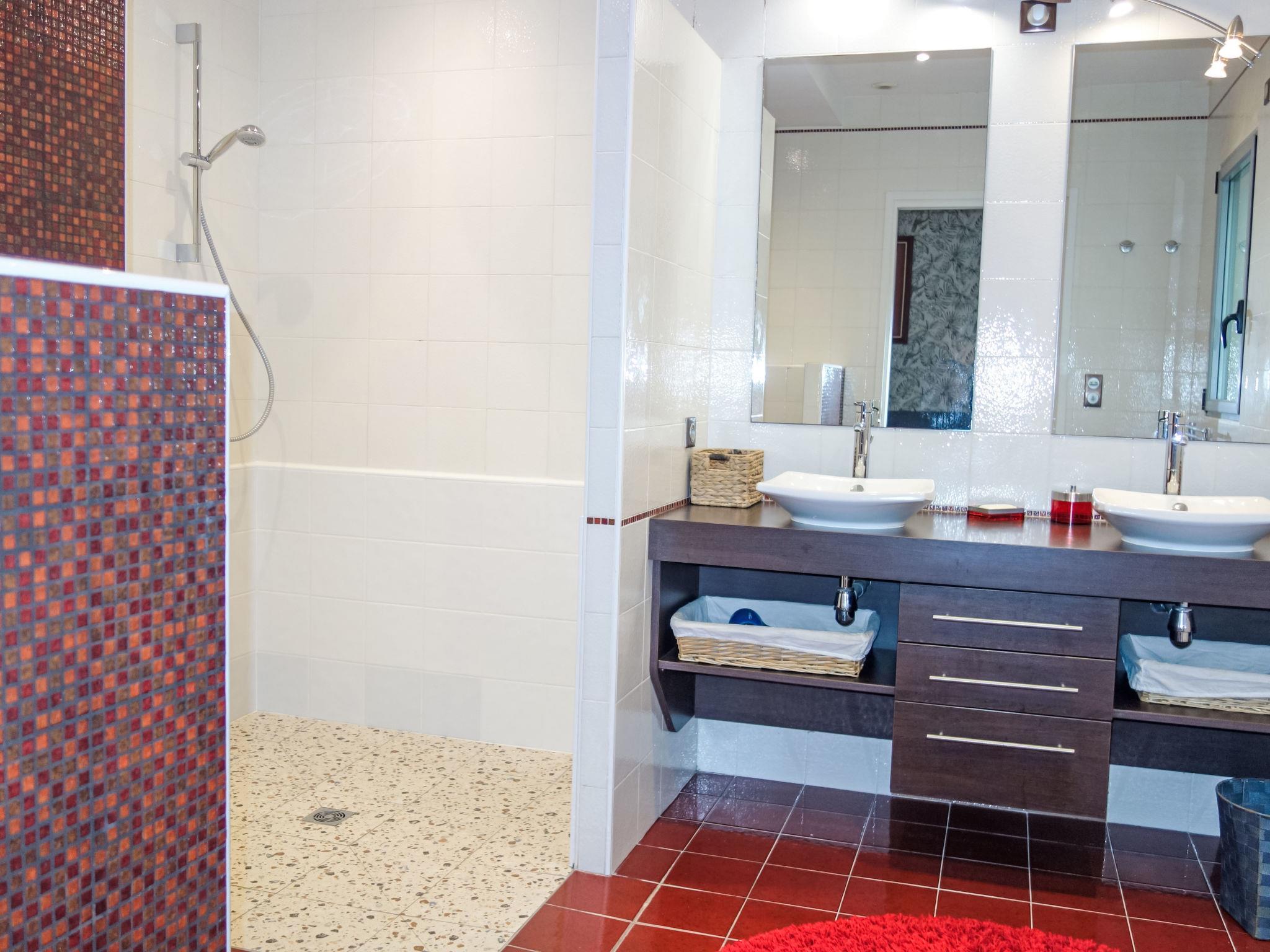 6-room villa 200 m2 on 2 levels, south-west facing position. Comfortable and beautiful furnishings: living room with dining nook and TV (flat screen). Exit to the terrace. 1 room with 1 french bed, bidet and shower. Exit to the terrace. 1 room with 1 french bed and shower. Open kitchen (oven, dishwasher, 4 induction hot plates, toaster, kettle, microwave, freezer, electric coffee machine, Capsules for coffee machine (senseo) extra). Exit to the terrace. 2 sep. WC's. Air-conditioning. Upper floor: 2 rooms, each room with 1 french bed and air conditioning. Exit to the balcony. Shower, sep. WC. Facilities: washing machine, dryer, iron, hair dryer. Internet (WiFi, free). Please note: smoke alarm.