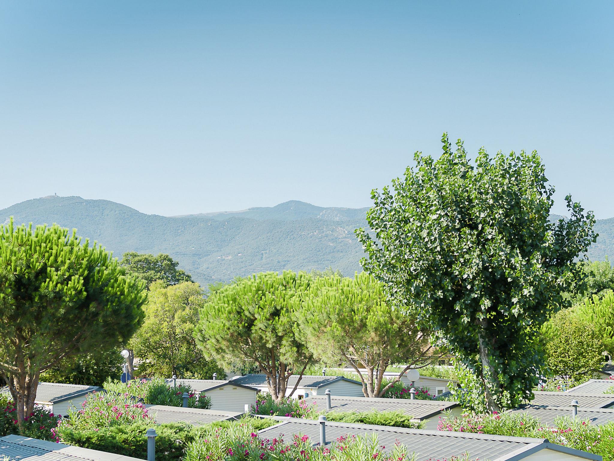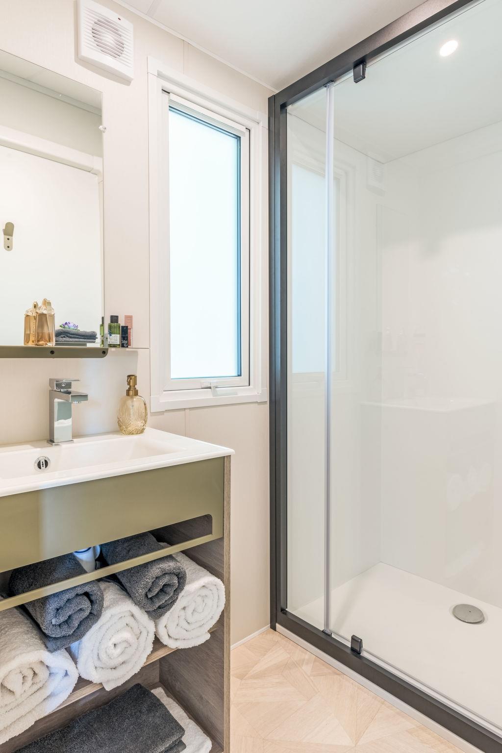 "Camping La Page", 3-room mobile home 28 m2. Practical furnishings: living/dining room with dining table and TV (flat screen). Exit to the terrace. 1 room with 1 french bed (160 cm, length 200 cm). 1 room with 2 beds (80 cm, length 190 cm). Kitchenette (4 hot plates, oven, microwave, freezer, electric coffee machine). Shower, sep. WC. Air-conditioning, forced-air heating. Terrace partly roofed. Terrace furniture, deck chairs (2). Facilities: children's high chair, baby cot for up to 2 year olds (extra). Internet (WiFi, extra). Please note: maximum 1 pet/ dog allowed. Smoke alarm.