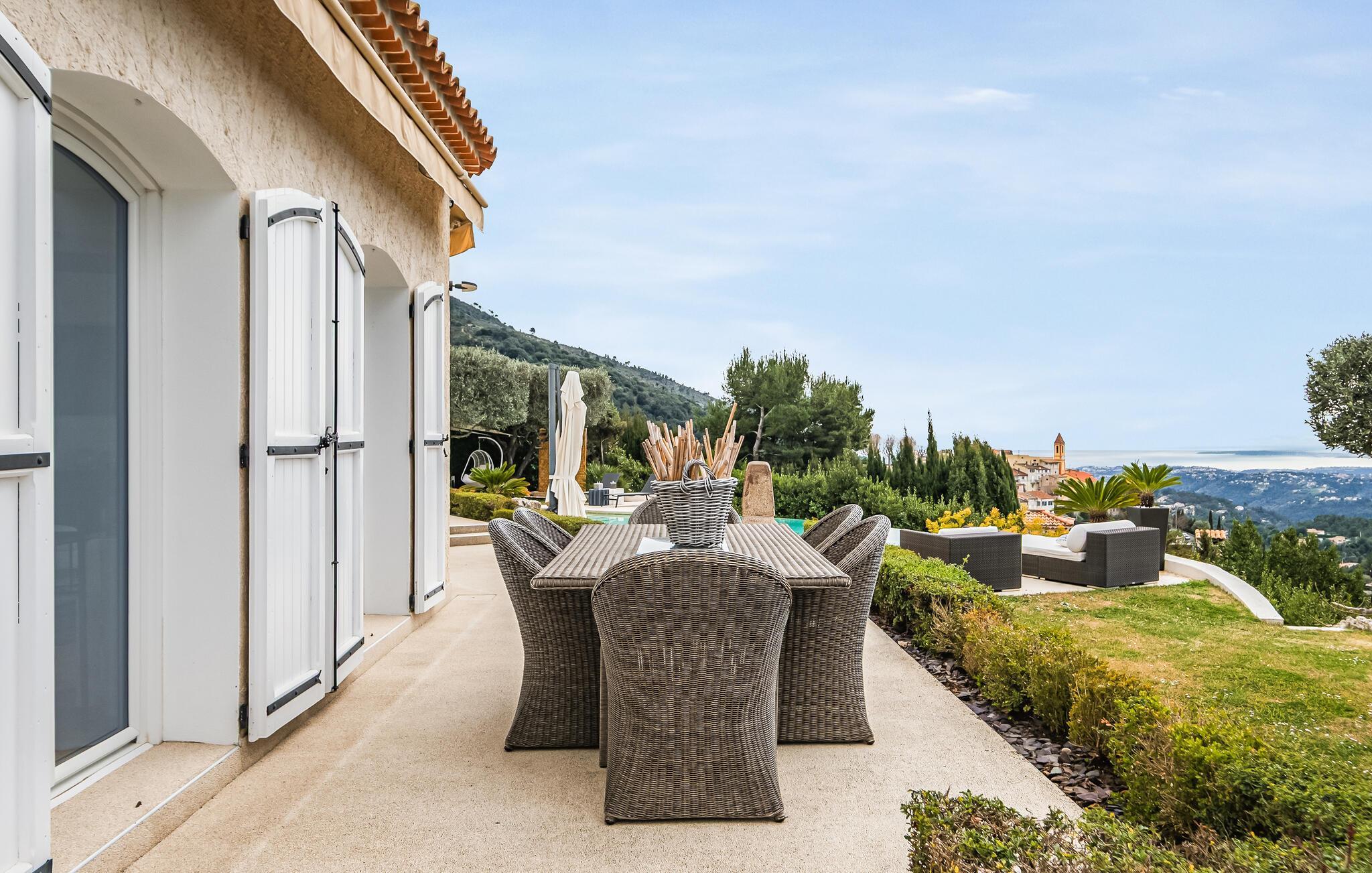 Den vidsträckta tomten, som pryds av medelhavsväxter, erbjuder också en lockande panoramautsikt. Du kan svalka dig i infinitypoolen, njuta av avkopplande siestor i skuggan av olivträden, tända grillen och tillaga läckra måltider i det täckta sommarköket.
