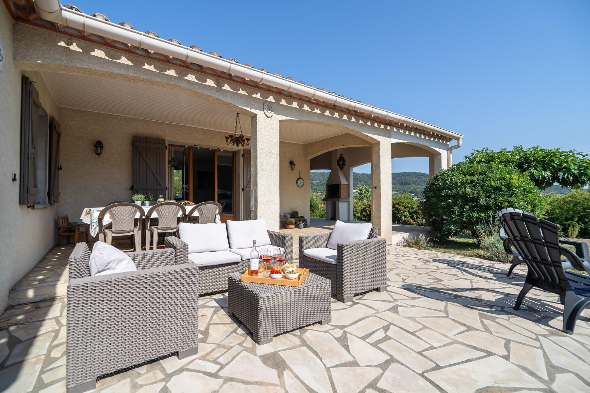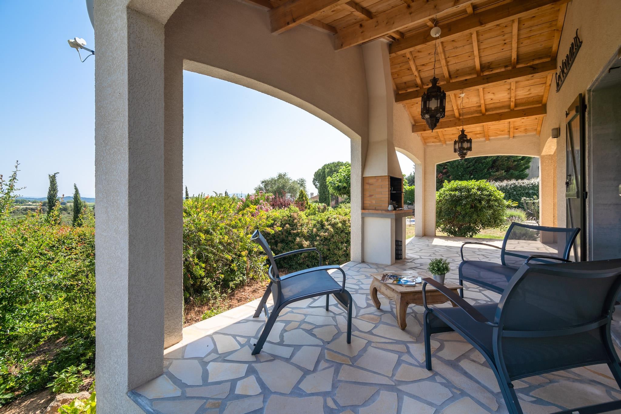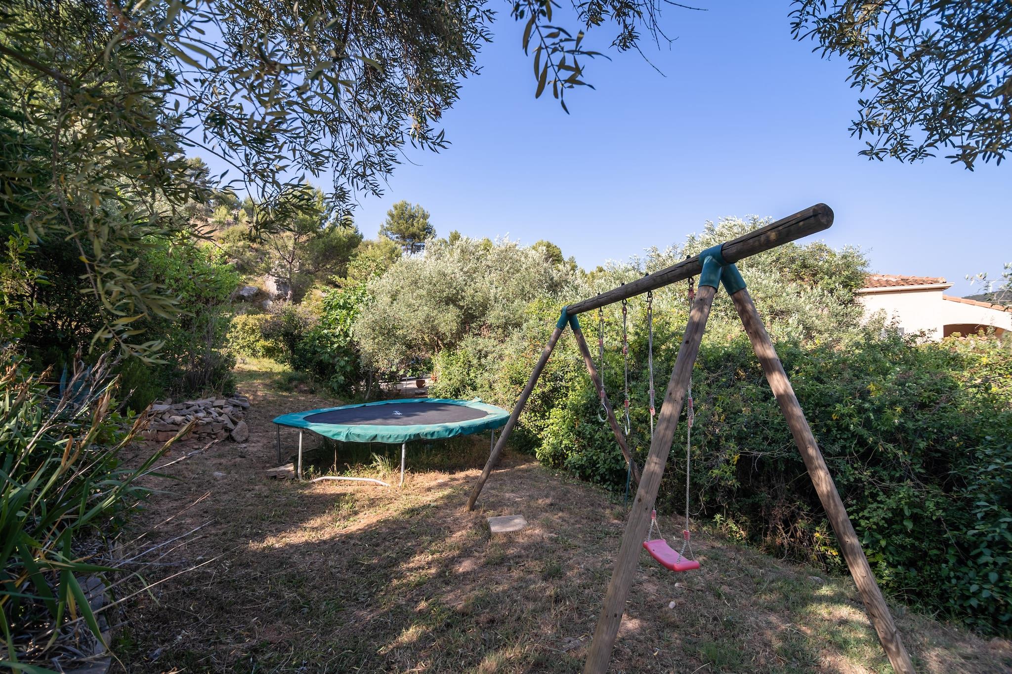 Bottenvåningen: (Vardagsrum(TV, Braskamin, stereo), Matsal(matbord), öppet kök(Kokplattor, kaffebryggare, kombi ugn/mikro, diskmaskin, kyl och frys), sovrum(våningssäng), sovrum(2x enkelsäng(80 x 200 cm)), sovrum(2x enkelsäng(80 x 200 cm)), badrum(badkar, dusch, handfat, toalett ), badrum(dusch, handfat, toalett ), grovkök(tvättmaskin)) Bubble bath, fransk balkong, luftkonditionering, terrass, trädgård(privat, 2500 m2), trädgårdsmöbler, parkering, studsmatta, swimmingpool(privat, uppvärmd, 8 x 4 m., opened from Apr upto and including Oct), lekplats, loungemöbel