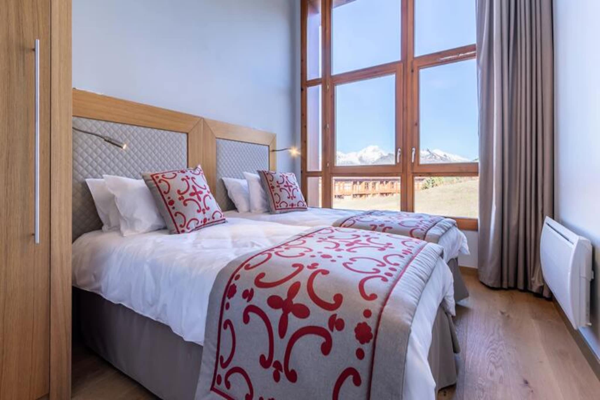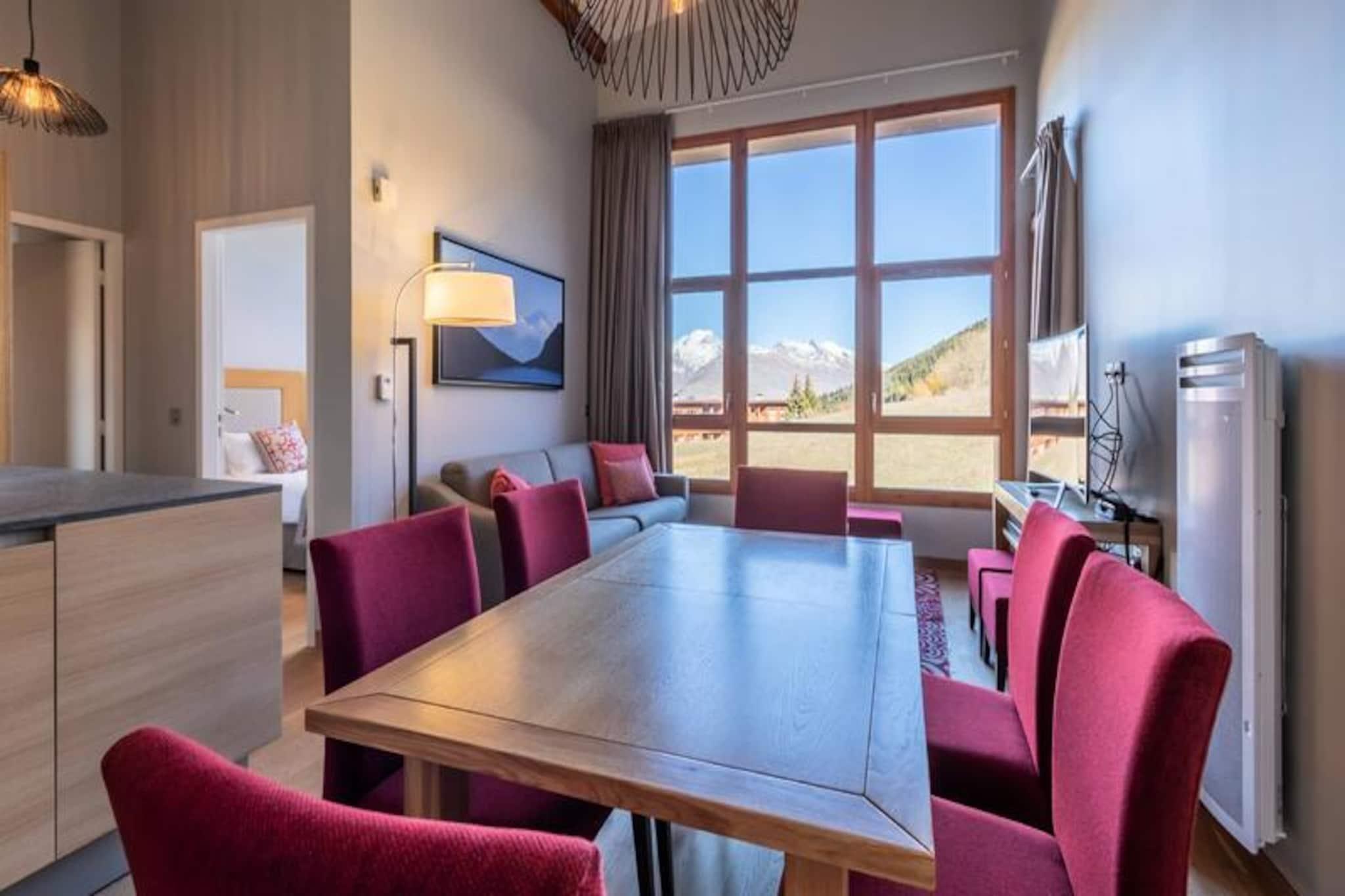 Högt ovanför den pulserande Arc 1800 erbjuder detta lyxiga 4-stjärniga residens, Les Monarques, en sömlös blandning av modern komfort och alpin charm. Med hisnande utsikt över Mont Blanc från din balkong i norrläge är denna 73 m² stora lägenhet en fristad för bergsentusiaster. Oavsett om du åker skidor direkt på Paradiskis backar i världsklass eller spelar tee på den närliggande golfbanan på sommaren, genomsyras varje ögonblick här av Alpernas magi. Residenset erbjuder exklusiv tillgång till ett spa, en pool och ett gym, vilket garanterar avkoppling och föryngring efter en dag av äventyr. Inuti är lägenheten omsorgsfullt utformad för upp till sex gäster. Vardagsrummet med öppen planlösning har en mysig soffa och fåtölj, medan det fullt utrustade köket inkluderar diskmaskin, Nespressomaskin med mera. Tre eleganta sovrum erbjuder vilsamma avkopplingar, inklusive en master suite med eget badrum. Ytterligare bekvämligheter som Wi-Fi, ett Bose Hi-Fi-system och ett skidskåp förbättrar din vistelse, medan hotellliknande tjänster som bäddade sängar vid ankomst och slutstädning ökar bekvämligheten. Bara några minuter bort erbjuder Edenarc tillgång till Nama Springs Spa, gourmetmat på Voga Goga och Dahu-linbanan som förbinder dig till ortens centrum på under tre minuter. En gratis transferservice gör det enkelt att utforska Arc 1800-talets butiker, restauranger och livliga afterski-scen. På sommaren kan du upptäcka skönheten i Vanoise nationalpark med dess vandringsleder och djurliv. Oavsett om du söker spännande backar eller lugna bergsvyer är Les Monarques din port till oförglömliga alpina upplevelser.