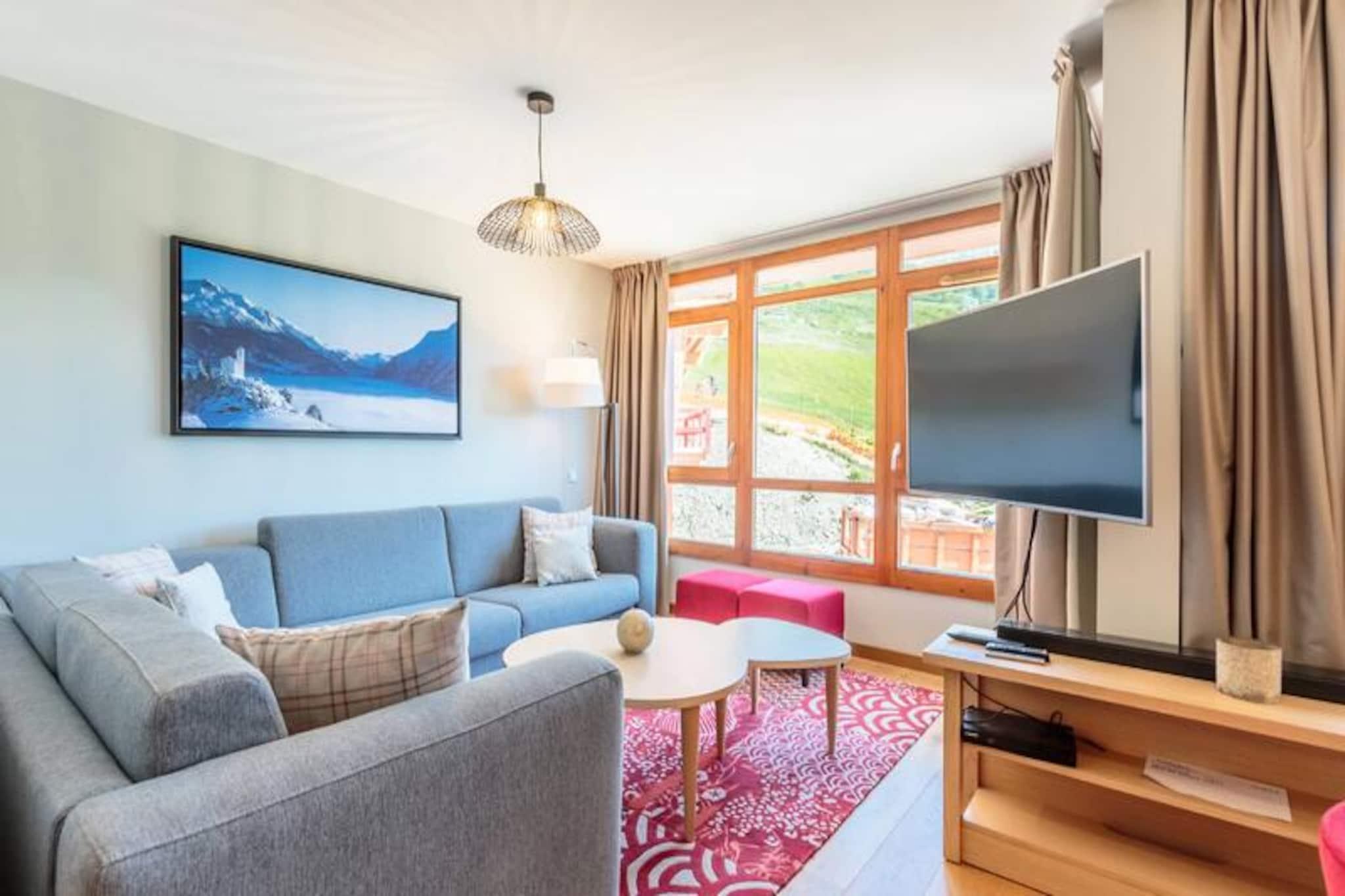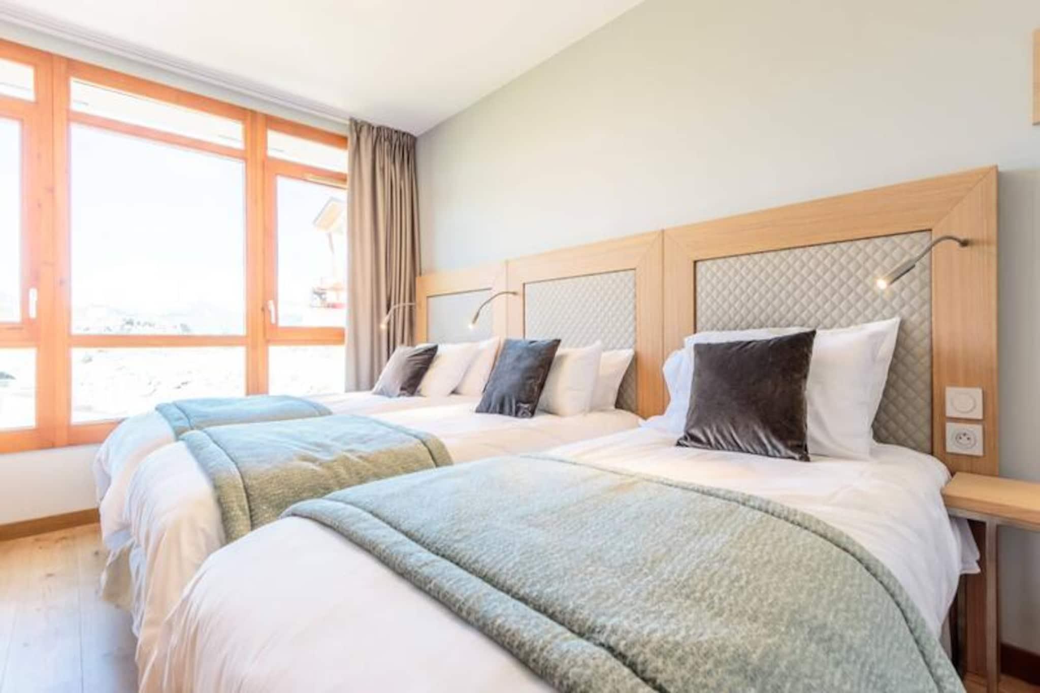 Belägen på de fridfulla höjderna i Arc 1800 erbjuder denna lyxiga 4-rumslägenhet i det prestigefyllda Les Monarques-residenset en oöverträffad alpin reträtt. Med hisnande utsikt över Tarentaisedalen och direkt tillgång till ski-in/ski-out är det den perfekta basen för att utforska det världsberömda Paradiski-området. Oavsett om du är här för vinterns puderiga backar eller sommarens frodiga golfbanor, erbjuder denna fastighet en sömlös blandning av komfort och äventyr. \n\nLägenheten är 86 kvadratmeter stor och rymmer upp till sju gäster med tre elegant designade sovrum, inklusive en master suite med eget badrum med dusch och toalett. Vardagsrummet med öppen planlösning har en mysig hörnsoffa, platt-TV och en balkong i söderläge som inbjuder dig att njuta av bergsutsikten. Det fullt utrustade köket, komplett med Nespressomaskin, ugn och diskmaskin, gör det till ett nöje att äta på plats. Ytterligare bekvämligheter inkluderar höghastighets-Wi-Fi, ett Bose Hi-Fi-system, tvättmaskin och torktumlare, vilket garanterar en vistelse lika bekväm som den är lyxig. \n\nUtanför lägenheten kan du njuta av residensens förstklassiga faciliteter, inklusive en uppvärmd pool, spa med hamam och bastu samt ett gym. Bara några steg bort hittar du Nama Springs Spa, gourmetbutiker och Dahu-linbanan, som tar dig till ortens centrum på några minuter. På sommaren lockar den närliggande golfbanan och vandringslederna, medan vintern förvandlar området till ett skidparadis med 425 km backar precis utanför dörren. \n\nOavsett om du söker avkoppling eller äventyr, erbjuder denna lägenhet den ultimata bergsflykten, som kombinerar modern lyx med den tidlösa charmen i de franska Alperna.