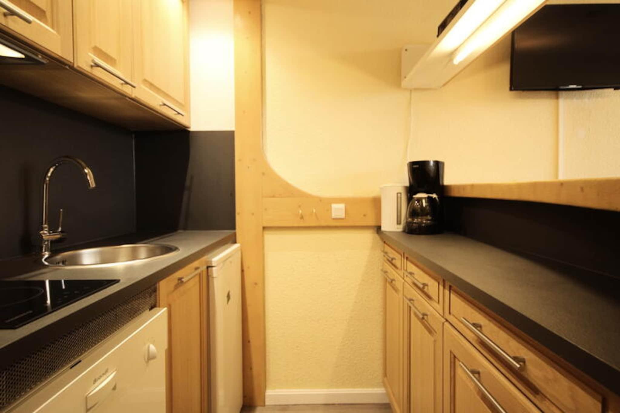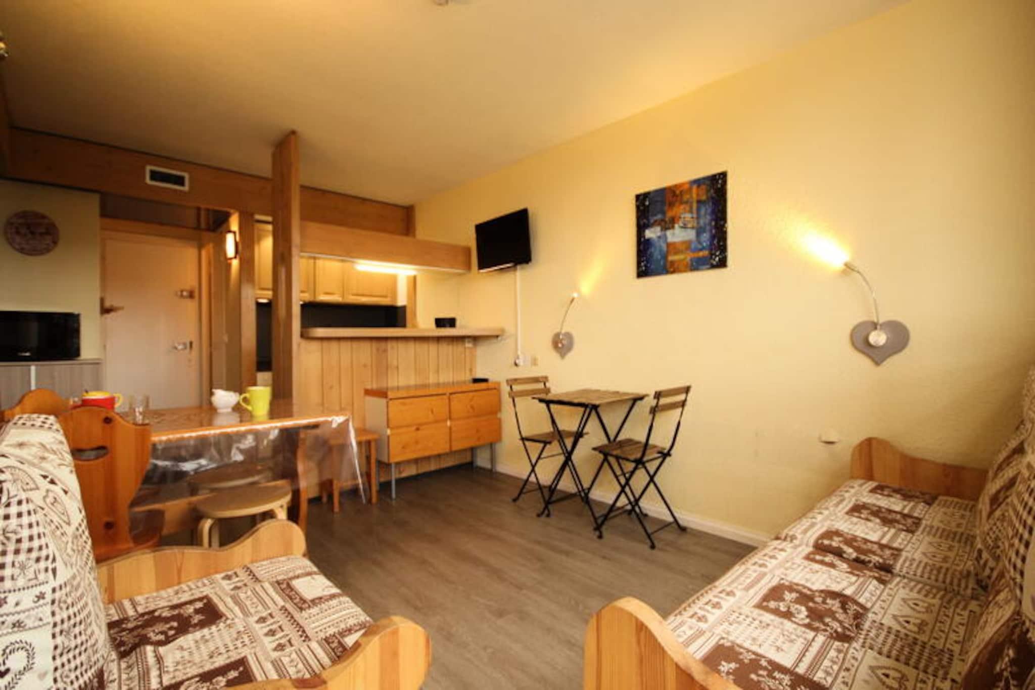 Högt ovanför den livliga Village des Villards i Les Arcs 1800 erbjuder denna charmiga lägenhet en mysig alpin tillflyktsort med oöverträffad tillgång till både backarna och lokala bekvämligheter. Tänk dig att vakna upp till de gyllene nyanserna av en soluppgång i dalen eller den friska bergsluften när du kliver ut på din sydvästvända balkong, där den hisnande utsikten över Tarentaisedalen vecklas ut framför dig. Oavsett om du är här för vintersport eller sommaräventyr, placerar denna bostad dig i hjärtat av allt. Lägenheten på 33 m² är designad för komfort och bekvämlighet och rymmer upp till fem gäster. Vardagsrummet har en bekväm bäddsoffa, en matplats och en platt-TV, perfekt för avkoppling efter en dag med aktiviteter. Ett privat sovrum har tre enkelsängar, varav två är våningssängar, vilket gör det idealiskt för familjer eller små grupper. Det moderna köket, öppet mot vardagsrummet, är utrustat med allt du behöver, från keramikhällar till diskmaskin, vilket gör hemlagade måltider till en barnlek. Ytterligare bekvämligheter som tvättmaskin och skovärmare gör din vistelse ännu enklare. Kliv ut, så befinner du dig vid foten av backarna, med skidliftar och spår bara några minuter bort. Boendet är bekvämt beläget ovanför köpcentret och erbjuder enkel tillgång till restauranger, butiker och afterski-underhållning. På sommaren förvandlas området till en fristad för vandrare och mountainbikecyklister, med stigar som slingrar sig genom frodiga alpina landskap. Oavsett om du jagar puderiga backar eller fridfulla bergsvyer, är den här lägenheten din port till oförglömliga stunder i de franska Alperna. Med miljövänliga sängkläder och valfri slutstädning lovar din vistelse att bli lika smidig som den är minnesvärd.
