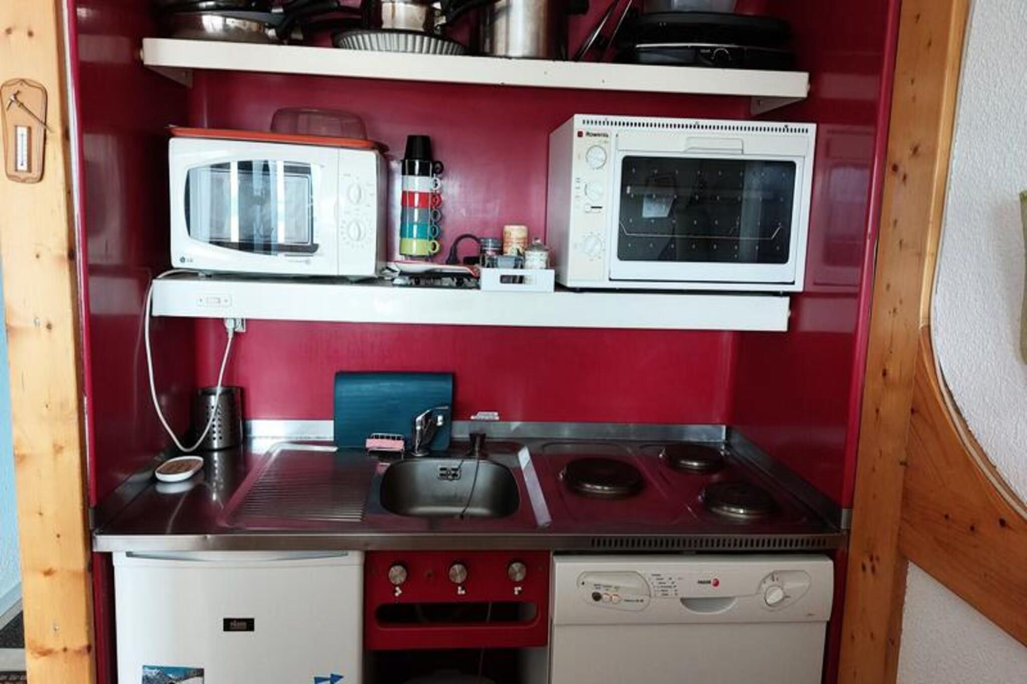Högt ovanför Tarentaise-dalen, där den alpina luften är uppfriskande och backarna lockar, ligger din perfekta bergsreträtt i Tournavelles Residences. Med ski-in/ski-out-tillgång ligger denna mysiga lägenhet bara några steg från Vagère-stolliften och Transarc-gondolen, vilket garanterar smidig tillgång till det världsberömda Paradiski-området. Oavsett om du carvar genom nysnö eller utforskar sommarstigar erbjuder denna plats en oöverträffad port till det bästa av Les Arcs 1800. Inuti är den 33 m² stora lägenheten genomtänkt utformad för att rymma upp till fem gäster. Vardagsrummet har två bekväma enkelsängar, medan sovrummet har en unik uppsättning med tre våningssängar, perfekt för familjer eller nära grupper. Den västvända balkongen inbjuder till avkoppling med fantastisk utsikt över orten och dalen, en perfekt bakgrund för din morgonkaffe eller kvällsavkoppling. Det fullt utrustade köket, komplett med elektrisk spis, ugn, diskmaskin och mycket mer, gör matlagningen både bekväm och njutbar. Moderna bekvämligheter som Wi-Fi och en platt-TV bidrar till en bekväm vistelse. Gå ut och du hittar allt du behöver inom gångavstånd. Från ESF-skidskolan och en närbutik vid foten av bostaden till det livliga shoppingcentret Villards med sina barer och nattklubbar, är området fullt av aktivitet. På vintern tar den gratis bussbussen dig till den större orten var 20:e minut, medan sommaren erbjuder möjligheter till vandring, mountainbike och paragliding över det fantastiska alpina landskapet. Oavsett om du söker spännande äventyr eller lugna stunder omgiven av hisnande vyer, lovar denna lägenhet i hjärtat av Les Arcs 1800 en oförglömlig semester. Boka din vistelse och låt bergens magi förtrolla dig.