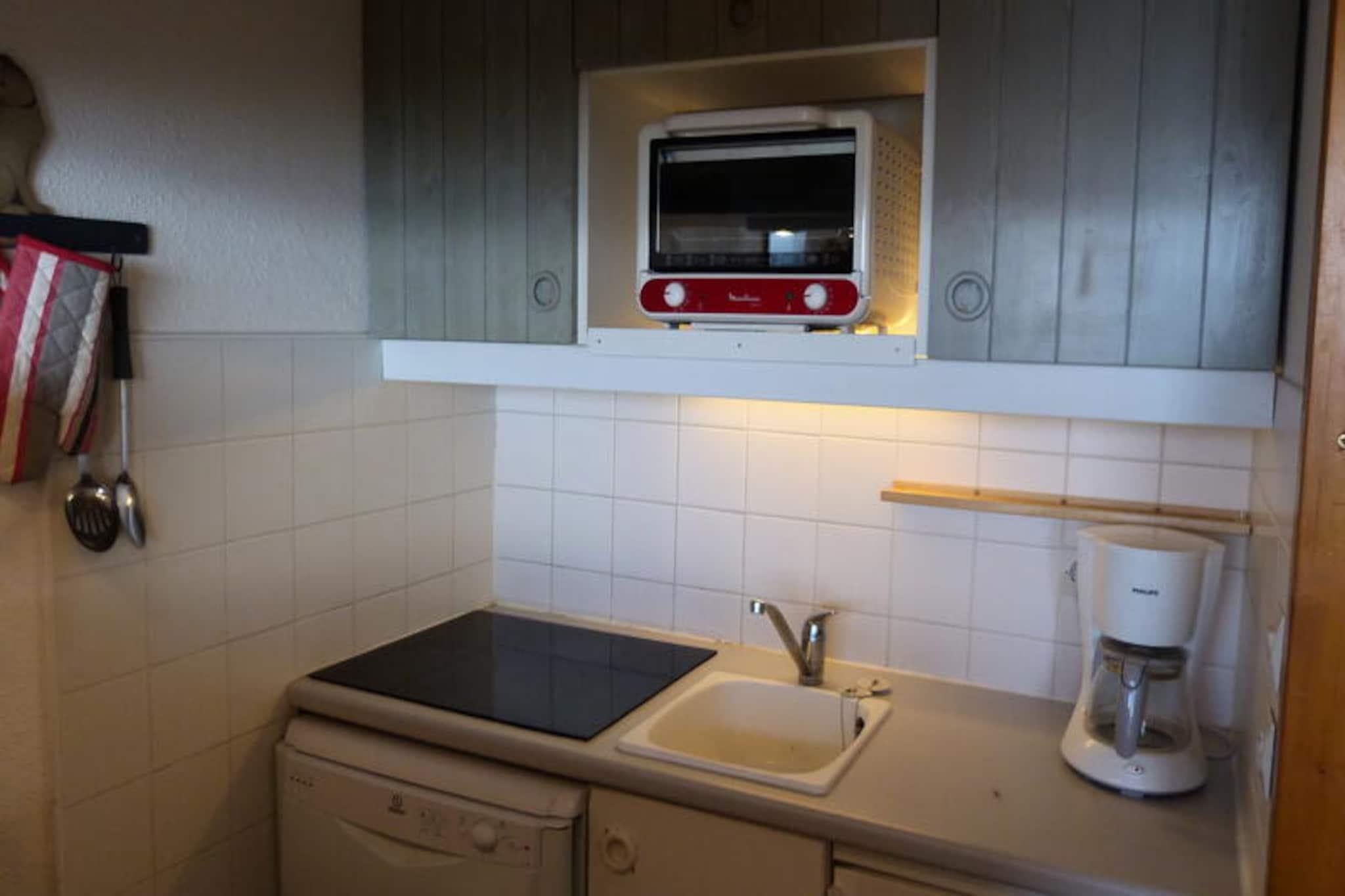 Högt ovanför den pittoreska Tarentaisedalen erbjuder denna mysiga lägenhet i Ruitor Residence en lugn tillflyktsort med hisnande utsikt över de omgivande bergen och dalen. Oavsett om du planerar ett vinterskidaventyr eller en sommarresa, är denna charmiga enrumslägenhet perfekt belägen för att få ut det mesta av din vistelse i Les Arcs 1800. Balkongen i västerläge inbjuder dig att varva ner med en panoramautsikt över solnedgången efter en dag av alpin utforskning. Det omsorgsfullt utformade 30 m² stora utrymmet rymmer bekvämt upp till fyra gäster. Vardagsrummet har en utdragbar bäddsoffa, medan det separata sovrummet erbjuder två enkelsängar för vilsamma nätter. Köket med öppen planlösning är fullt utrustat med moderna apparater, inklusive diskmaskin, ugn och mikrovågsugn, vilket gör det enkelt att laga mat att njuta av i ditt bekväma hem hemifrån. Ytterligare bekvämligheter som TV, tvättmaskin och skidförvaring garanterar bekvämlighet under hela din vistelse. Residenset ligger bara 70 meter från den blå backen "Charmettoger" och 100 meter från stolsliften "Jardin Alpin", och erbjuder enkel tillgång till backarna. På sommaren förvandlas utomhuspoolen på översta våningen till en fridfull oas under alpsolen. Gratisbussar, som går regelbundet, förbinder dig med den närliggande byn Villards, där du hittar en stormarknad, skidskola och andra viktiga tjänster. Turistbyrån och vårdcentralen ligger också inom gångavstånd eller en kort bussresa. Oavsett om du dras av spänningen med skidåkning, skönheten i bergslederna eller charmen i alpina byar, erbjuder denna lägenhet en perfekt blandning av komfort och bekvämlighet. Med sin husdjursvänliga policy och valfria täckta parkering är det ett perfekt val för familjer, par eller små grupper som söker en oförglömlig bergssemester.