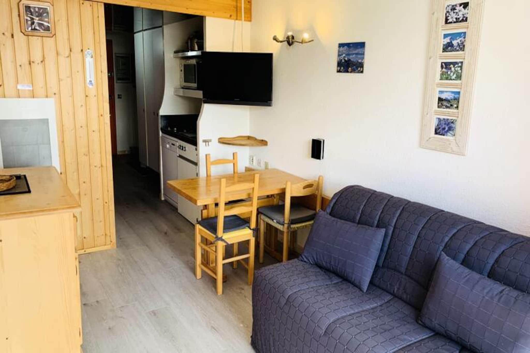 Högt ovanför Tarentaisedalen, där den alpina luften är frisk och uppfriskande, erbjuder denna mysiga studio i Arc 2000 en plats på första parkett med utsikt över de majestätiska sluttningarna i de franska Alperna. Med sin balkong i söderläge vaknar du upp till hisnande utsikter över snötäckta toppar och livliga skidbackar, vilket skapar den perfekta tonen för en dag av äventyr. Inbäddat i hjärtat av skidorten, placerar denna residens dig bara några steg från backarna och det livliga Place Olympique, vilket garanterar bekvämlighet och spänning nära till hands. Kompakt men ändå omsorgsfullt designad, rymmer den 22 m² stora studion bekvämt upp till tre gäster. Vardagsrummet har en mjuk bäddsoffa för två, medan entréhallen erbjuder en enkelsäng, vilket gör den till en idealisk tillflyktsort för par eller små familjer. Pentryt, utrustat med moderna apparater inklusive mikrovågsugn, ugn och diskmaskin, låter dig laga rejäla måltider efter en dag i backarna. Badrummet, komplett med badkar, erbjuder en avkopplande plats att varva ner. En platt-TV ger en touch av modern komfort till din vistelse. Bortom lägenheten är Arc 2000 ett paradis för skidåkare. Från snöns terräng når du pister i världsklass på några ögonblick. Den närliggande parkeringen vid Lac des Combes och en mängd olika butiker och restauranger gör din vistelse ännu mer smidig. Oavsett om du är här för spännande vintersport eller bergens fridfulla skönhet, erbjuder denna studio en perfekt bas för din alpina flykt. Upplev charmen i Arc 2000, där varje ögonblick inramas av de franska Alpernas fantastiska bakgrund. Oavsett om du snubblar genom färskt puder eller smuttar på varm choklad på din balkong, garanterar denna bostad minnen för livet.