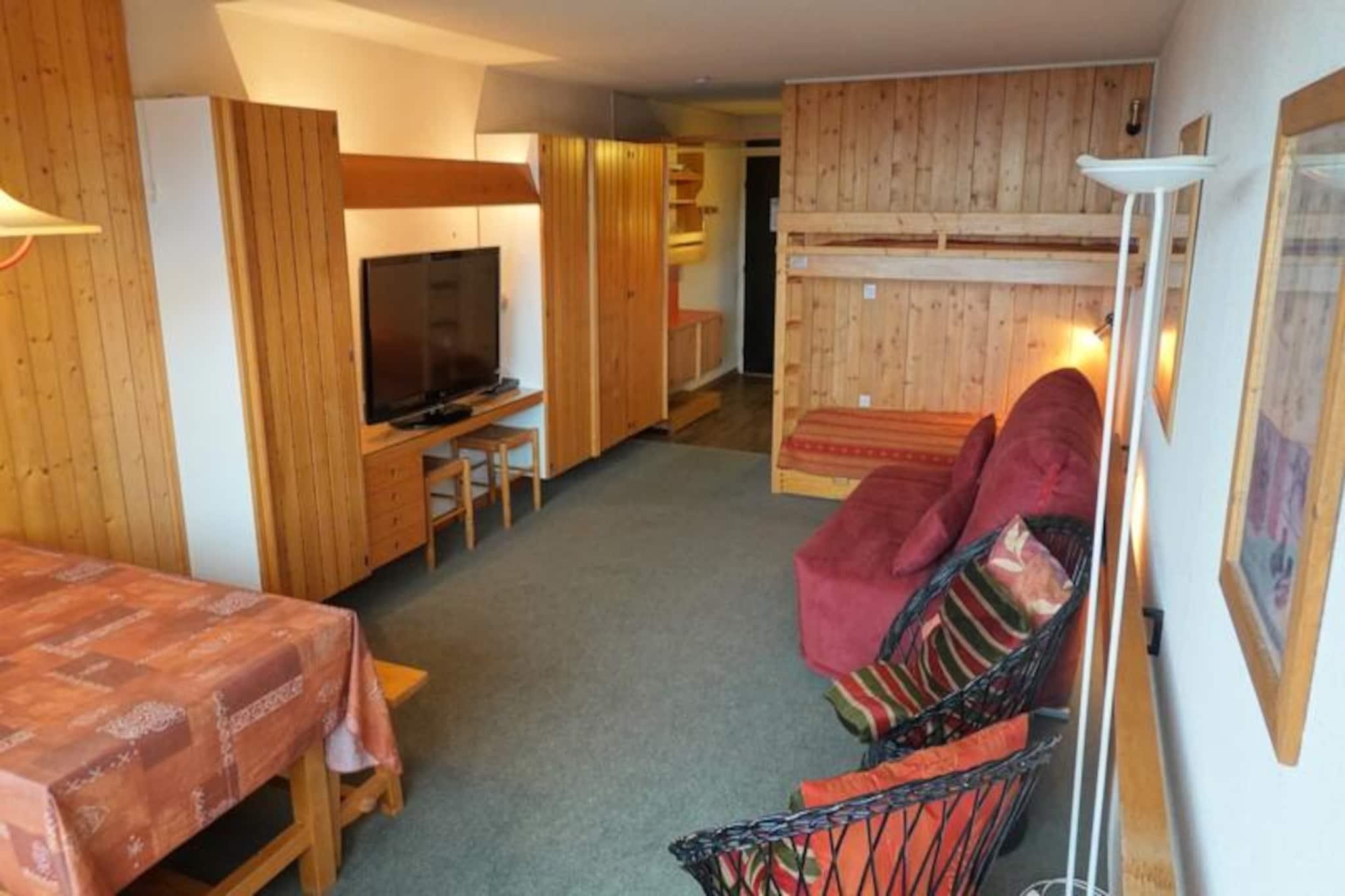 Högt ovanför Tarentaisedalen erbjuder denna charmiga studio i Arc 1600 en fridfull tillflyktsort med hisnande utsikt över de omgivande bergen. Oavsett om du planerar ett vinterskidaventyr eller en sommarresa till Alperna, erbjuder denna bostad den perfekta balansen mellan lugn och bekvämlighet. Tänk dig att smutta på ditt morgonkaffe på den sydvästvända balkongen, njuta av dalens gyllene nyanser nedanför och sedan gå ut till backarna bara 50 meter bort för en dag med alpin utforskning. Det lugna läget garanterar vilsamma kvällar, medan semesterortens centrum och butikerna ligger bara 5 minuters promenad bort, vilket gör det enkelt att njuta av lokala restauranger och underhållning. \n\nStudioen på 28 m² är designad för att bekvämt rymma upp till fyra gäster och är omsorgsfullt inredd med ett mysigt vardagsrum med en bäddsoffa och två våningssängar. Köket är fullt utrustat med moderna apparater, inklusive elektrisk spishäll, ugn, mikrovågsugn, diskmaskin och kylskåp, så att du kan laga rejäla måltider efter en dag av äventyr. Badrummet, komplett med badkar och separat toalett, bidrar till bekvämligheten, medan bekvämligheter som Wi-Fi, TV och tvättmaskin garanterar en bekväm vistelse. Ett separat skidskåp finns också tillgängligt, vilket gör det enkelt att förvara din utrustning efter en dag i backarna. Arc 1600 är en inkörsport till det berömda skidområdet Paradiski, som erbjuder oändliga möjligheter till skidåkning, snowboardåkning och vandring. På sommaren förvandlas regionen till en fristad för friluftsentusiaster, med stigar som leder till fantastiska vyer och alpina ängar. Det närliggande skidortens centrum surrar av aktivitet, från mysiga kaféer till livliga afterski-platser, vilket säkerställer att du har allt du behöver inom räckhåll. Oavsett om du är här för att åka i färskt puder eller njuta av bergens skönhet, är denna studio din ideala bas för en oförglömlig alpin semester.