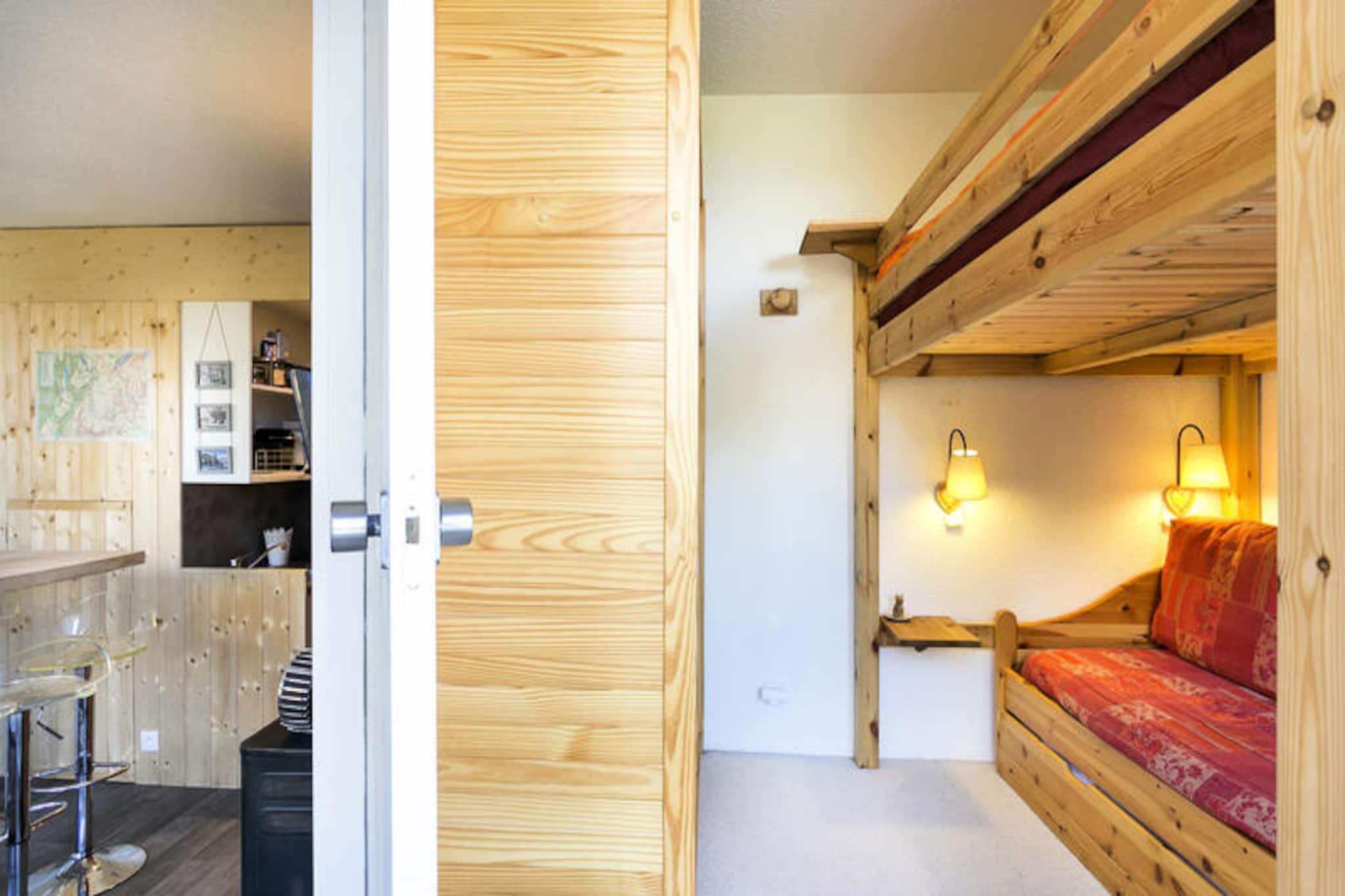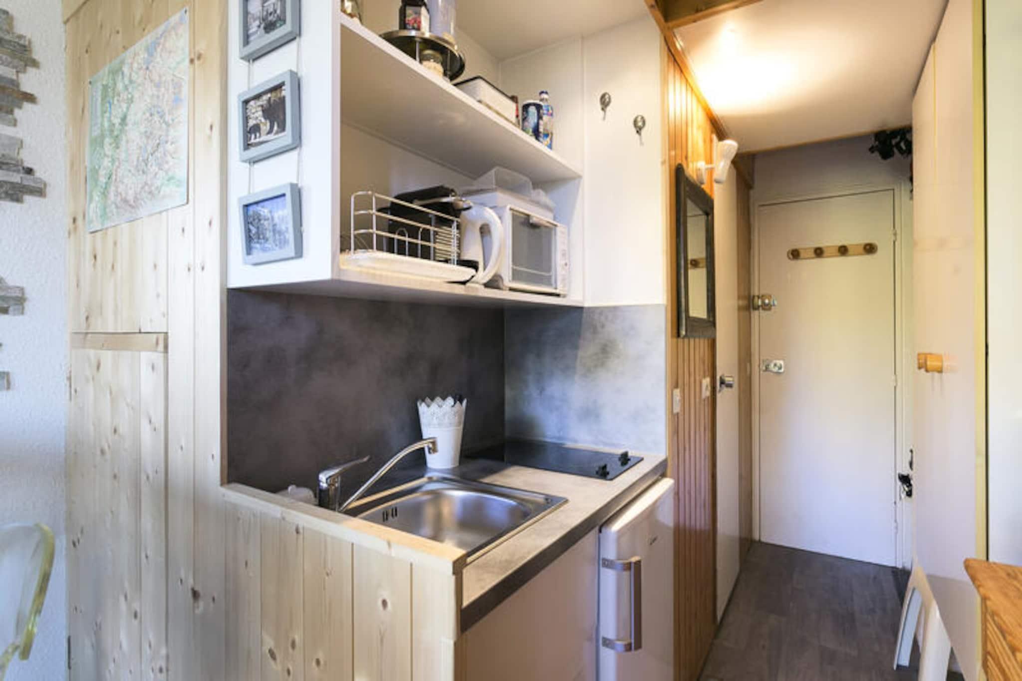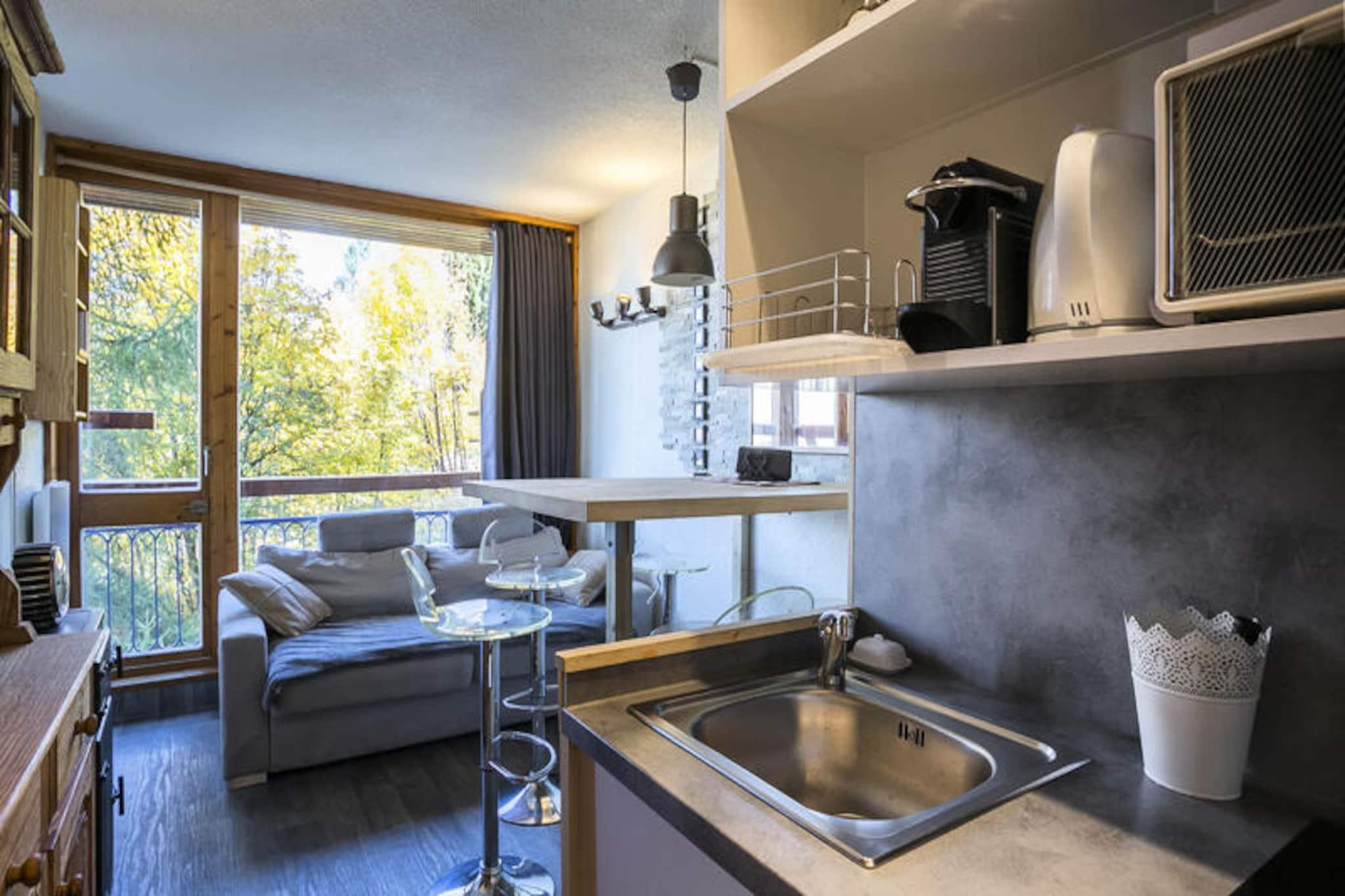 Högt ovanför Villards livliga gator erbjuder denna charmiga lägenhet en mysig tillflyktsort med fantastisk utsikt över de omgivande granarna och de majestätiska bergen. Oavsett om du söker en lugn tillflyktsort eller ett aktivt alpint äventyr, placerar denna residens dig i hjärtat av Les Arcs 1800, där byns pulserande energi möter naturens fridfulla skönhet. Tänk dig att vakna upp till den friska bergsluften och det milda glödet från morgonsolen som silar genom träden, redo att omfamna en dag fylld av utforskning och avkoppling. \n\nDenna omsorgsfullt renoverade tvårumslägenhet rymmer upp till fyra gäster, vilket gör den idealisk för par eller små familjer. Vardagsrummet har en bekväm soffa och en platt-TV, perfekt för att varva ner efter en dag med skidåkning eller vandring. Sovrummet har en mezzaninsäng med dubbelsäng, en bäddsoffa och en utdragssäng, vilket ger flexibla sovarrangemang för alla. Det kompakta men välutrustade köket har keramikhäll, miniugn, kylskåp, mikrovågsugn, brödrost, kaffebryggare och vattenkokare, vilket säkerställer att du har allt som behövs för att laga rejäla måltider. Laminatgolvet och heltäckningsmattan ger utrymmet en varm touch, medan balkongen i norrläge inbjuder dig att njuta av den hisnande utsikten.\n\nBekvämt beläget nära butiker och parkeringsmöjligheter, erbjuder residensen även miljövänliga sängkläder och städtjänster mot en extra avgift. Med enkel tillgång till skidliftar, vandringsleder och buss mellan stationerna, kommer du att vara perfekt positionerad för att utforska underverken i Paradiski-området och bortom.\n\nOavsett om du dras till spänningen i backarna, byns charm eller bergens fridfulla lockelse, lovar denna lägenhet en oförglömlig alpin semester. Låt Les Arcs skönhet inspirera ditt nästa äventyr.