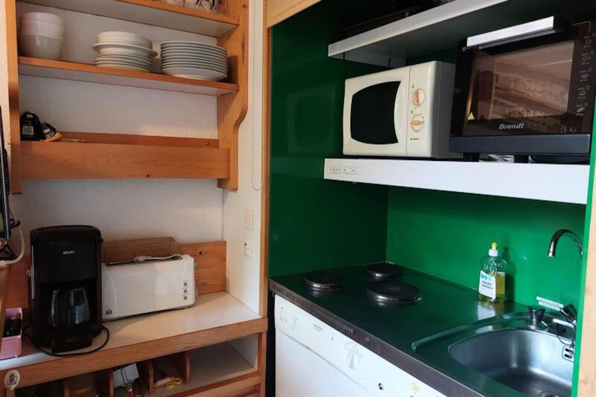 Omgiven av den fridfulla alpina charmen i byn Charmettoger, erbjuder denna mysiga duplexlägenhet i residenset Mirantin 3 en idyllisk tillflyktsort för din skidåkning eller sommaräventyr i Les Arcs 1800. Tänk dig att vakna upp till skogens mjuka prasslande, kliva ut på din sydvästvända balkong för att njuta av den fridfulla utsikten och känna den friska bergsluften stärka dina sinnen. Med den blå Charmettoger-backen bara 20 meter bort och Transarc-linbanan bara 50 meter från din dörr, är backarna praktiskt taget nära till hands. Denna omsorgsfullt designade lägenhet på 30 m² rymmer bekvämt upp till fyra gäster. Mezzaninvåningen har en dubbelsäng och en bäddsoffa, avskilda av ett draperi för extra avskildhet. Köket i öppen planlösning är fullt utrustat med moderna apparater, inklusive spishäll, ugn, mikrovågsugn, diskmaskin med mera, vilket gör det enkelt att laga rejäla måltider efter en dag av alpin utforskning. Koppla av i det mysiga vardagsrummet eller njut av en filmkväll med TV:n och DVD-spelaren som finns på övervåningen. Ett badrum med badkar och toalett garanterar din komfort, medan säker skidförvaring gör din vistelse ännu bekvämare. Boendet har ett perfekt läge för enkel tillgång till lokala bekvämligheter. En stormarknad ligger bara 200 meter bort, medan ESF-skidskolan och den livliga byn Villards ligger inom en kort 300 meters promenad. Gratis bussar går regelbundet och förbinder dig med turistbyrån, vårdinrättningar och andra viktiga platser. På sommaren förvandlas området till en fristad för vandrare och naturentusiaster, med stigar som slingrar sig genom hisnande alpina landskap. Oavsett om du vandrar genom orörda backar på vintern eller utforskar frodiga bergsleder på sommaren, erbjuder denna lägenhet den perfekta blandningen av komfort, bekvämlighet och naturlig skönhet. Skapa oförglömliga minnen i hjärtat av de franska Alperna.