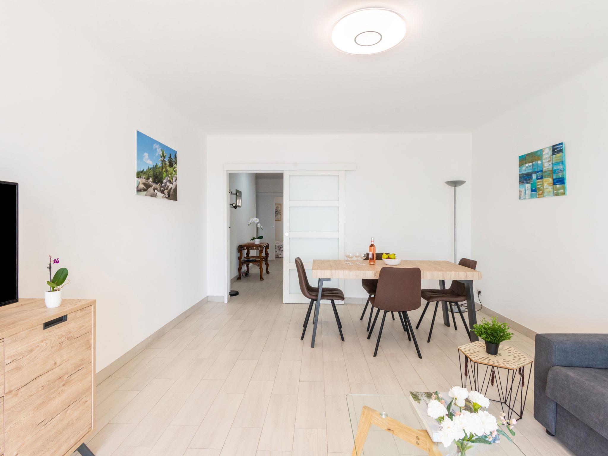 2-room apartment 57 m2 on 1st floor, south facing position. Comfortable and modern furnishings: large living/dining room 25 m2 with 1 sofabed (140 cm, length 190 cm), TV (flat screen), air conditioning. Exit to the terrace. 1 room with 1 french bed (1 x 160 cm, length 200 cm). Kitchen (oven, dishwasher, 3 induction hot plates, toaster, kettle, microwave, electric coffee machine). Shower, sep. WC. Heating. Terrace 10 m2, south facing position. Terrace furniture. Beautiful view of the sea. Facilities: washing machine, iron, hair dryer. Internet (WiFi, free). Please note: maximum 1 pet/ dog allowed. Smoke alarm. Offer by a private individual according to Art. 155, IV of CGI. 06027028004HT