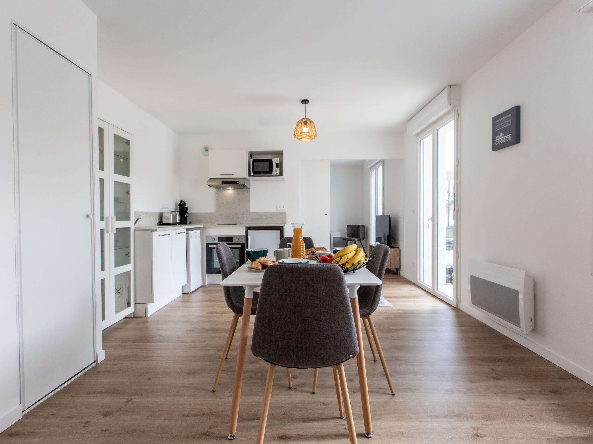 Capbreton: Apartment block "Cap Océan", 2 storeys, built in 2023. 17 apartments in the residence. In the resort, 150 m from the sea, 150 m from the beach. In the complex: washing machine, tumble dryer (for shared use). Public parking on the road. Shop 300 m, grocery 150 m, supermarket 1.8 km, restaurant 50 m, bakery 150 m, bicycle rental 100 m, bus stop "Capbreton Estacade" 300 m, sandy beach "Du Prévent" 150 m. Golf course (18 hole) 4 km, surf school 150 m, tennis 3 km, minigolf 200 m, riding stable 1 km. Nearby attractions: Seignosse 15 km, Bayonne 22 km, Dax 37 km, Biarritz 37 km. Well-known lakes can easily be reached: Réserve Naturelle des Marais d’Orx, Réserve Naturelle du courant d’Huchet.