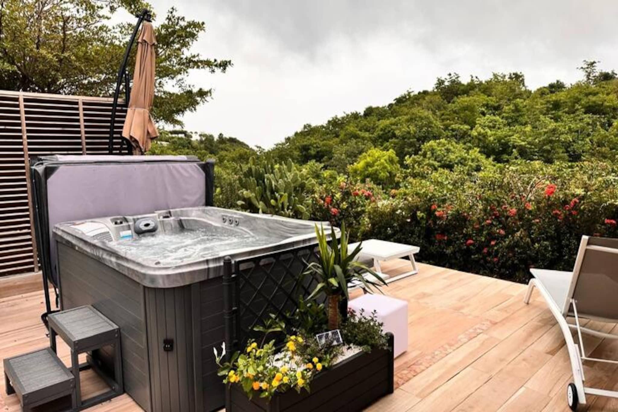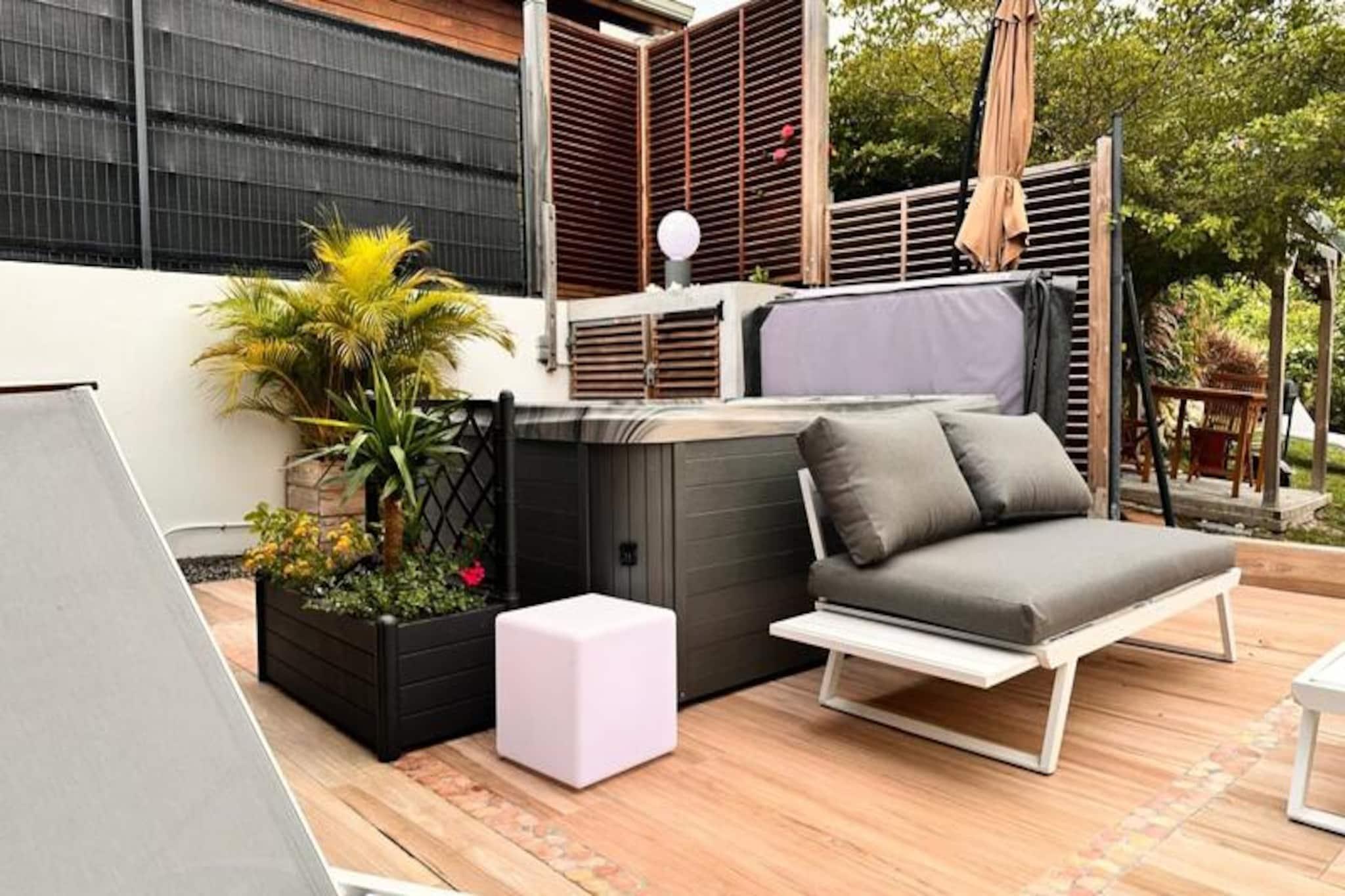 Belägen på Capesterres fridfulla höjder i Marie-Galante erbjuder Damien-bungalowen en lugn tillflyktsort fylld av karibisk charm och modern komfort. Denna eleganta tillflyktsort, som är en del av det nybyggda Estellan Residence, inbjuder dig att varva ner i frodiga omgivningar, med hisnande utsikt och naturens lugnande ljud som sätter tonen för din vistelse. Oavsett om du söker en romantisk semester eller en avkopplande familjesemester, lovar denna bungalow en oförglömlig upplevelse under Guadeloupes sol. \n\nBungalowen har ett ventilerat vardagsrum med bäddsoffa, smart-TV och ett fullt utrustat kök, perfekt för att enkelt laga mat. Sovrummet, komplett med en queen size-säng, luftkonditionering och myggnät, garanterar vilsamma nätter. Badrummet, som är direkt tillgängligt från sovrummet, bidrar till bekvämligheten. För extra lyx kan du kliva in i den privata jacuzzin för att smälta bort din stress. Moderna bekvämligheter som diskmaskin, tvättmaskin och Netflix säkerställer att din vistelse blir lika bekväm som den är avkopplande. För större grupper kan bungalowen kombineras med Villa Mélina och Bungalow Sonia för att rymma upp till 10 gäster. \n\nBara fem minuter från Grand-Bourg ligger hotellet med enkel tillgång till stormarknader, bagerier och lokala marknader. De orörda stränderna La Feuillère och Anse Canot ligger i närheten och erbjuder idylliska platser för bad och solbad. Naturentusiaster kommer att älska att utforska öns vandringsleder och sockerrörsfält, vilket bidrar till Marie-Galantes unika charm. \n\nMed luftkonditionering i varje rum, höghastighetsinternet och städservice i hotellkvalitet har varje detalj beaktats för att göra din vistelse smidig. Din dedikerade concierge välkomnar dig med en uppfriskande cocktail och hjälper dig med exklusiva tjänster som utflykter, biluthyrning och flygplatstransfer. Låt Guadeloupes magi omsluta dig i denna perfekta karibiska reträtt.