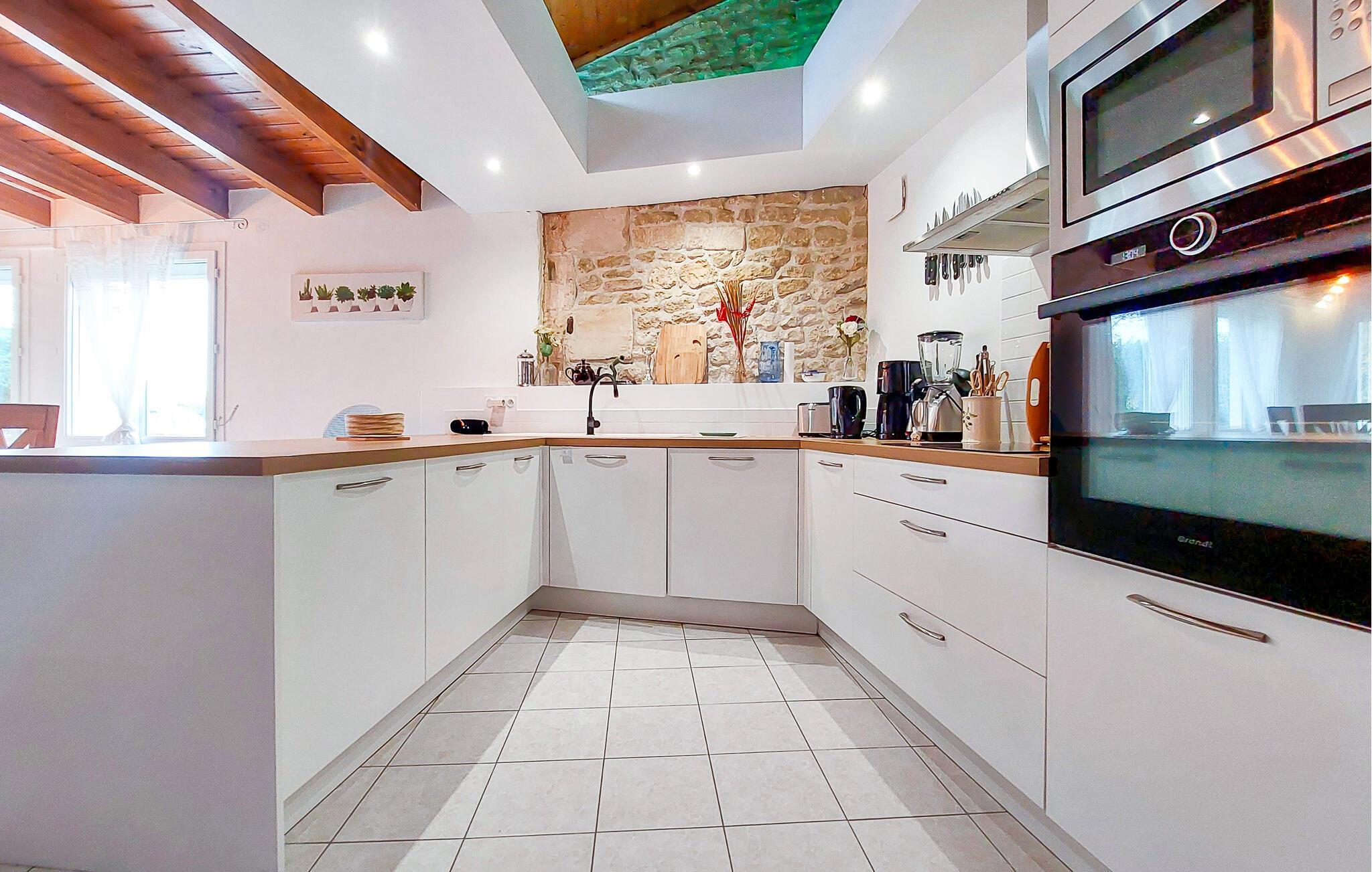 Omgivet av lugn, natur och charmiga vandringsleder, erbjuder detta rymliga semesterhus den perfekta miljön för en lyckad semester. Stig in i det rymliga vardagsrummet med sin imponerande stenvägg och höga träbjälkar. Gör dig bekväm i de mysiga sofforna framför den öppna spisen eller njut av en filmkväll i den eleganta atmosfären. Den ljusa matsalen med stora fönster skapar en vänlig atmosfär och köket med öppen planlösning inbjuder till att laga regionala delikatesser. På övervåningen finns ytterligare ett rum med biljardbord och bordsfotboll, perfekt för skoj och umgänge.