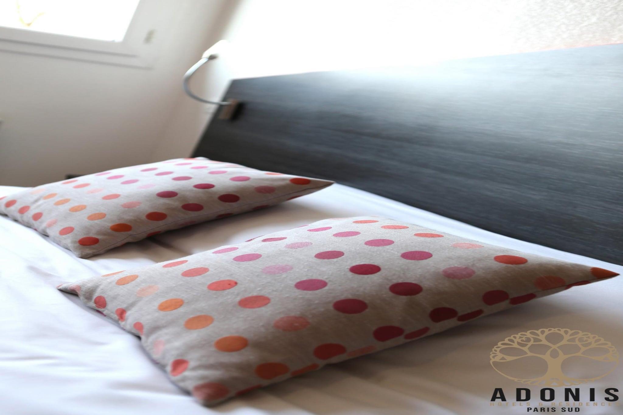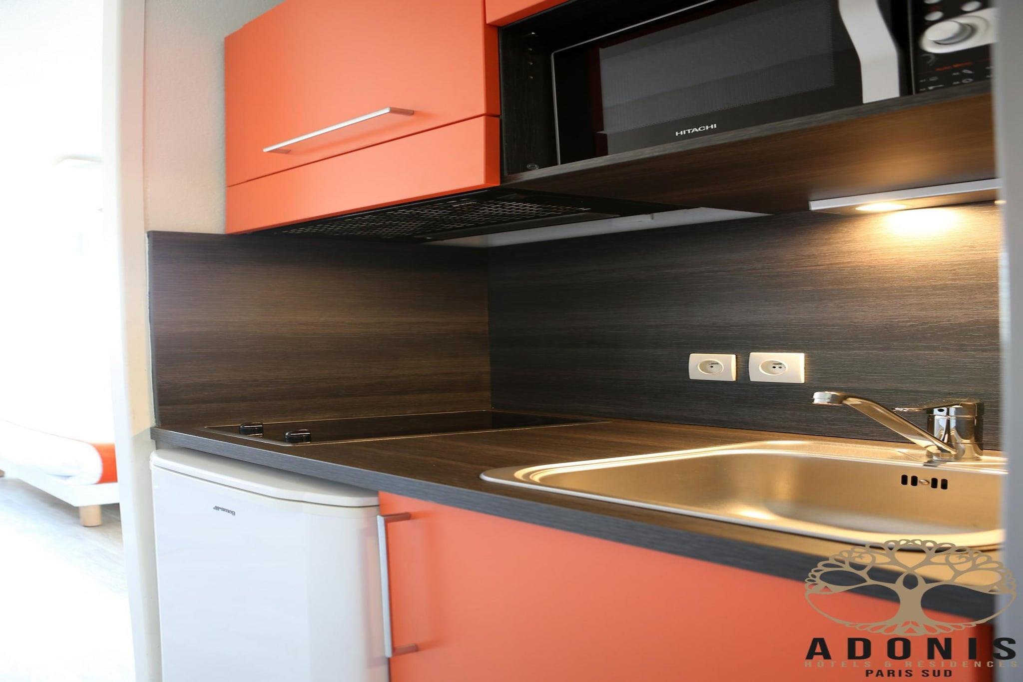 Upptäck Paris charm från bekvämligheterna i denna moderna lägenhet, perfekt belägen i den pulserande staden Chevilly-Larue. Bara 6 km från Porte d'Italie och några minuter från Orly flygplats, erbjuder denna eleganta residens i södra Paris den perfekta balansen mellan bekvämlighet, komfort och anslutning. Denna lägenhet ligger i det moderna Adonis Paris Sud hotellresidens och har ett elegant, fullt utrustat pentry, gratis Wi-Fi och tillgång till bekvämligheter på plats som hiss och parkering. Oavsett om du reser i affärer, utforskar ikoniska monument eller helt enkelt njuter av en parisisk tillflyktsort, erbjuder detta utrymme allt du behöver för att varva ner efter en hel dag. Residenset ligger nära tunnelbanestationen Villejuif - Louis Aragon (linje 7), vilket ger direkt tillgång till centrala Paris och attraktioner som Eiffeltornet, Louvren och Champs-Élysées. För ett miljöombyte kan du besöka närliggande Versailles, promenera i Vincennes trädgårdar eller utforska den kulinariska rikedomen på den berömda Rungis-marknaden, som ligger bara några minuter bort. Varje lägenhet blandar funktion och komfort med urbana designelement och erbjuder en privat, fridfull tillflyktsort strax utanför stadens jäkt. Oavsett om du stannar över en weekend eller ett längre äventyr är denna lägenhet på Adonis Paris Sud den perfekta basen för att upptäcka magin i Paris och dess omgivningar.