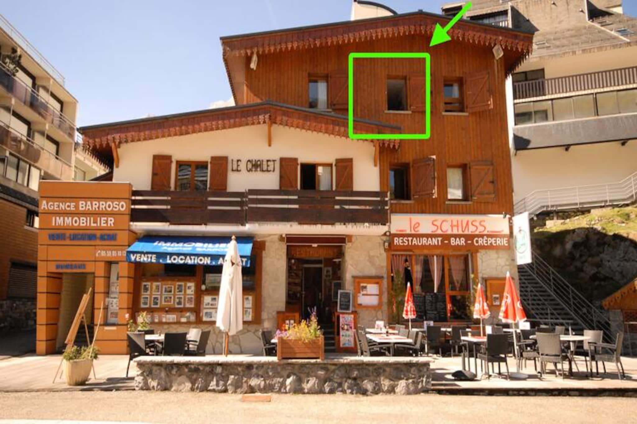 Residens "Le Chalet" – Komfort och avkoppling i hjärtat av orten Beläget på 12 Route du Col d'Aubisque (nummer 14 på ortskartan) har residensen ett centralt läge, bara 150 meter från butiker och backar. Det erbjuder högkvalitativa faciliteter för en avkopplande vistelse: en uppvärmd inomhuspool med bubbelpool, bastu, gym, Wi-Fi och ett privat skidskåp utrustat med pjäxtork. Njut av måltiderna i hotellets restaurang, Le Schuss. Residens LE CHALET med pool, studiolägenhet för 4 personer, 2:a våningen, utsikt över orten, 26 m², nordostläge, uppvärmt skidskåp, centralvärme. Ingång med alkov (2 våningssängar); Badrum med dusch, handfat, toalett och hårtork. Vardagsrum med bäddsoffa för 2 personer och TV. Kök: 2-brännare keramikhäll, ugn, kylskåp, diskmaskin, mikrovågsugn, filterkaffebryggare, brödrost och matberedare. RÖKNING FÖRBJUDEN. Sängkläder ingår. Gratis Wi-Fi. Sportanläggningarna (pool, bubbelpool, bastu och gym) är öppna på vintern från julhelgen tills anläggningen stänger, och på sommaren från 1 juli till 15 september. Extra avgifter: Turistskatt. Husdjur är välkomna mot en avgift. Tillval: Måltider (frukost, middag, halvpension), handdukar, daglig och slutstädning, tidig incheckning. Tvättservice finns tillgänglig i receptionen mot en avgift. Vintererbjudande: Rabatter för alla våra gäster på uthyrning av skidutrustning (SKILOC), och på skidliftar (SKIPASS) med det speciella SKIPLUS-erbjudandet som kombinerar båda tjänsterna. Deposition (i euro) - 250 Uppvärmning - 1