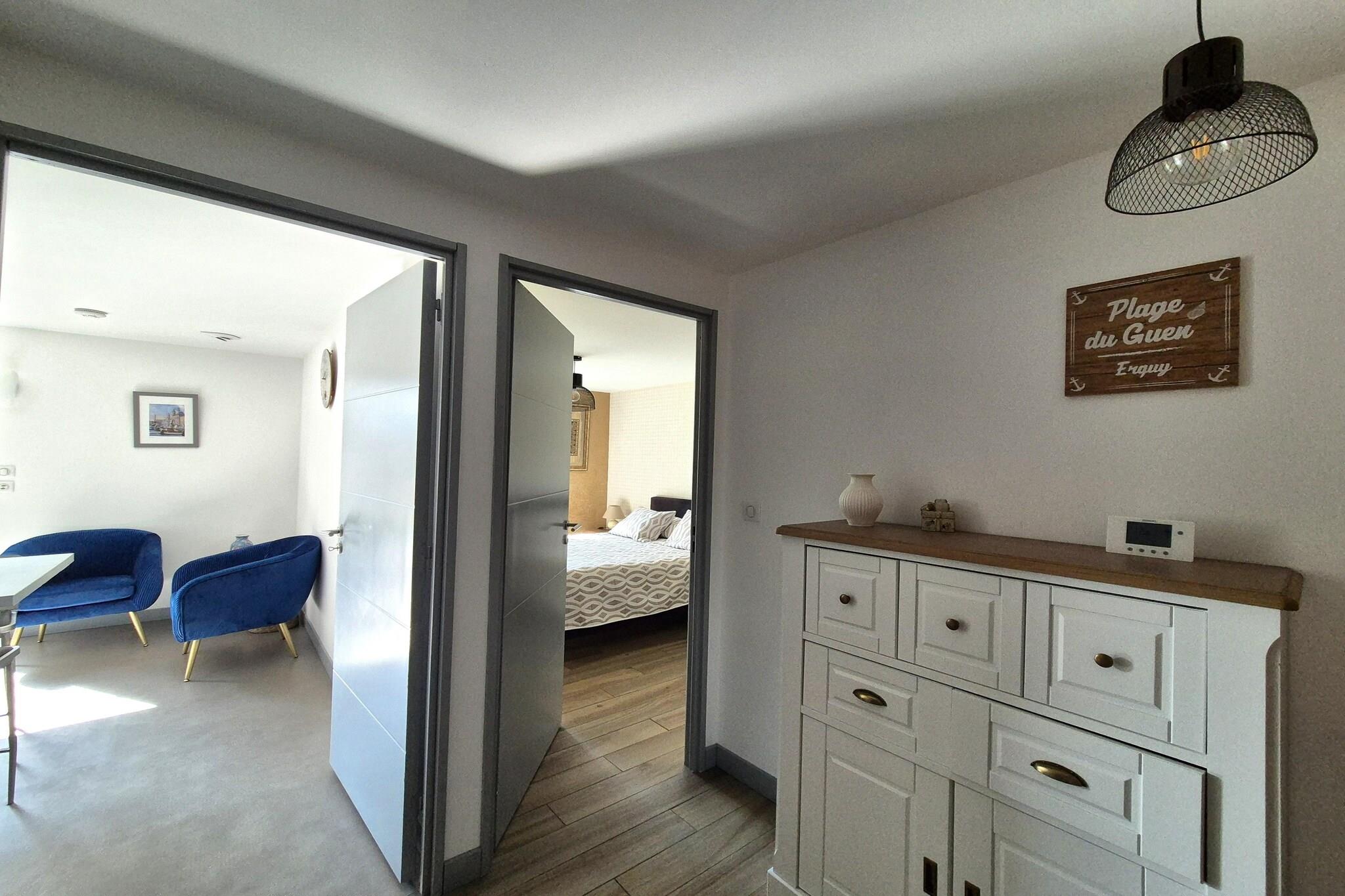 Bara en kort promenad från stranden erbjuder denna charmiga lägenhet på bottenvåningen en idealisk miljö för en romantisk resa. Den är omsorgsfullt utformad för två personer och erbjuder ett mysigt och bekvämt utrymme att varva ner, med varje detalj noggrant genomtänkt för att garantera en minnesvärd vistelse. Höjdpunkten är den vackra terrassen i söderläge, perfekt för att njuta av solen när som helst, njuta av ett glas vin eller bara koppla av i den friska havsluften. Belägen bara 800 meter från kusten och de natursköna vandringslederna GR34, inbjuder denna fridfulla tillflyktsort till utforskning av de fantastiska uddarna Cap d'Erquy och Cap Fréhel. I närheten hittar du livliga lokala marknader och en mängd olika vilda eller familjevänliga stränder som passar alla sinnesstämningar. Den lugna miljön gör den till en utmärkt bas för att upptäcka den naturliga skönheten och de charmiga byarna i regionen. Ytterligare funktioner inkluderar privat parkering och en lugn miljö, vilket garanterar bekvämlighet och avskildhet under hela din vistelse. Oavsett om du söker avkoppling eller äventyr, kombinerar denna vackra lägenhet komfort, avskildhet och närhet till naturen, vilket gör den till det perfekta valet för en minnesvärd kustsemester.