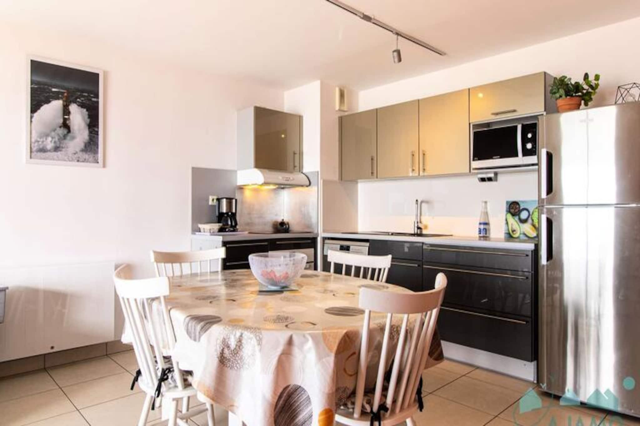 Med ljudet av vågor som sakta lockar från Caroual-stranden erbjuder denna fantastiska lägenhet med tre sovrum en lugn kustnära oas, bara några steg från Bretagnes gyllene sand. Tänk dig att vakna upp till en hisnande utsikt över stranden från din balkong, smutta på ditt morgonkaffe medan havsbrisen fyller luften. Oavsett om du söker avkoppling eller äventyr är denna fastighet den perfekta basen för en oförglömlig semester vid havet. \n\nLägenheten ligger på första våningen i en modern bostad och har en elegant och bekväm planlösning. Vardagsrummet och köket i öppen planlösning skapar en välkomnande plats att samlas i, medan de tre omsorgsfullt designade sovrummen erbjuder vilsamma tillflyktsorter för upp till sex gäster. Två dubbelrum och ett tvåbäddsrum med utdragbara sängar säkerställer flexibilitet för familjer eller grupper av vänner. Badrummet har en duschkabin och tvättmaskin för extra bekvämlighet, och en separat toalett ökar avskildheten. Ytterligare bekvämligheter inkluderar Wi-Fi, privat parkering under jord samt gratis sängkläder och handdukar, vilket garanterar en stressfri vistelse.\n\nCaroual-stranden, med sina 2 kilometer fin sand, ligger bara en kort promenad bort och inbjuder dig att njuta av soldränkta dagar, uppfriskande simturer och natursköna promenader längs stranden. I närheten erbjuder charmiga bretonska byar och lokala marknader möjligheter att utforska regionens rika kultur och mat. För friluftsentusiaster slingrar sig vandringsleder och cykelvägar genom de fantastiska kustlandskapen och lovar äventyr i varje hörn.\n\nOavsett om du dras till havets lugn eller de pulserande lokala attraktionerna, kombinerar denna lägenhet komfort, bekvämlighet och hisnande omgivningar för att skapa en semesterupplevelse du kommer att värna om för alltid.