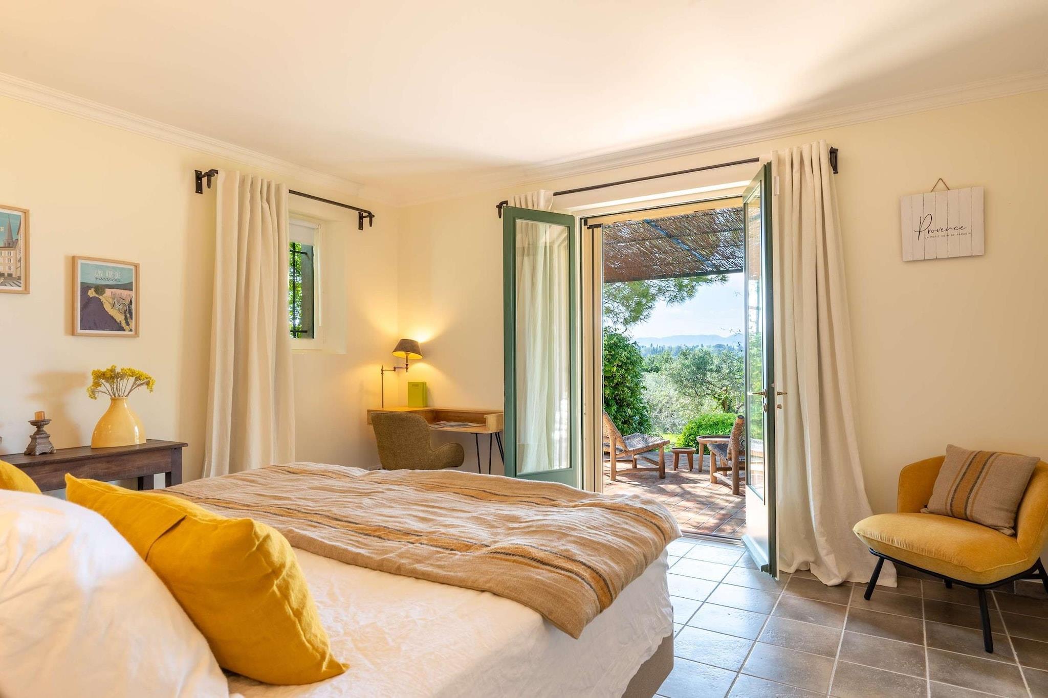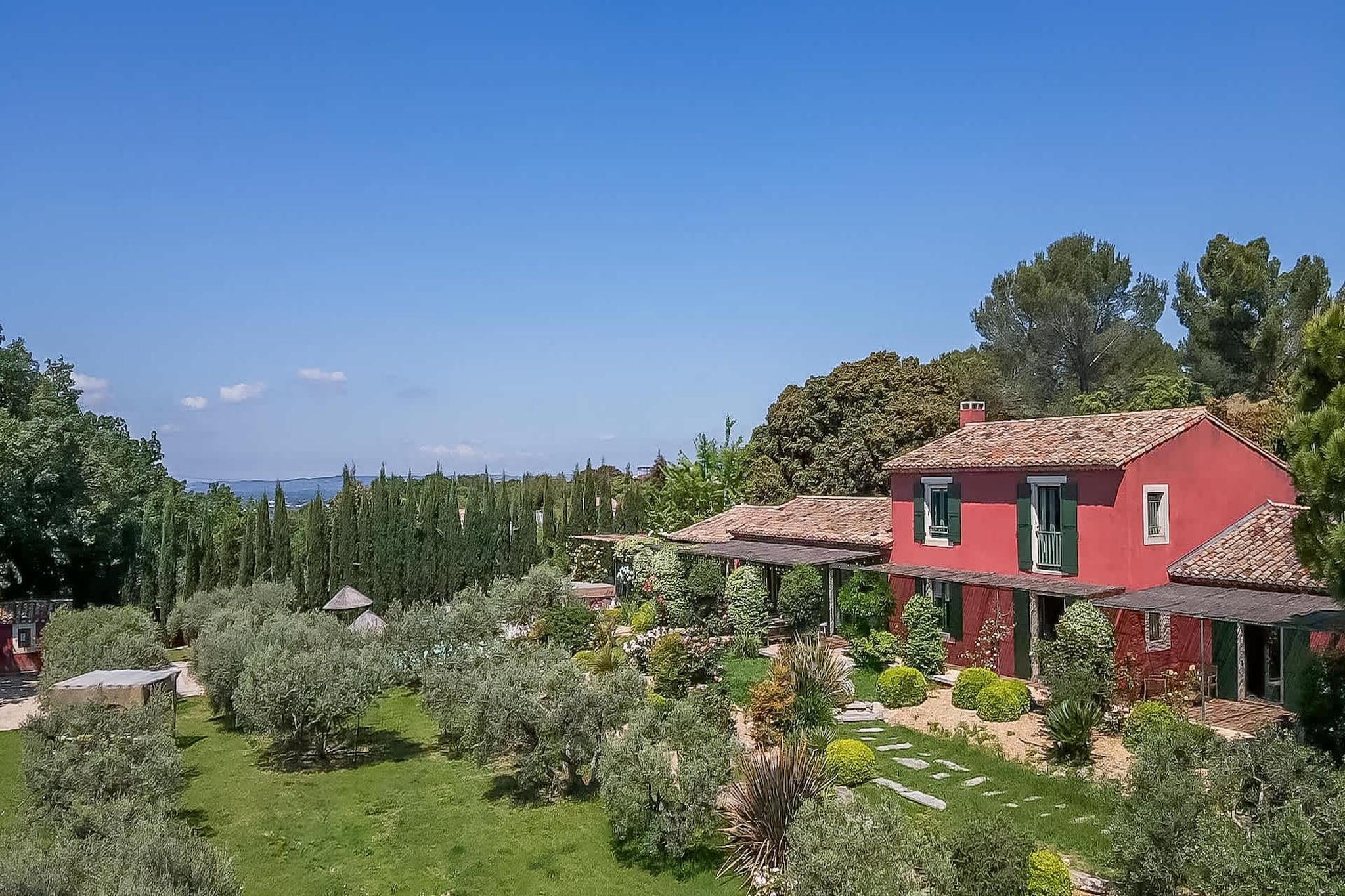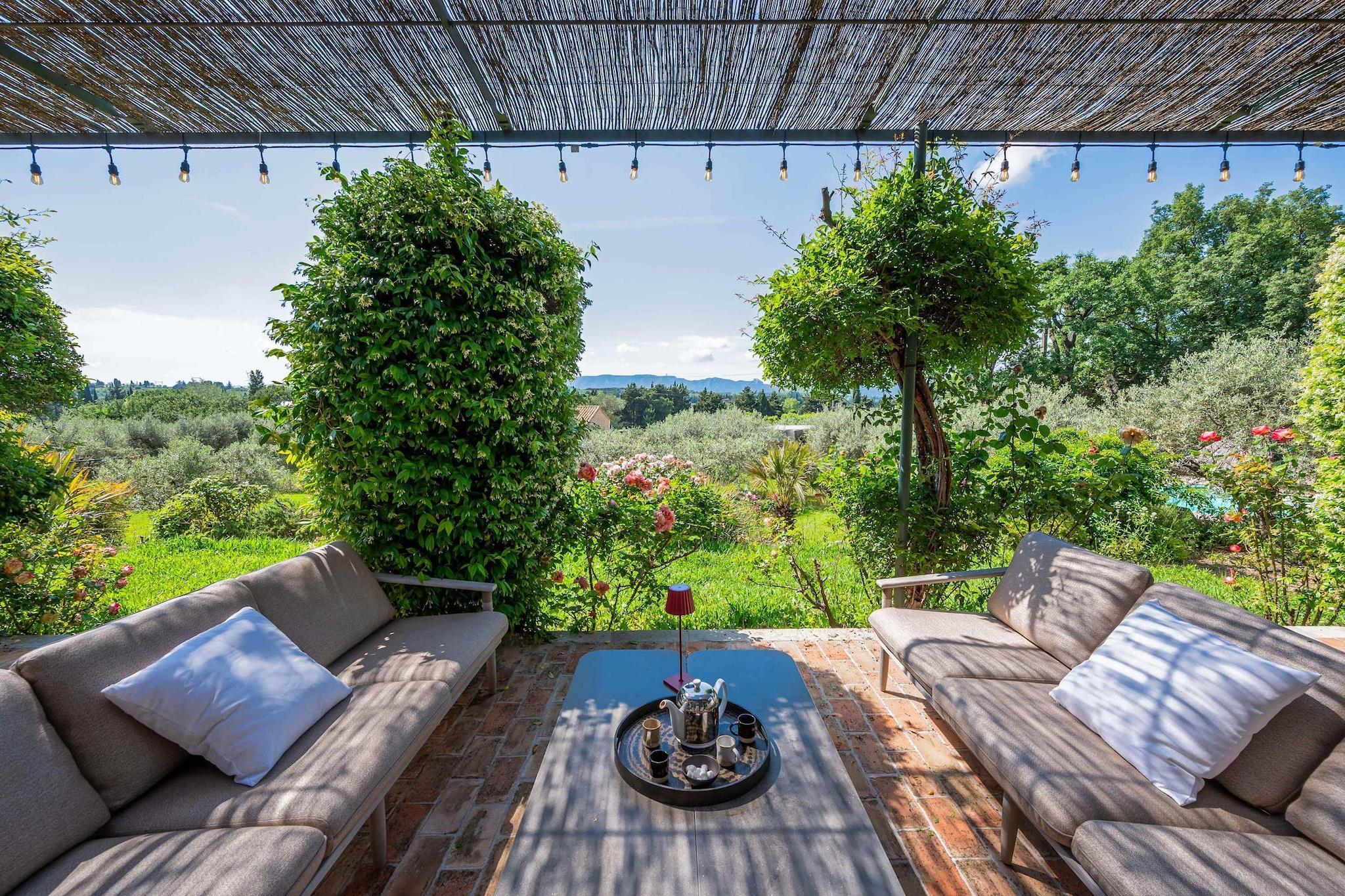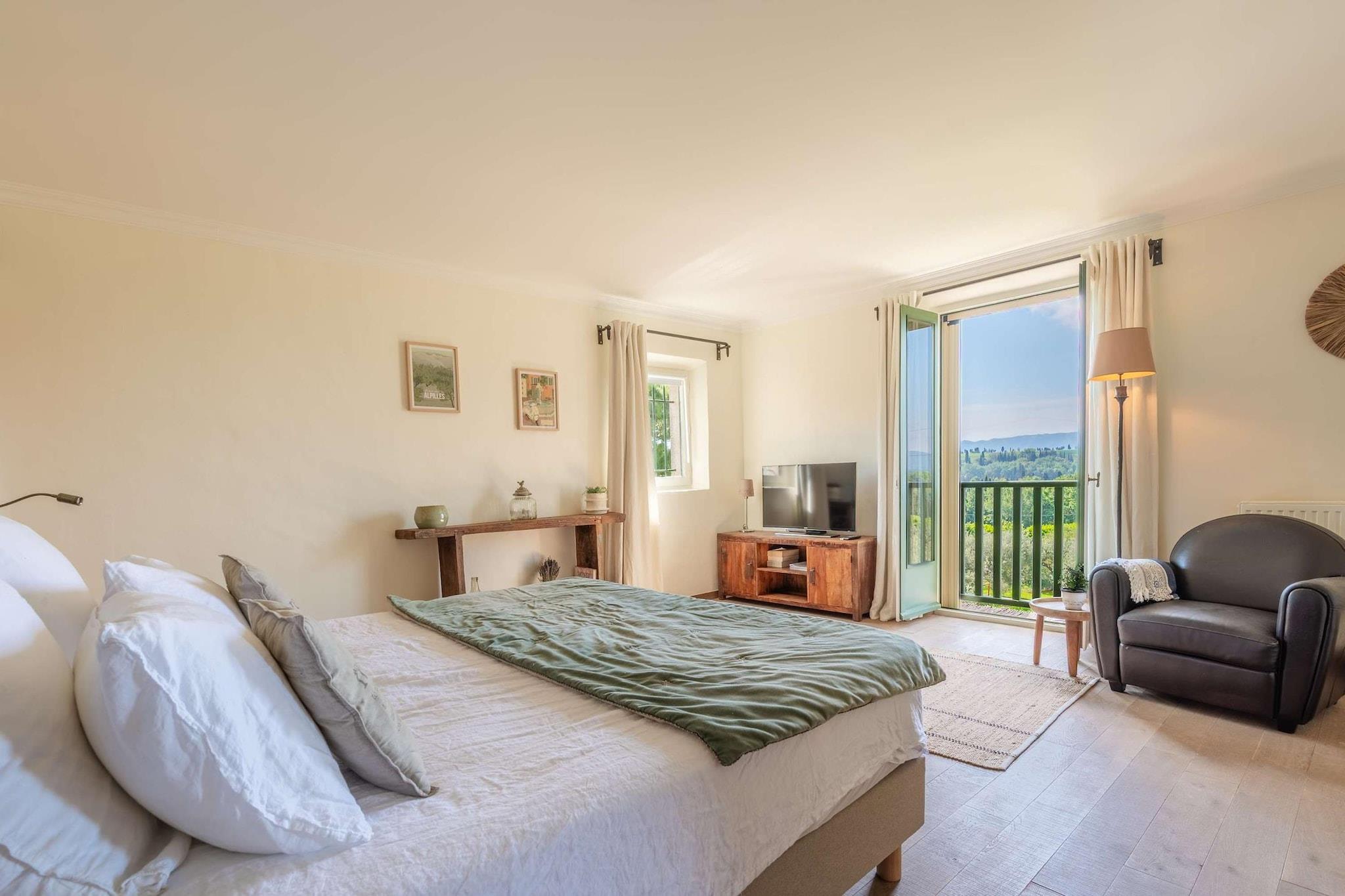 Belägen strax utanför den lilla provensalska byn Eyragues, erbjuder denna villa den typ av lugn där morgnarna börjar långsamt, dörrarna öppnas för solsken och dagarna utvecklas naturligt. Det är en bekväm bas för en familj eller vänner - en plats som är gjord för att vila ut ordentligt, dela måltider och utforska landsbygden i lugn takt. De fyra sovrummen med eget badrum och king size-sängar är inredda för enkel komfort, inklusive en rymlig garderob och rena, moderna badrum för att fräscha upp sig. Det finns ett femte sovrum med en dubbelsäng och även 2 spjälsängar för enkelhetens skull. Vardagsrummet känns välkomnande, möblerat för verklig användning - ett utrymme där du kan koppla av med en bok, streama en film på TV:n eller samlas på kvällen med vin och samtal. Med Wi-Fi, luftkonditionering och värme förblir huset behagligt under alla årstider. Matlagningen är enkel i det fullt utrustade köket, perfekt för en lätt frukost före marknadsdagen eller en lång middag hemma. Kliv ut och du hittar en privat trädgård och möblerad terrass, perfekt för kaffe i soluppgången eller en lugn kvällsmåltid utomhus. Gratis parkering på plats gör det bekvämare, särskilt om du utforskar närliggande städer. Eyragues ger dig Provences essens - smala stengator, bykaféer och en veckovis marknad fylld med färska råvaror, ost, honung och färgglada stånd under platanerna. Vandra lugnt eller kör ut i Alpilles för vandringsleder, vingårdar, romersk historia och städer på kullar som glöder vid solnedgången. Tyst, bekvämt och avkopplande - detta är en plats att andas, att varva ner, att njuta av Provence i din egen rytm.