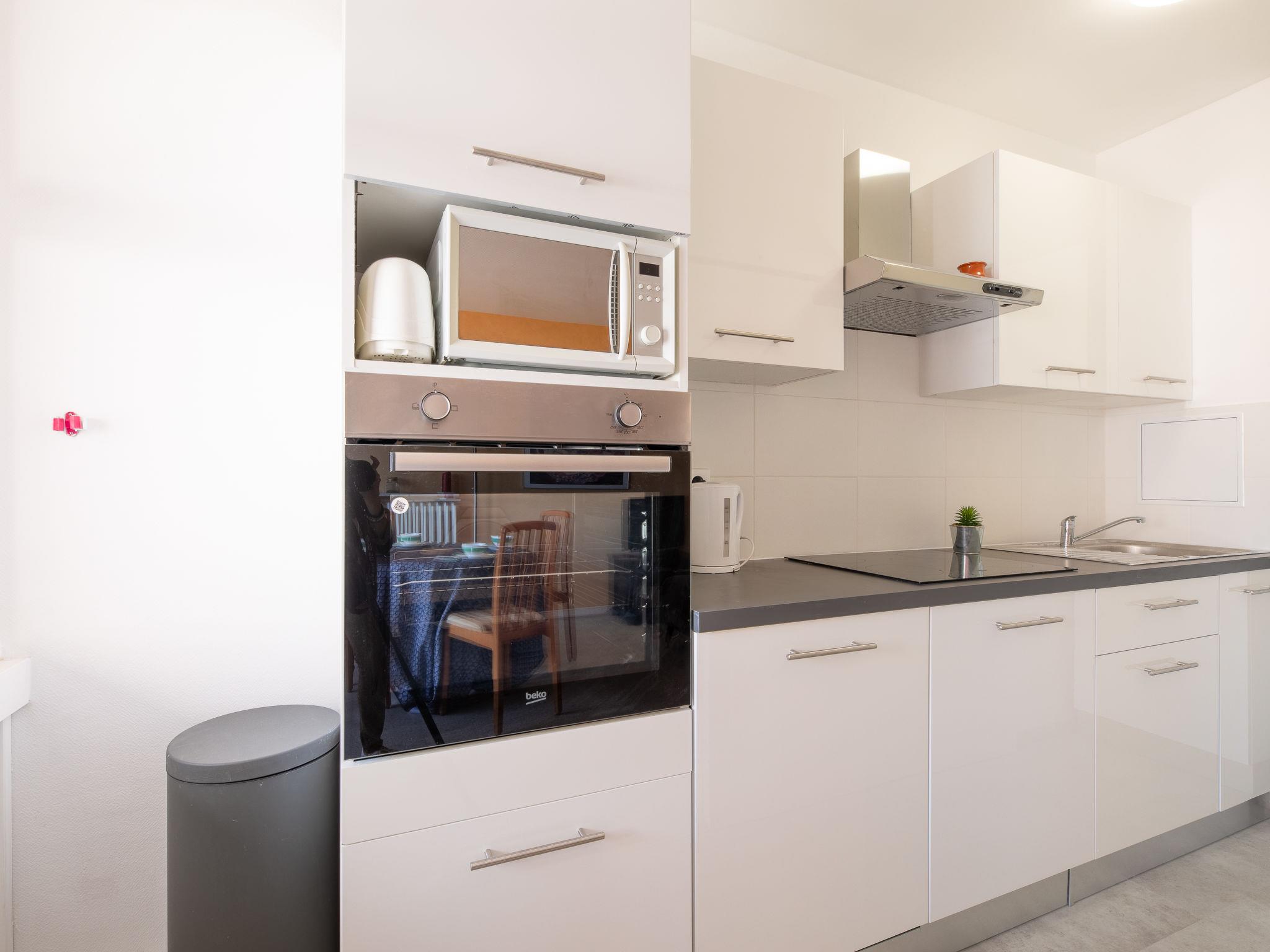 2-room apartment 43 m2 on 3rd floor. Living/dining room with 1 double sofabed (1 x 140 cm, length 190 cm), TV and air conditioning. Exit to the terrace. 1 room with 1 french bed (1 x 160 cm, length 200 cm), electric heating and air conditioning. Exit to the terrace. Open kitchen (4 hot plates, dishwasher, toaster, kettle, microwave, freezer, electric coffee machine, Capsules for coffee machine (Nespresso) extra). Shower/WC. Terrace 5 m2. Terrace furniture. Beautiful view of the sea. Facilities: washing machine, hair dryer. Internet (WiFi, extra). Garage space n 97 at 300 m, height 185 cm, width 218 cm. Please note: non-smokers only. Smoke alarm, no lift.