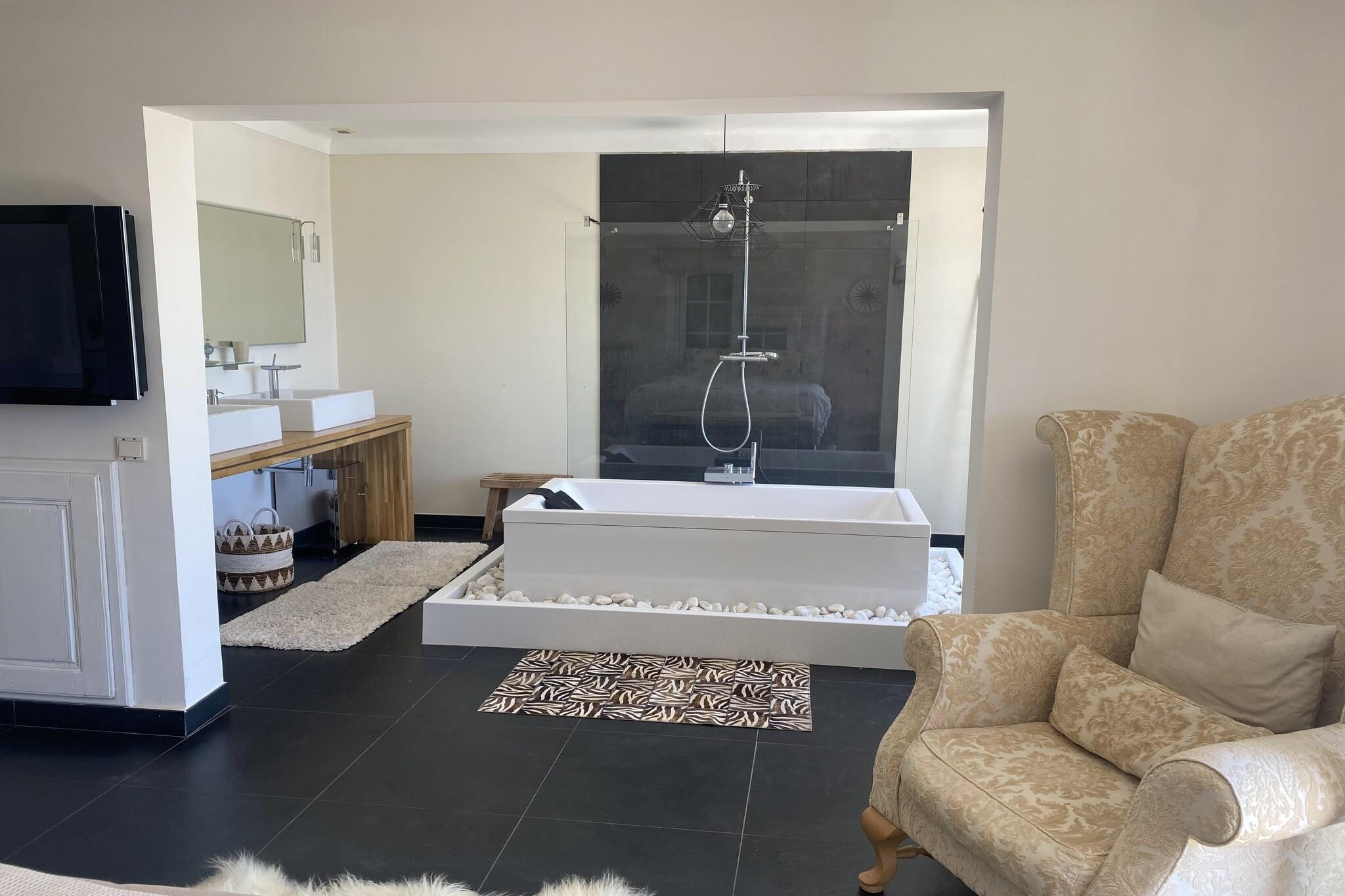 Bottenvåningen: (öppet kök(vattenkokare, spis(gas), 2x kaffebryggare(espresso, kaffekapslar), ugn(grill-ugn), kombi ugn/mikro, diskmaskin, kylskåp(+ frys, amerikansk)), ardags- och matrum(TV(satellit), matbord(8 personer), öppen spis, sitthörna, radio, stereo), terrass) På våning 1: (sovrum(dubbelsäng(180 x 200 cm)), sovrum(dubbelsäng(160 x 200 cm)), sovrum(dubbelsäng), sovrum(våningssäng), badrum(dusch, handfat), badrum(dusch, handfat), badrum(badkar, handfat), terrass) WC, WC, utomhuskök, torktumlare, tvättmaskin, värme, luftkonditionering, trädgårdsmöbler, grill, parkering, solstolar, Parasoll, swimmingpool(privat, betalt, uppvärmbar, 8 x 4 m.)