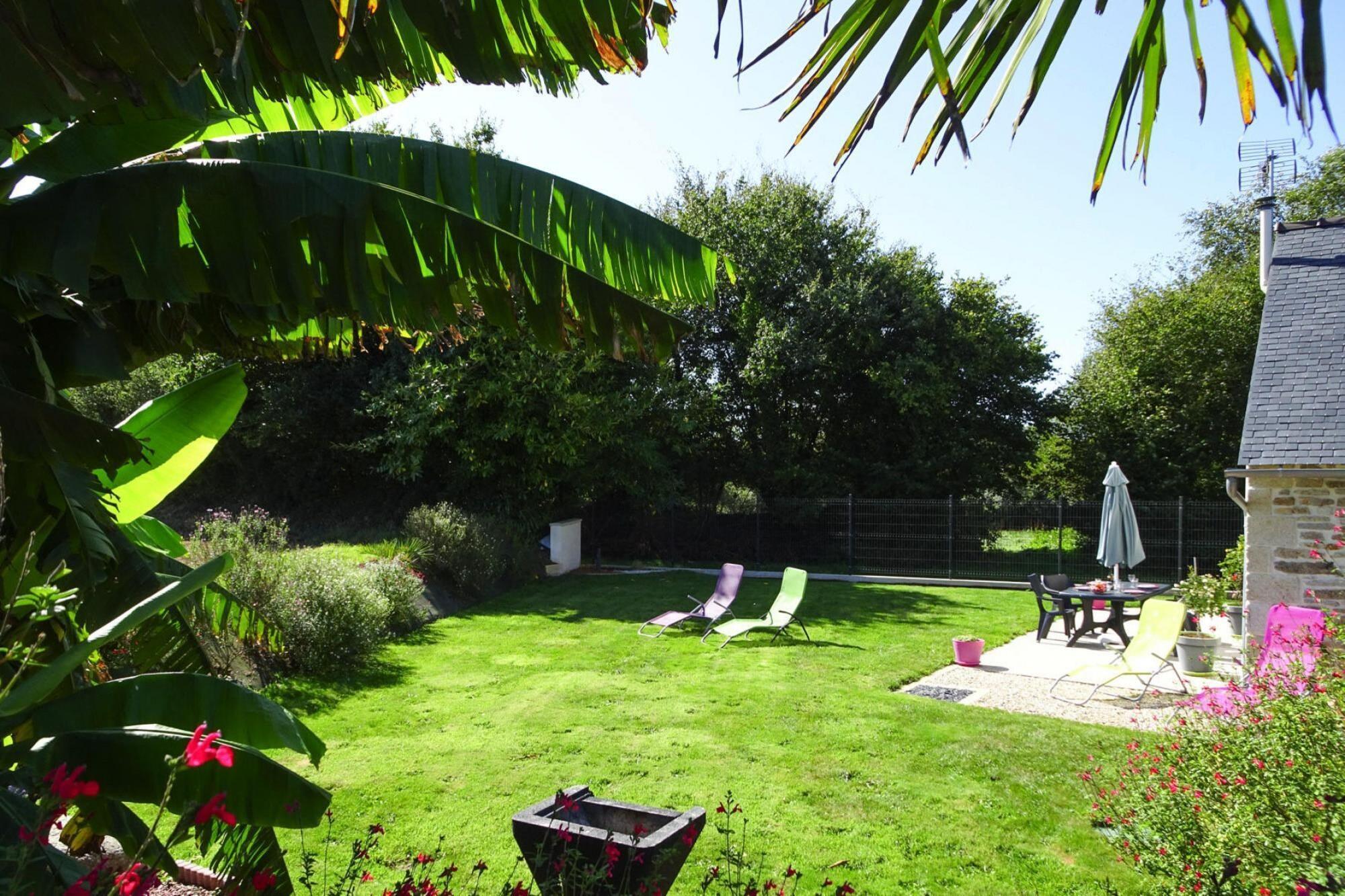 Detta mysiga fritidshus ligger på en vacker trädgårdstomt mellan land och hav, i utkanten av den regionala naturparken d'Armorique och nära en populär fiskesjö. Den krokiga fastigheten imponerar med en framgångsrik kommunikation av traditionell, bretonsk konstruktion och modern komfort. På trädgårdssidan leder breda fönsterdörrar ut mot terrassen och den välskötta trädgården. Här kan du koppla av efter alla typer av utomhusaktiviteter och sightseeing. Barnfamiljer är mycket välkomna. En liten lekhörna är inrättad speciellt för barnen och babyutrustningen är komplett. De vackra, vita sandstränderna i norra Bretagne kan snabbt nås med bil. Den pittoreska, medeltida staden Guerlesquin (centrum ca 1 km) ligger i gränsområdet mellan departementen Finistere och Côtes d'Armor. En idealisk utgångspunkt för att utforska nordvästra Bretagne: Morlaixbukten med den pittoreska hamnstaden Roscoff och den rosa granitkusten med sina livliga badorter. Den närliggande sjön med samma namn, Lac de Guerlesquin, är den största sjön i Bretagne. Ett paradis för naturälskare och fiskefantaster.