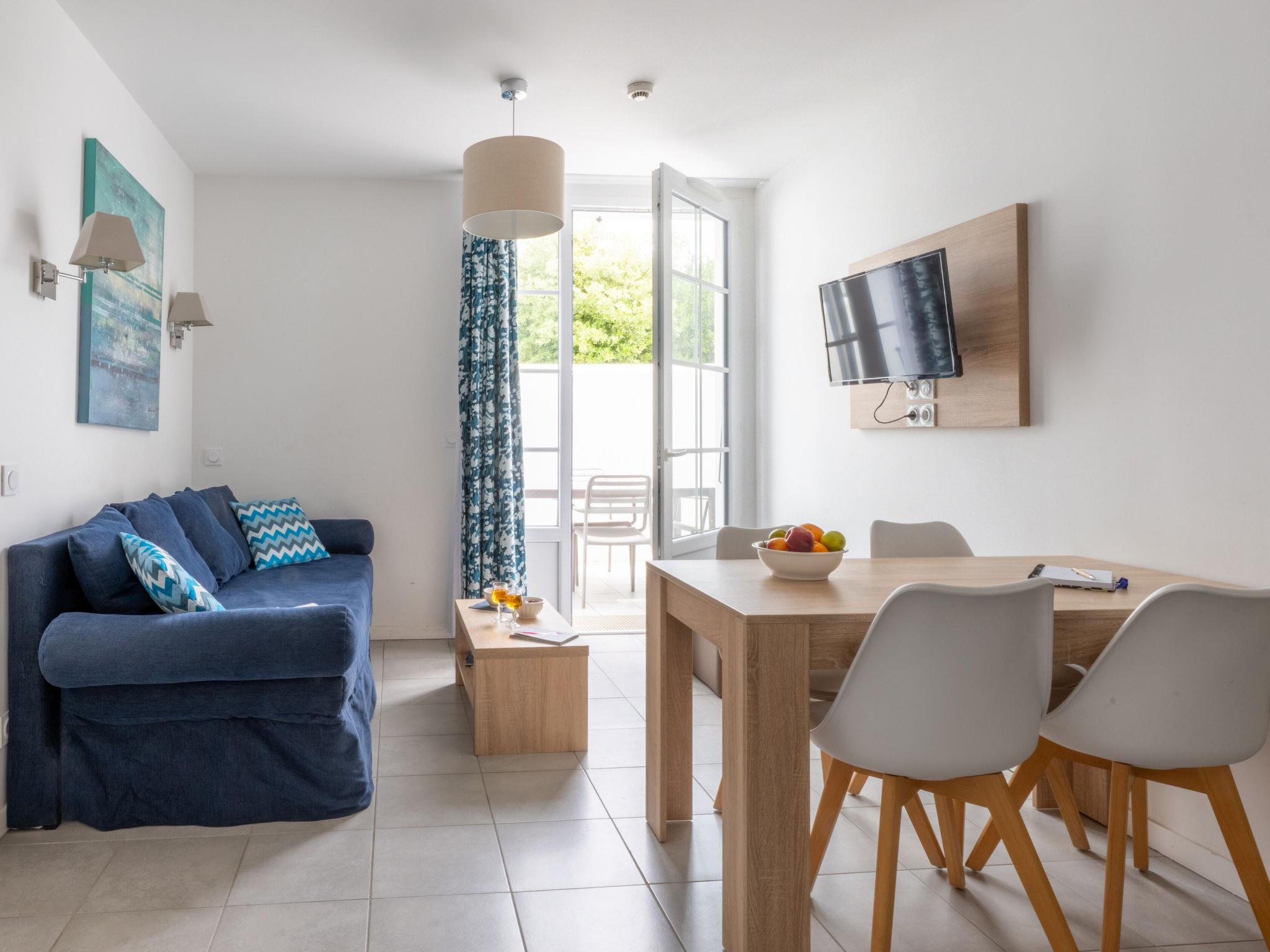 "Résidence Odalys Collection Rève d'Ile", 3-room apartment 51 to 55 m2. Bright, practical furnishings: living/sleeping room with 1 bed, 1 pull-out bed, dining table and TV. Exit to the balcony, to the terrace. 1 room with 1 french bed (160 cm, length 190 cm), bath/WC. 1 room with 2 beds (80 cm, length 190 cm). Small, open kitchen (dishwasher, 4 ceramic glass hob hotplates, toaster, kettle, freezer, electric coffee machine, combination microwave). Bath/WC or shower/WC. Heating. Terrace. Terrace furniture. Facilities: children's high chair, baby cot (extra), hair dryer. Internet (WiFi, free). Please note: non-smokers only. Maximum 1 pet/ dog allowed. Smoke alarm, fire extinguisher. The property is one of a type of property or apartment.