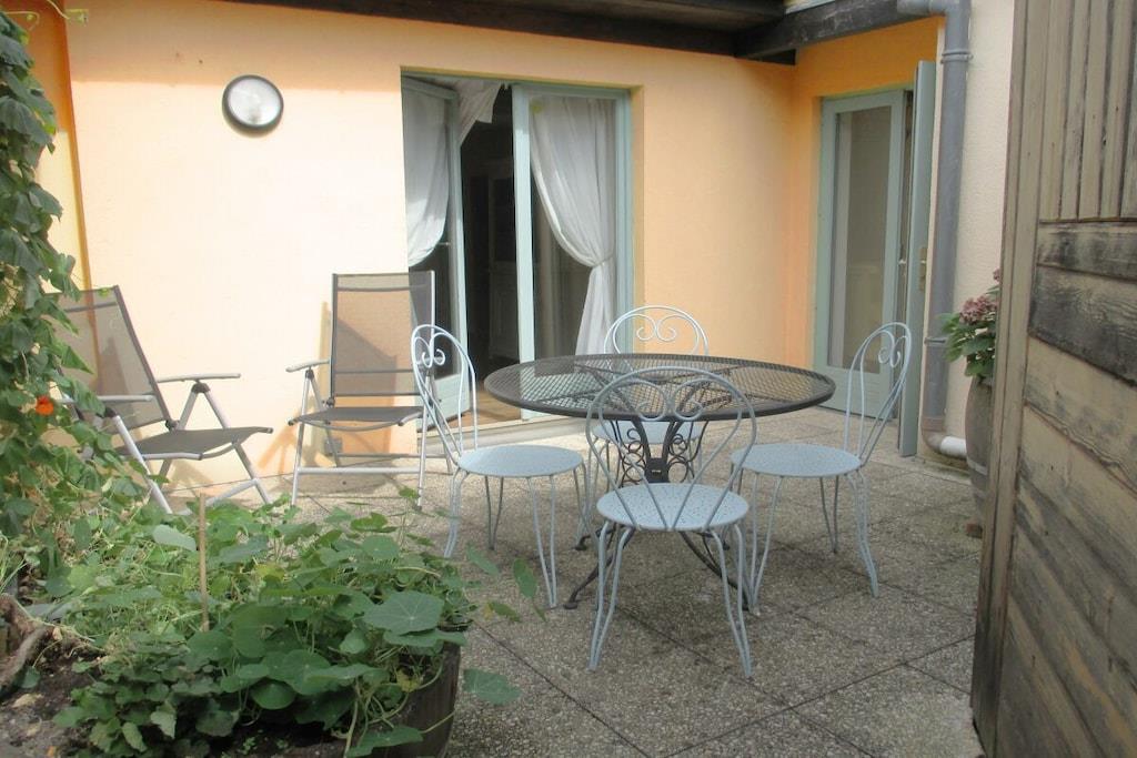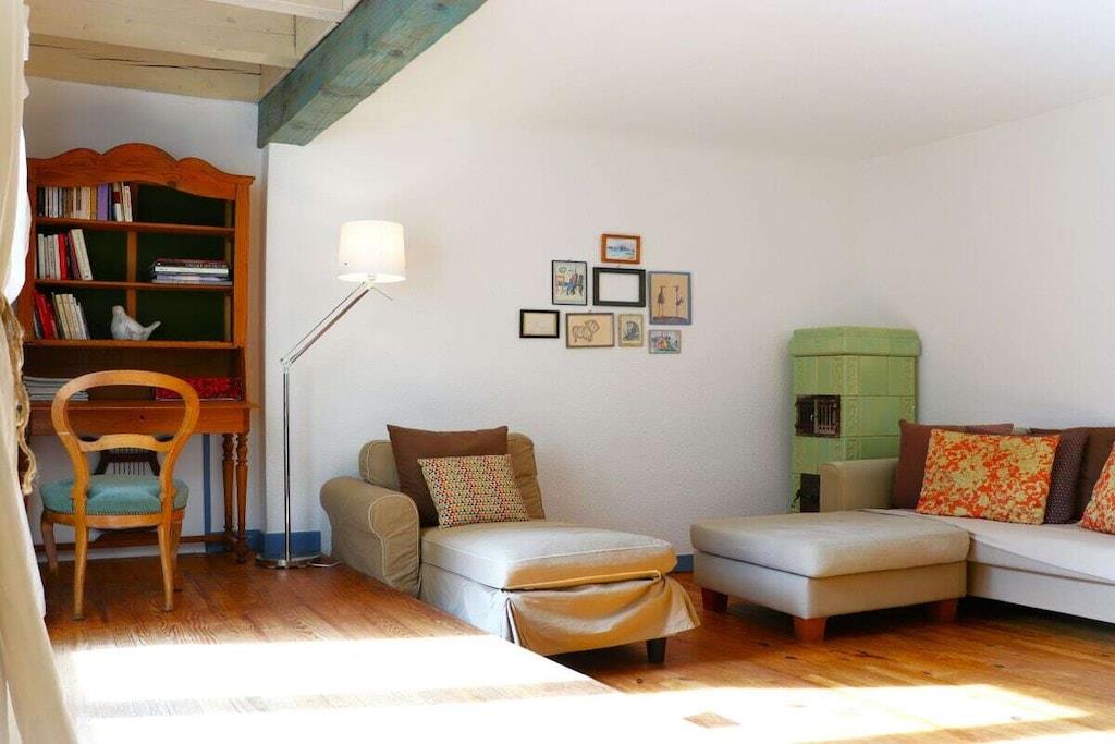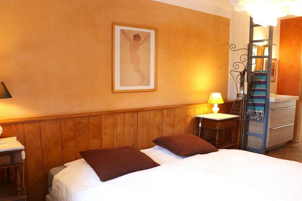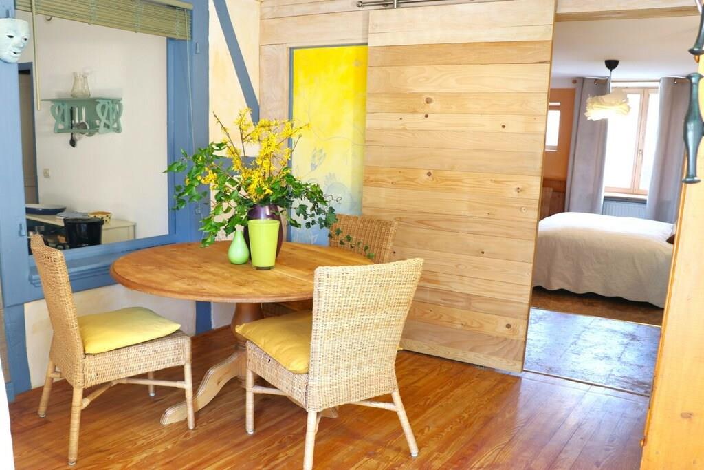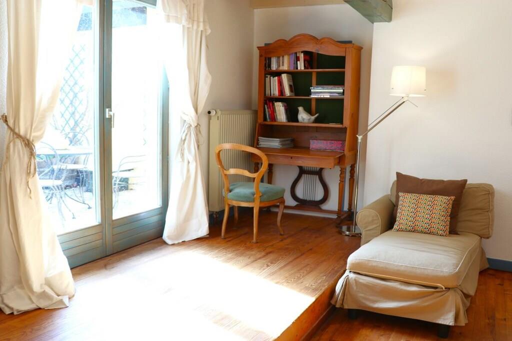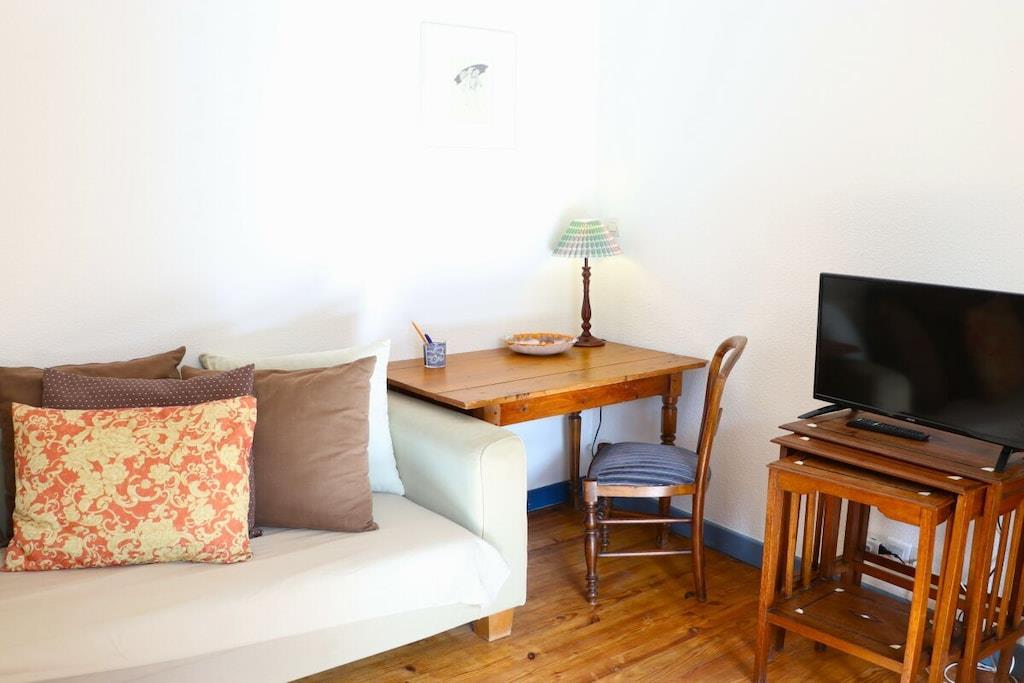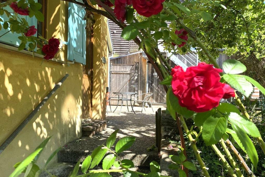 En liten, charmig lägenhet med ett sovrum och egen uteplats för en mycket privat och fridfull semester. Denna lägenhet är husets mest hemliga, svår att hitta men väldigt romantisk. Den är också lämplig för en vistelse med en bebis eller ett litet barn. Golven är vaxade trägolv, möblerna är noggrant utvalda och atmosfären är mjuk och solig. Sovrummet är separat, vetter mot öster och utgör också en del av ett separat rum med dusch och handfat. Toaletten är separat. Köket är välutrustat och vardagsrummet är mycket rymligt, även för att arbeta om man behöver det (fiberoptisk internetåtkomst). Pluspunkten är den privata innergården, som möjliggör diskretion, och precis runt hörnet ligger vingårdens gemensamma trädgård med träd, gräs och en damm, och precis runt hörnet finns vandrings- och cykelleder.
