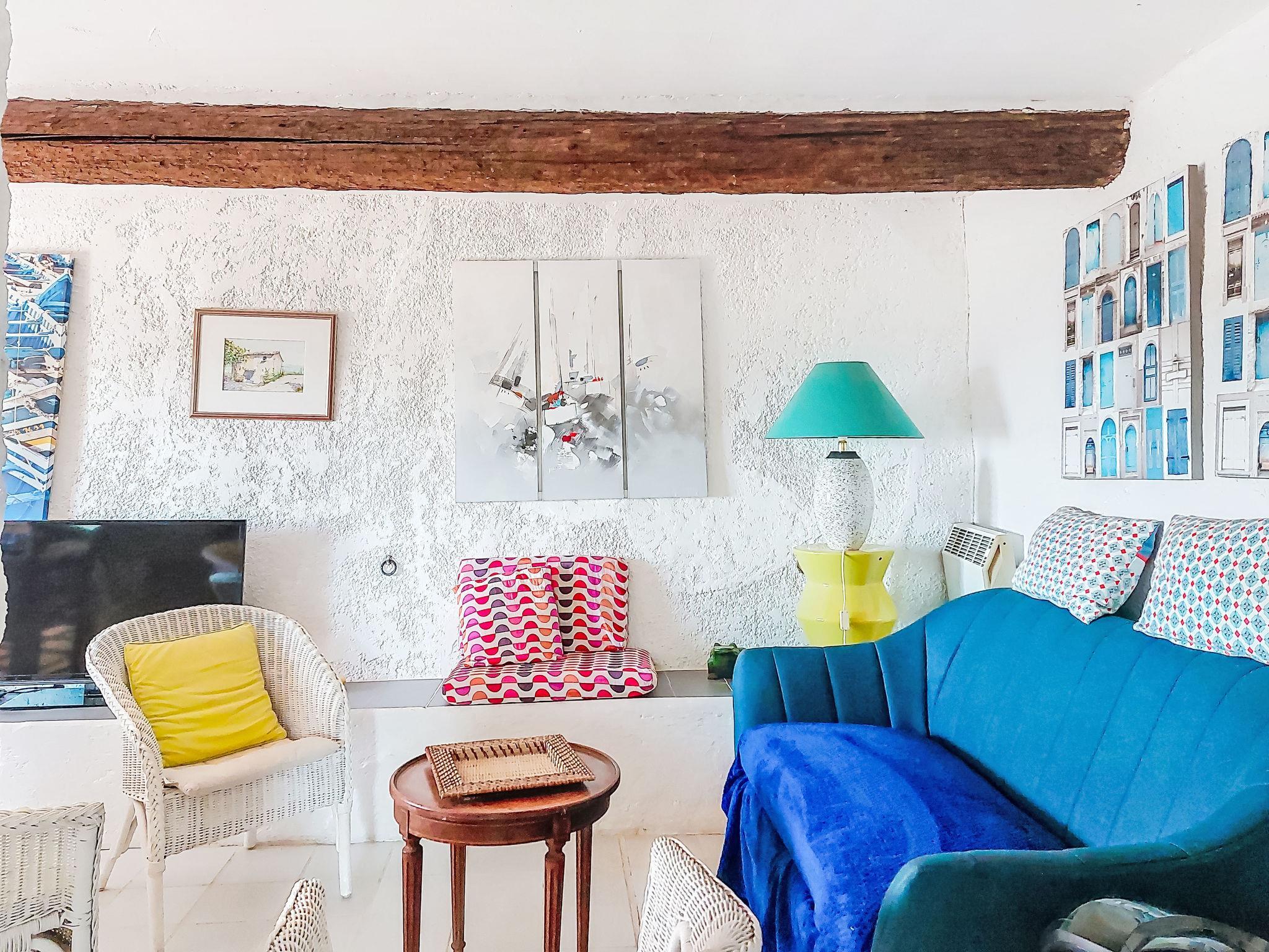 3-room house 70 m2 on 2 levels. Antique furnishings: living/dining room with TV, radio, CD-player and DVD. Small, open kitchen (2 hot plates, mini-oven, toaster, kettle, microwave, freezer, electric coffee machine). Upper floor: (open staircase), 1 room with 1 french bed (140 cm, length 190 cm). 1 room with 1 french bed (140 cm, length 190 cm). Shower/WC. Electric heating. Terrace 30 m2, south-west facing position. Terrace furniture, electric barbecue. Marvellous panoramic view of the sea and the countryside. Facilities: iron. Internet (WiFi, extra). Please note: maximum 1 small pet/ dog allowed. TV only FR. Smoke alarm.