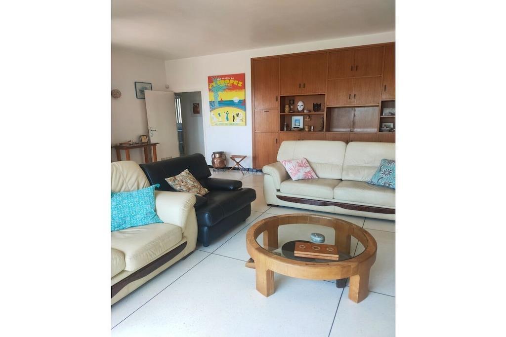 Tre sovrum, varav ett har dusch och handfat, ett rymligt vardagsrum, matsal, badrum och en separat toalett med fönster. De tre sovrummen och fönstret till det rosa badrummet och toaletten har myggnät. Beroende på vindriktningen kan man höra havet. En separat studio för två personer med pentry och badrum med toalett. Parkering för upp till fyra bilar på en sluten tomt med automatisk grind. Köket är fullt utrustat och har allt du behöver. En tegelgrill finns på terrassen. En jacuzzi för två personer finns också på terrassen. En andra terrass med matbord, bänk och stolar, och naturligtvis havsutsikt, finns också tillgänglig.
