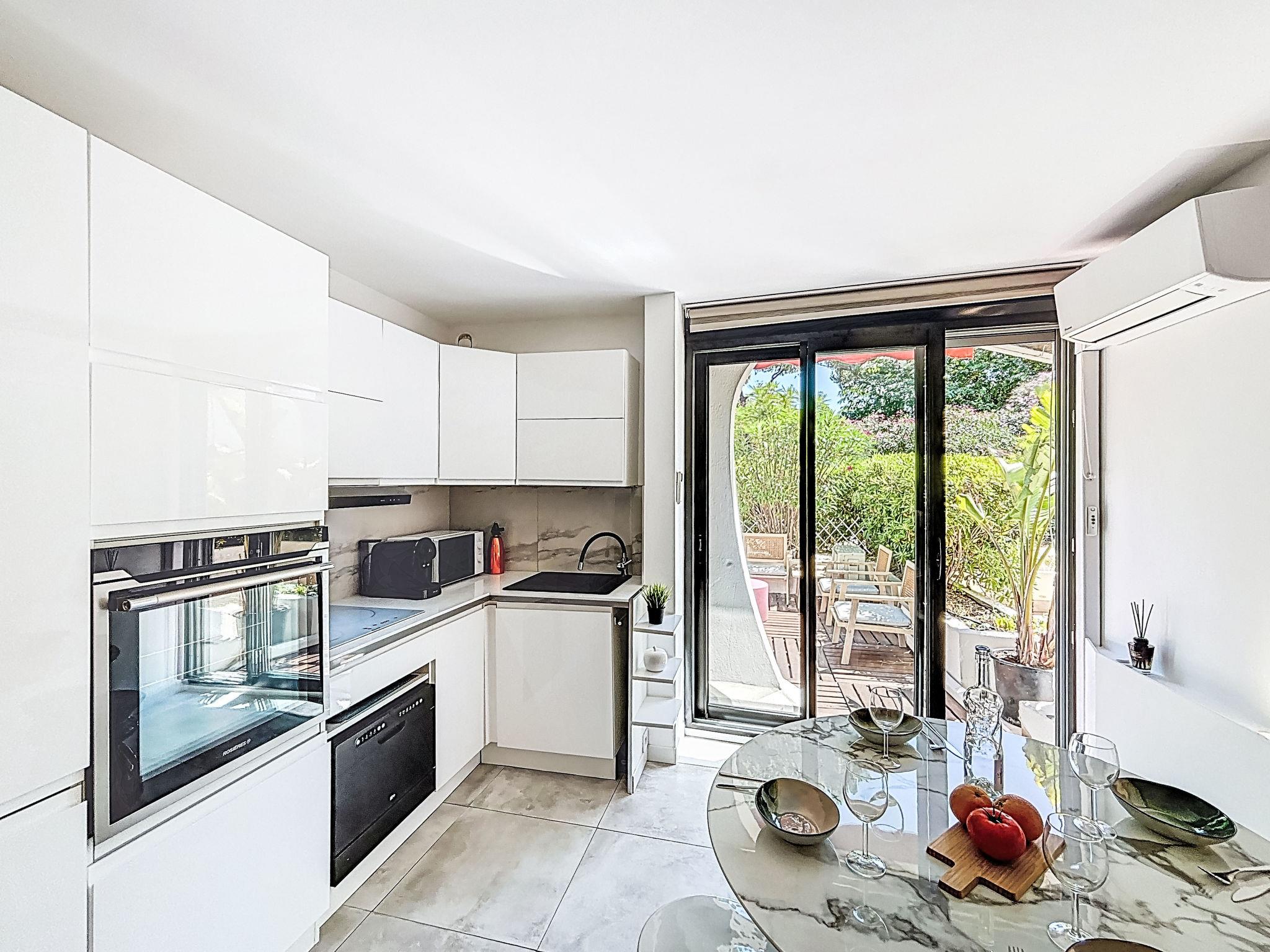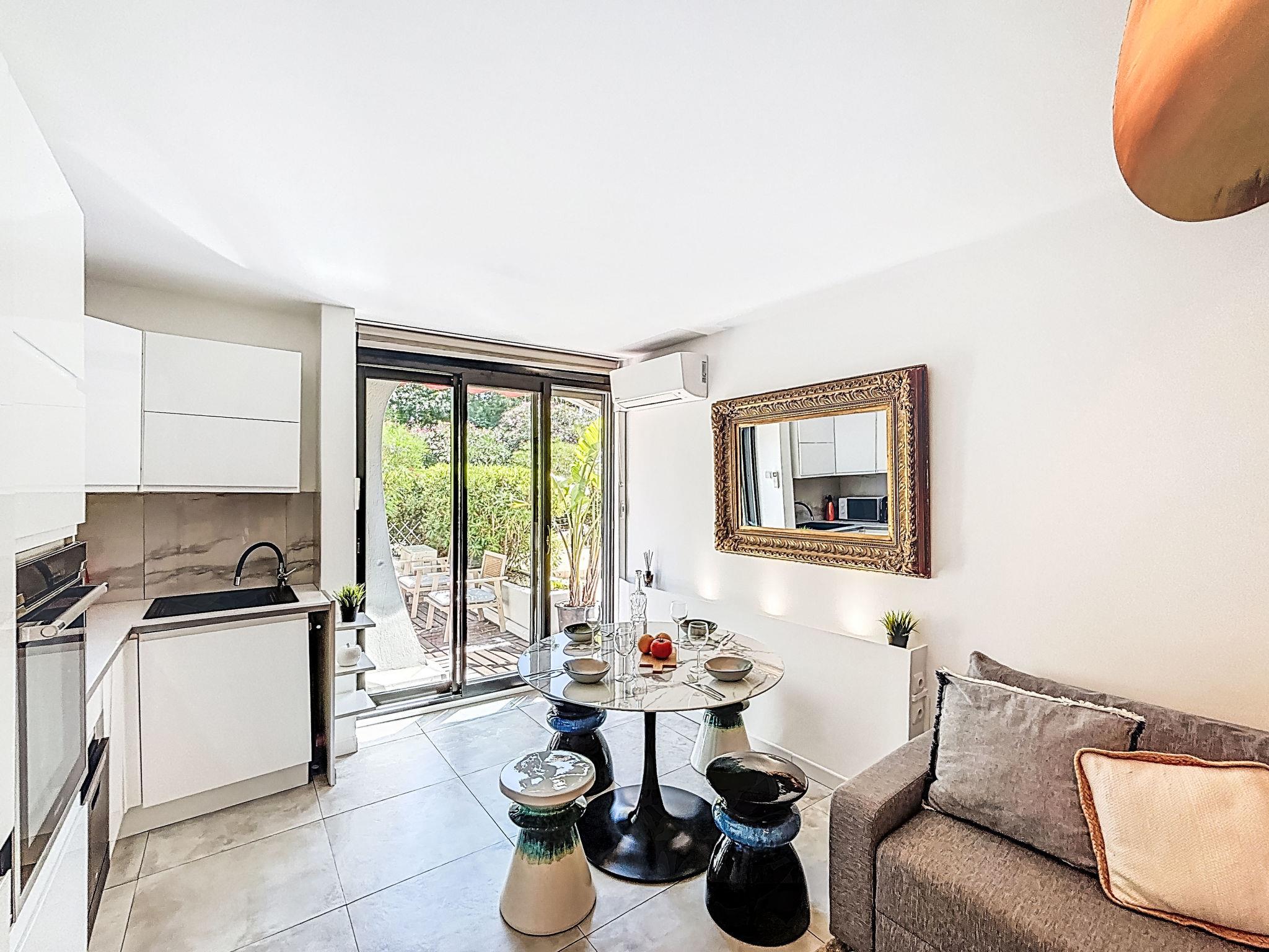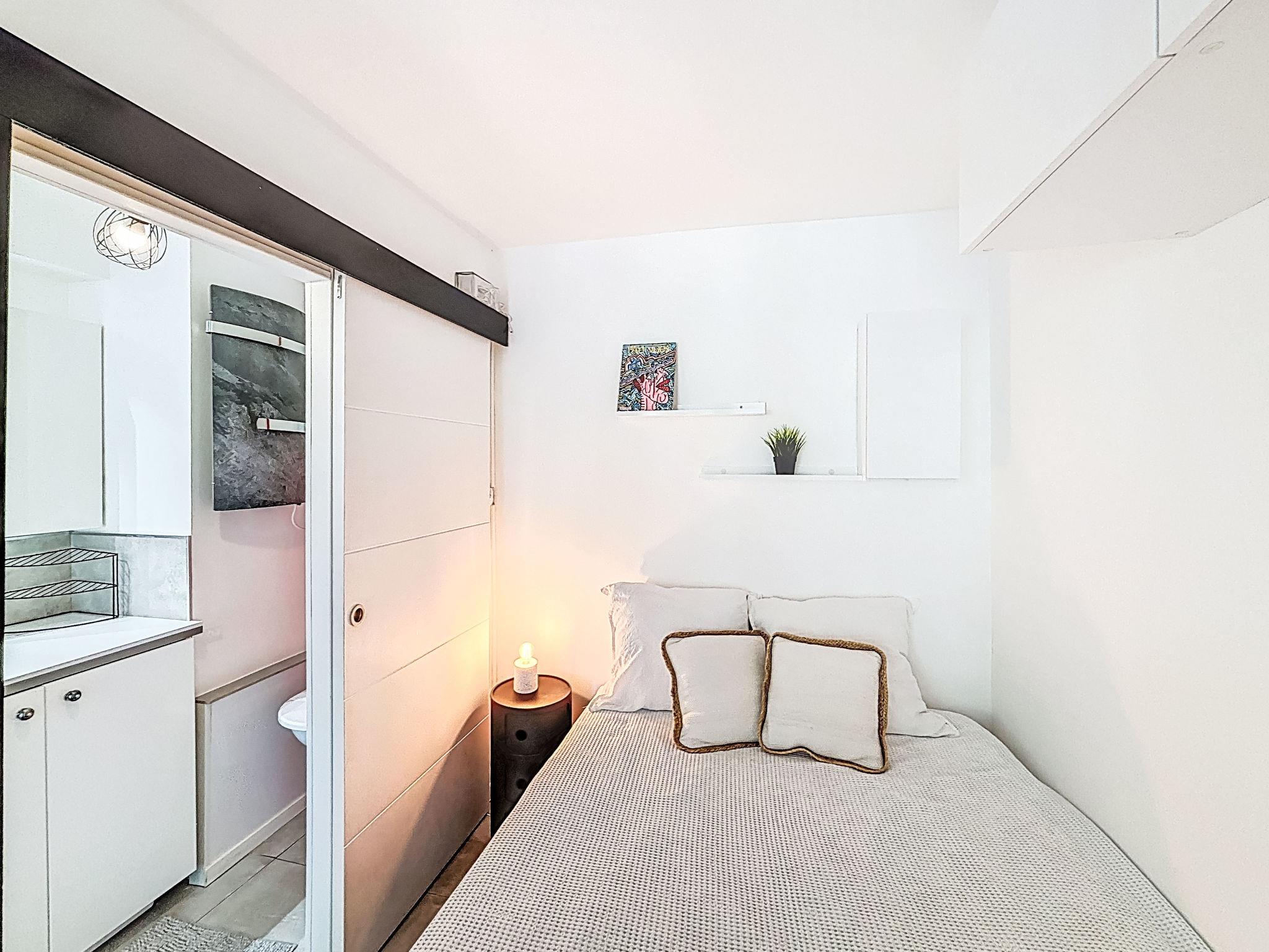 2-room apartment 27 m2, on the ground floor, south facing position. Beautiful furnishings: living/dining room with 1 double sofabed (140 cm, length 190 cm), TV (flat screen), air conditioning. Exit to the terrace. 1 small room with 1 french bed (140 cm, length 200 cm). Kitchenette (oven, dishwasher, 3 induction hot plates, toaster, kettle, microwave, freezer, electric coffee machine, Capsules for coffee machine (NESPRESSO) extra). Shower/WC. Electric heating. Large terrace 25 m2, south facing position. Terrace furniture, deck chairs (1). View of the garden. Facilities: washing machine, dryer. Internet (WiFi, extra). Please note: non-smokers only, no parking. Smoke alarm. Offer by a private individual according to Art. 155, IV of CGI.