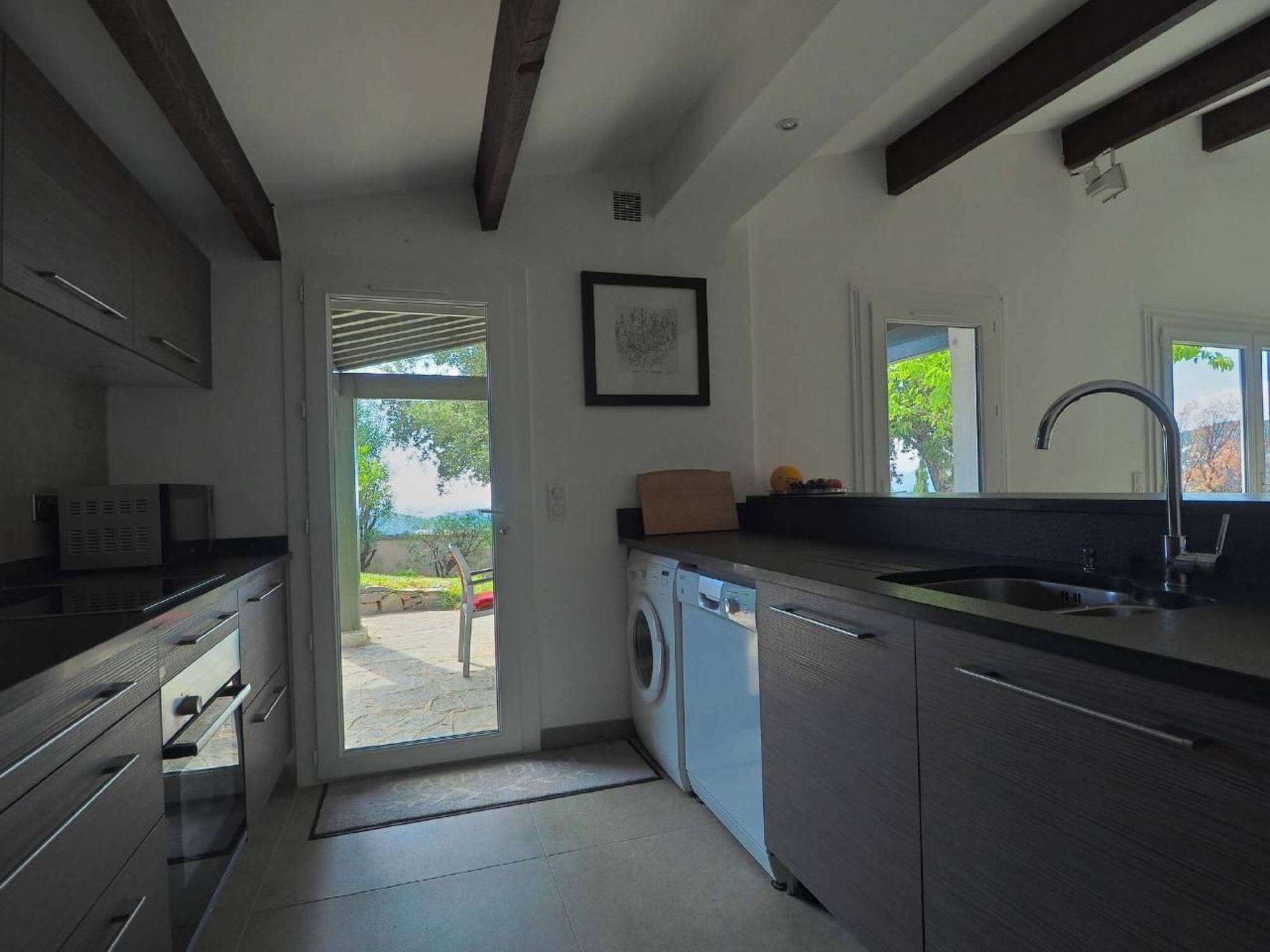 The renovated villa in Valcros (near La Londe les Maures) is located in a quiet residential area on a hill in the foothills of the Massif des Maures. From the detached house and the terraces you can enjoy a fantastic panoramic view of the entire bay of Hyeres with the Giens peninsula and the Ile de Porquerolles. The garden is shaded by two cork oaks and a patio cover, but also offers plenty of sunny spots depending on your taste and the time of year. The 12 x 6 metre pool is located in a slightly lower part of the garden. The house and garden are south-west facing, so you will always find a suitable spot with a good view. The house has an allocated parking space (further visitor parking spaces are also available), which is located at the end of a cul-de-sac. Access to the property is via several steps. The plots are arranged in such a way that you are undisturbed in the house and garden.