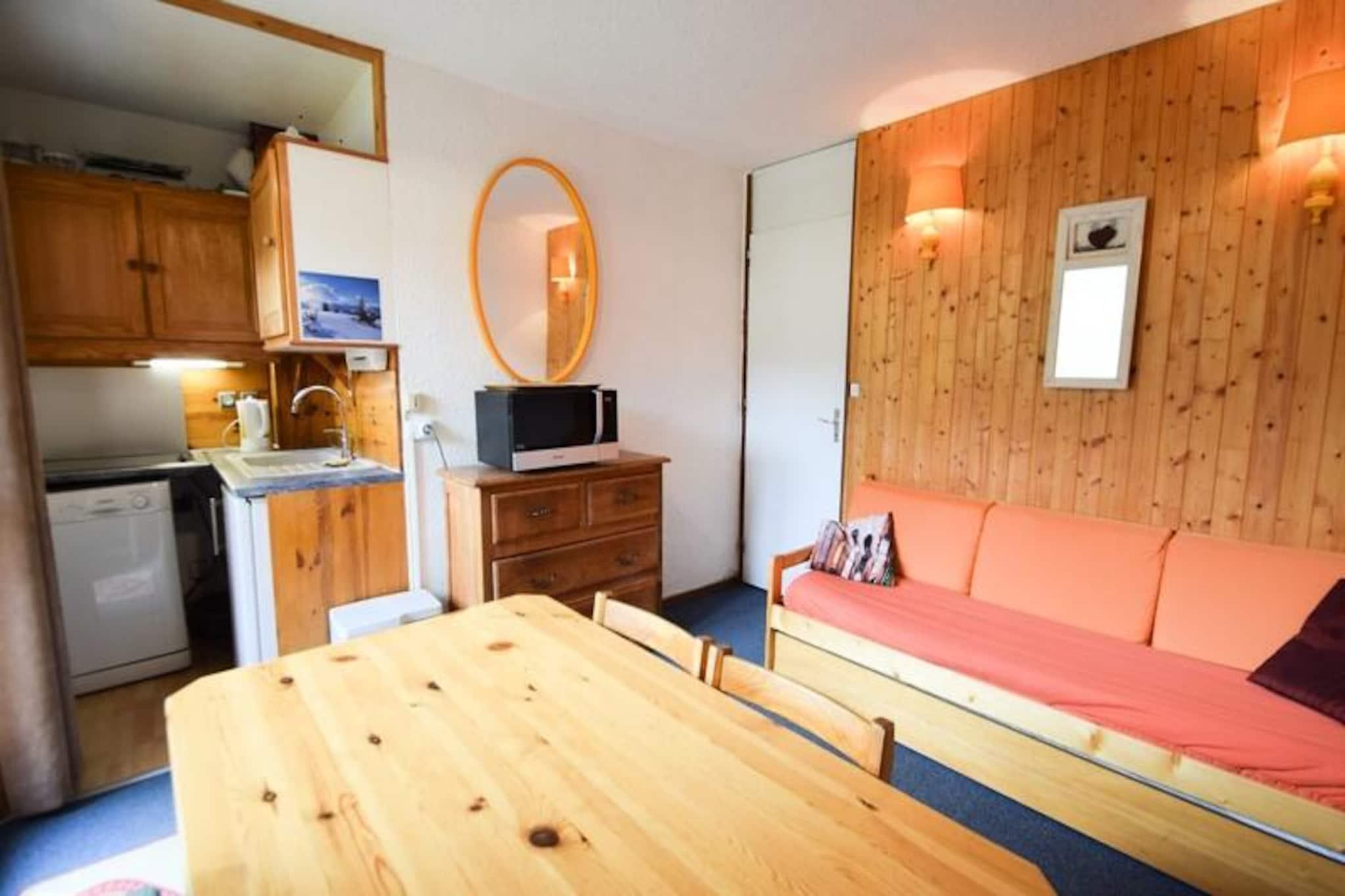 Högt ovanför Plagne Villages fridfulla alpina landskap erbjuder denna charmiga studiolägenhet en plats på första parkett i backarna och en mysig tillflyktsort för upp till fyra gäster. Tänk dig att vakna upp till den friska bergsluften och gå ut på din balkong i söderläge, där den soldränkta utsikten över pisterna inbjuder dig att omfamna dagens äventyr. Med direkt tillgång till ski-in/ski-out är denna bostad en fristad för både snöentusiaster och naturälskare. \n\nInuti är studion noggrant utformad för att maximera komfort och funktionalitet. Köket med öppen planlösning är utrustat med moderna bekvämligheter, inklusive keramikhäll, en kombinerad ugn, ett kylskåp och en diskmaskin, vilket gör matlagningen till en barnlek. Vardagsrummet har en matplats, en TV och två utdragbara enkelsängar, medan den mysiga sovplatsen, avskild av ett draperi, erbjuder våningssängar perfekta för familjer eller små grupper. Ett välutrustat badrum med badkar och integrerad toalett kompletterar utrymmet och garanterar en avkopplande vistelse. \n\nBekvämt beläget i hjärtat av Plagne Villages, bara några steg från lokala butiker och matställen. För extra bekvämlighet förbinder den kostnadsfria TELEBUS-linbanan dig med det livliga Plagne Centre, som erbjuder ännu fler aktiviteter och bekvämligheter. Oavsett om du åker genom färskt pudersnö på vintern eller utforskar natursköna stigar på sommaren, är denna studio den perfekta basen för din alpina semester. \n\nMed sitt oslagbara läge, moderna bekvämligheter och hisnande utsikt lovar denna fastighet en oförglömlig bergsresa för varje säsong.