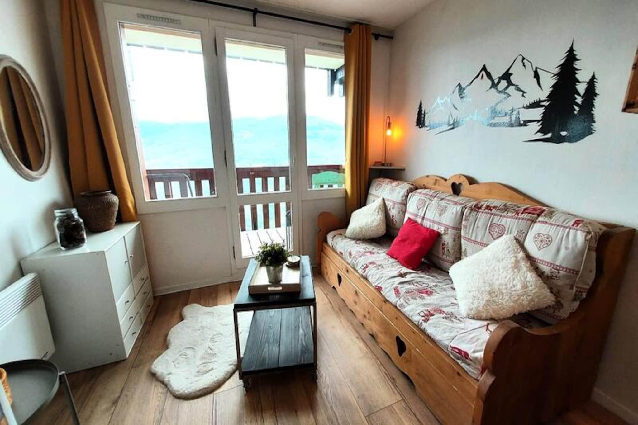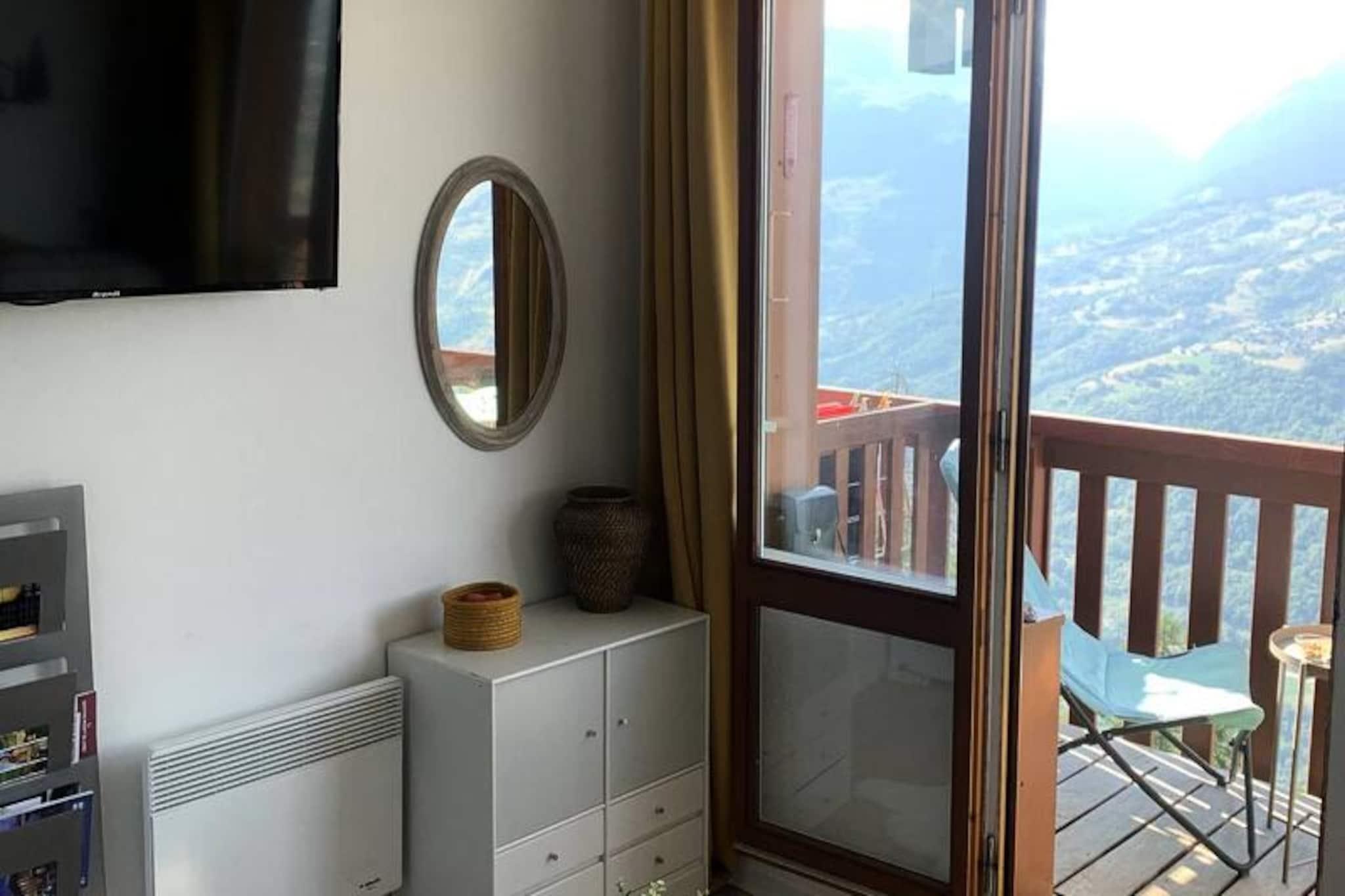 Med hisnande utsikt över Mont Blanc och inbäddat i det fridfulla Observatoire-distriktet i Les Coches, erbjuder denna charmiga lägenhet en lugn alpin tillflyktsort bara några steg från backarna. Tänk dig att vakna upp till dalens majestätiska panorama, smutta på kaffe på din nordvästvända balkong och förbereda dig för en dag av äventyr i Paradiski-området. Oavsett om du är här för att åka skidor på vintern eller vandra på sommaren, inbjuder denna mysiga oas dig att fördjupa dig i de franska Alpernas skönhet. \n\nLägenheten är designad för upp till fyra gäster, sträcker sig över 27 kvadratmeter och är omsorgsfullt utrustad för komfort och bekvämlighet. Den har ett sovrum med dubbelsäng, ett vardagsrum med en bäddsoffa för en enda person och en utdragbar säng, samt ett fullt utrustat kök med moderna apparater inklusive en Nespresso-kaffebryggare och raclette-set. Badrummet och den separata toaletten garanterar avskildhet, medan skidförvaringen i byggnaden gör det praktiskt för vintersportentusiaster. Observera att lägenheten är rökfri, husdjursfri och inte inkluderar Wi-Fi, vilket garanterar en lugn och störningsfri vistelse.\n\nResidenset Le Sextant är idealiskt beläget bara 100 meter från backarna och 300 meter från ortens centrum, tillgängligt via en naturskön gångväg. Allmän parkering finns bekvämt i närheten, och området är känt för sin lugna atmosfär och fantastiska utsikt över Mont Blanc. Les Coches erbjuder en rad aktiviteter året runt, från skidåkning och snowboardåkning till att utforska bergsleder och njuta av lokal savoyardsk mat.\n\nOavsett om du söker spännande utomhusäventyr eller en lugn tillflykt omgiven av naturen, erbjuder denna lägenhet den perfekta basen för att skapa oförglömliga minnen i Alperna. Låt Mont Blancs skönhet och Les Coches charm inspirera din nästa semester.