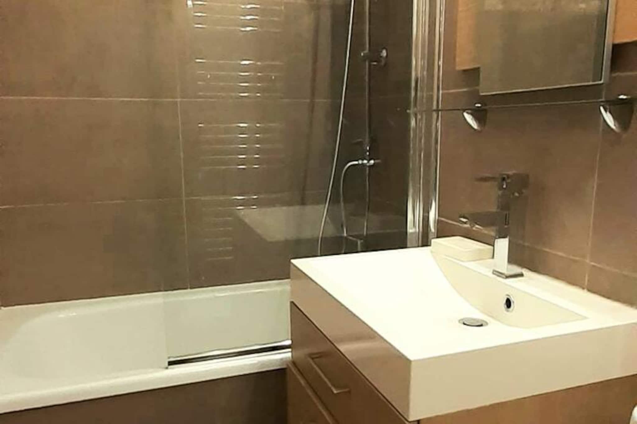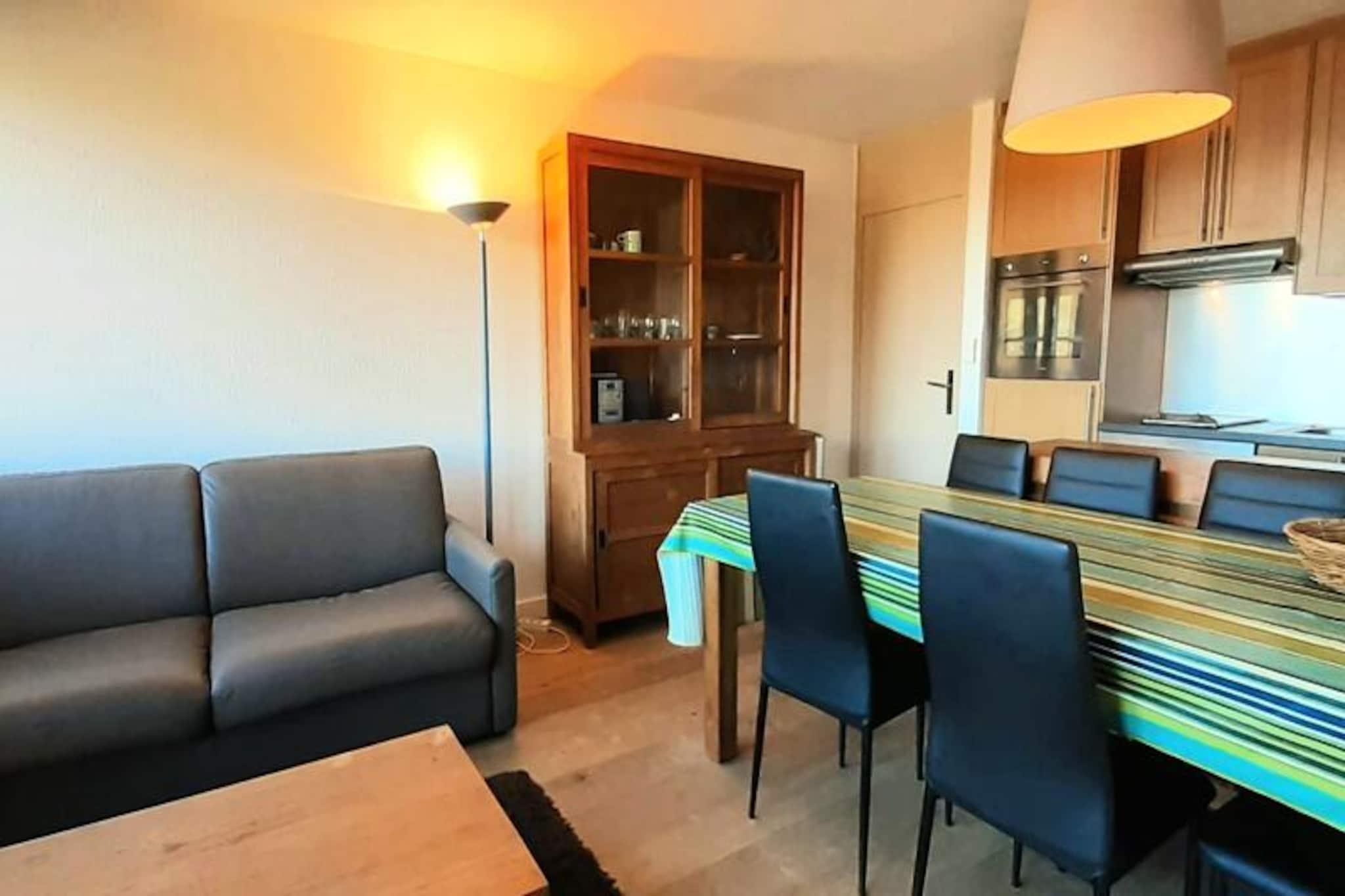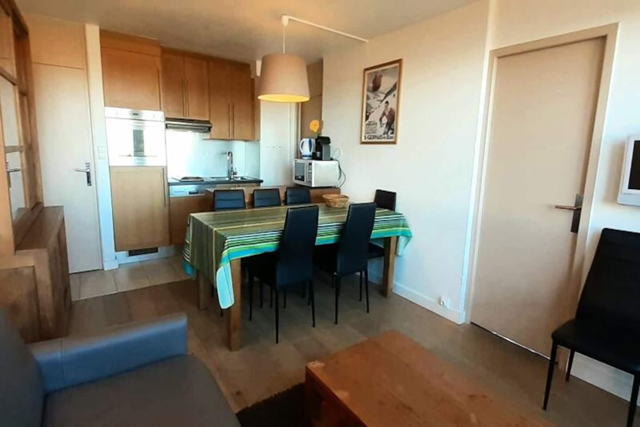 Högt ovanför Tarentaisedalen erbjuder denna charmiga lägenhet i Le Mustag Residence en mysig tillflyktsort för din alpina semester. Belägen i hjärtat av Plagne Centre, på en höjd av 1970 meter, erbjuder den enkel tillgång till det pulserande semesterlivet samtidigt som du får en hisnande utsikt över de omgivande bergen och dalarna. Oavsett om du är här för de snötäckta backarna eller de soliga sommarlederna, är detta den perfekta basen för dina äventyr. Den 43 m² stora lägenheten rymmer bekvämt upp till sex gäster, vilket gör den idealisk för familjer eller små grupper. Det ljusa vardagsrummet inbjuder dig att varva ner med sin mysiga soffa och TV, medan det öppna köket är fullt utrustat med moderna apparater, inklusive diskmaskin, ugn, mikrovågsugn och keramikhäll, vilket säkerställer att du har allt du behöver för att laga mat efter en dags utforskande. De två sovrummen har en dubbelsäng i det ena och två våningssängar i det andra, vilket erbjuder flexibla sovarrangemang. Ett badrum med badkar och toalett kompletterar utrymmet, och ett privat skidförvaring gör det bekvämt för vintersportentusiaster. Plagne Centre är ortens pulserande hjärta, med butiker, restauranger och aktiviteter bara 50 meter från din dörr. Klättringen till La Grande Rochette, en av de mest fantastiska 360°-panoramora i Alperna, är lättillgänglig och erbjuder oförglömliga vyer. På vintern gör ski-in/ski-out-bekvämligheten det enkelt att ta sig ut i backarna, medan sommaren ger möjligheter till vandring, mountainbike och att njuta av den alpina skönheten. Oavsett om du söker spännande äventyr eller lugna stunder omgivna av naturen, kombinerar denna lägenhet komfort, bekvämlighet och ett oslagbart läge. Gör din vistelse i de franska Alperna verkligt minnesvärd med denna inbjudande bergsresort.