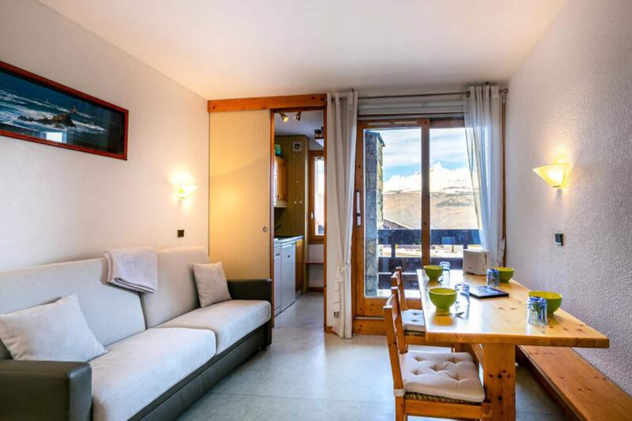 Tänk dig att vakna upp till den hisnande utsikten över Mont Blanc från din privata balkong, där den friska alpina luften sätter tonen för en dag av äventyr. Denna charmiga lägenhet på 26 m², inbäddad i det fridfulla Observatoire-distriktet i Les Coches, erbjuder en inbjudande tillflyktsort för upp till fyra gäster. Med sin mysiga atmosfär och genomtänkta bekvämligheter är det den perfekta basen för att utforska de franska Alpernas skönhet. Lägenheten har ett bekvämt sovrum med våningssängar och ett vardagsrum utrustat med bäddsoffa, TV och radio. Det separata pentryt är fullt utrustat med mikrovågsugn, diskmaskin, elektriska kokplattor och till och med ett racletteset för en äkta alpin matupplevelse. En modern dusch och separat toalett bidrar till bekvämligheten, medan balkongen i norrläge erbjuder fantastisk utsikt över dalen och Mont Blanc. Skidentusiaster kommer att uppskatta skidförvaringen i byggnaden och närheten till backarna, bara 100 meter bort. L'Équerre ligger mindre än 300 meter från butikerna och centrum och kombinerar lugn och ro med tillgänglighet. Gångvägen gör det enkelt att nå Les Coches livliga hjärta på under fem minuter, medan den fridfulla omgivningen garanterar en vilsam vistelse. Allmän parkering finns precis framför boendet, vilket ytterligare ökar bekvämligheten. Oavsett om du är här för skidåkning i världsklass, natursköna vandringsleder eller helt enkelt för att njuta av den alpina charmen, erbjuder den här lägenheten allt du behöver för en oförglömlig semester. Med Mont Blanc som bakgrund och backarna precis utanför dörren är varje ögonblick här ett minne i vardande.