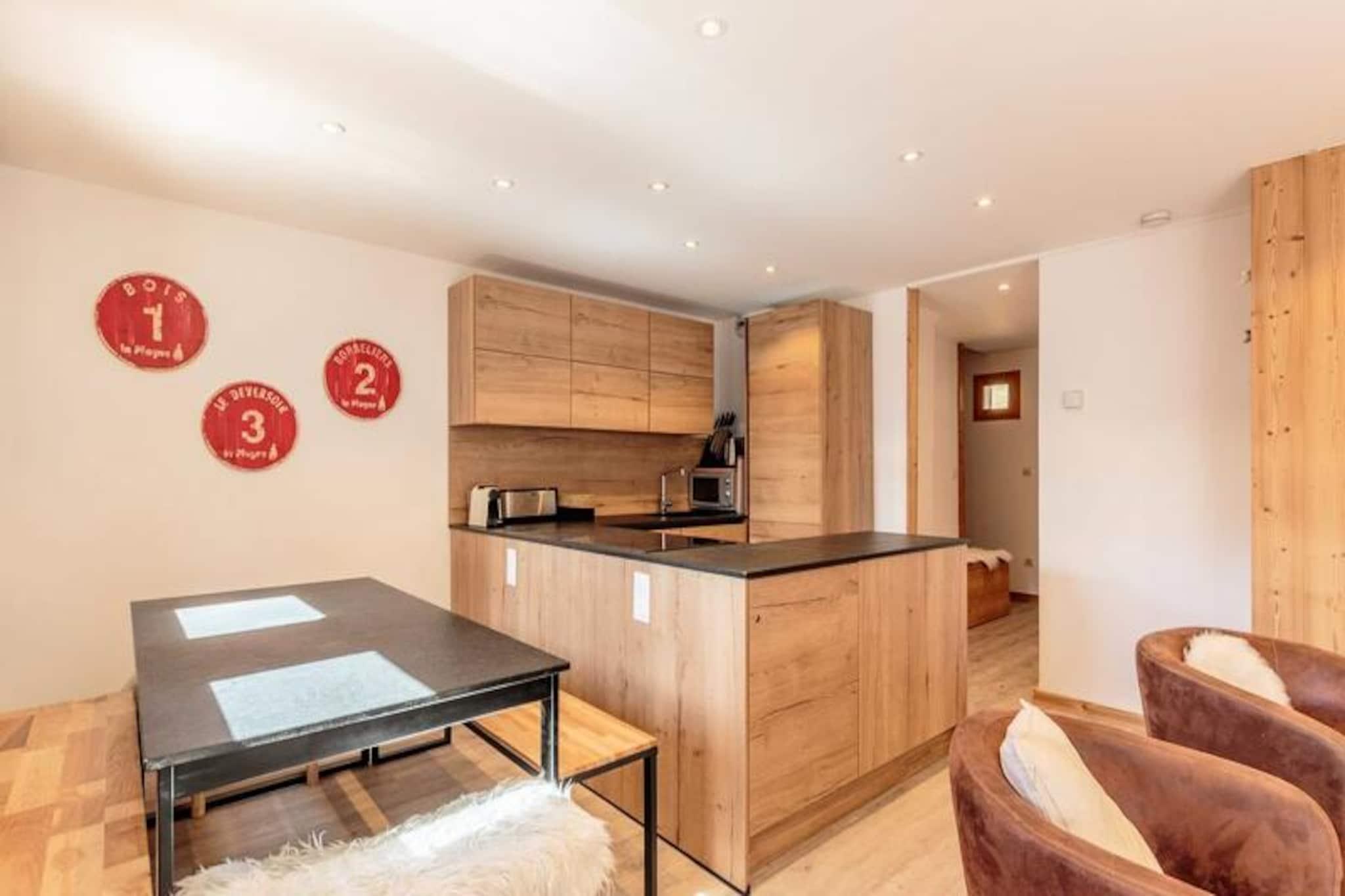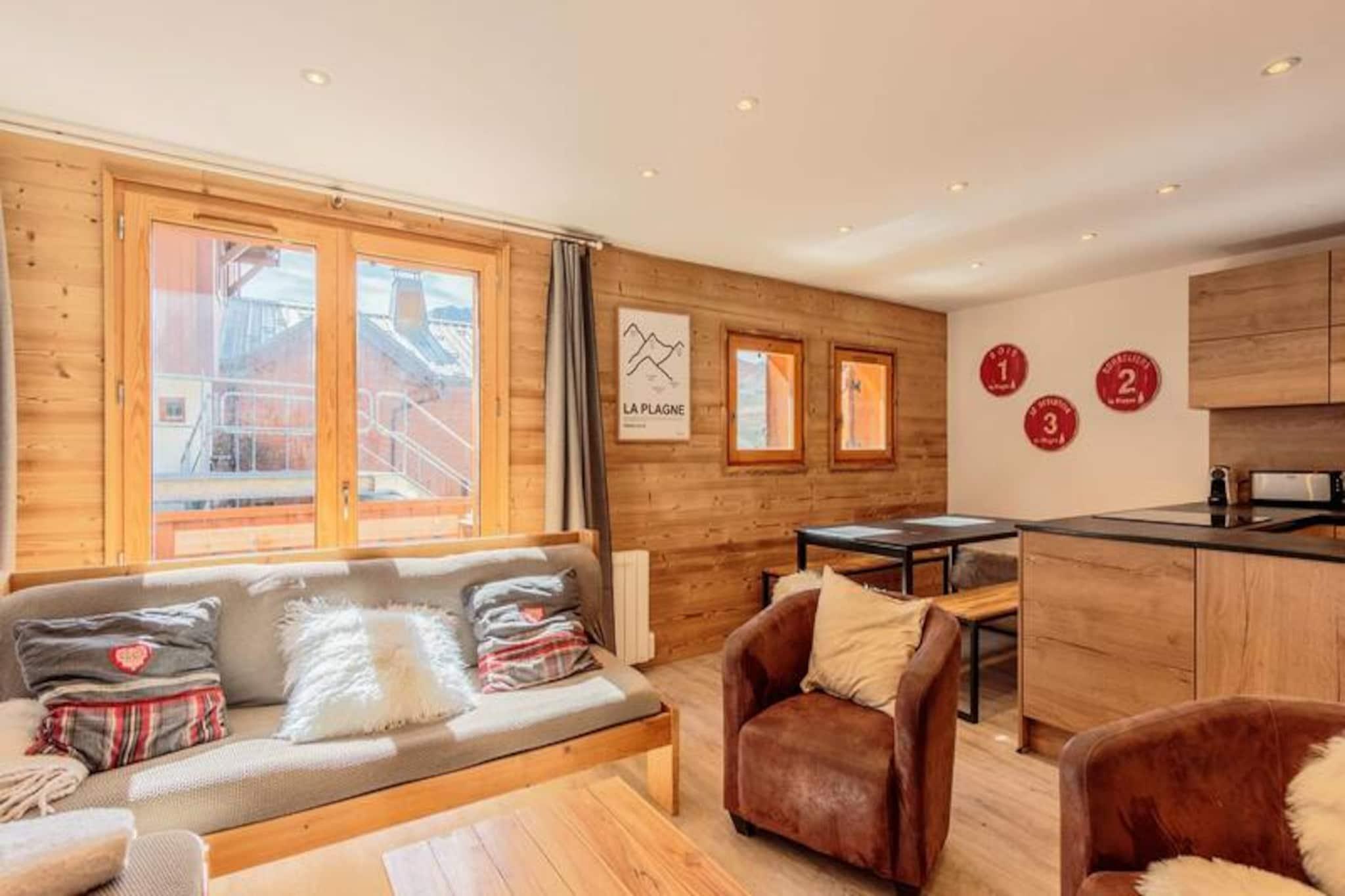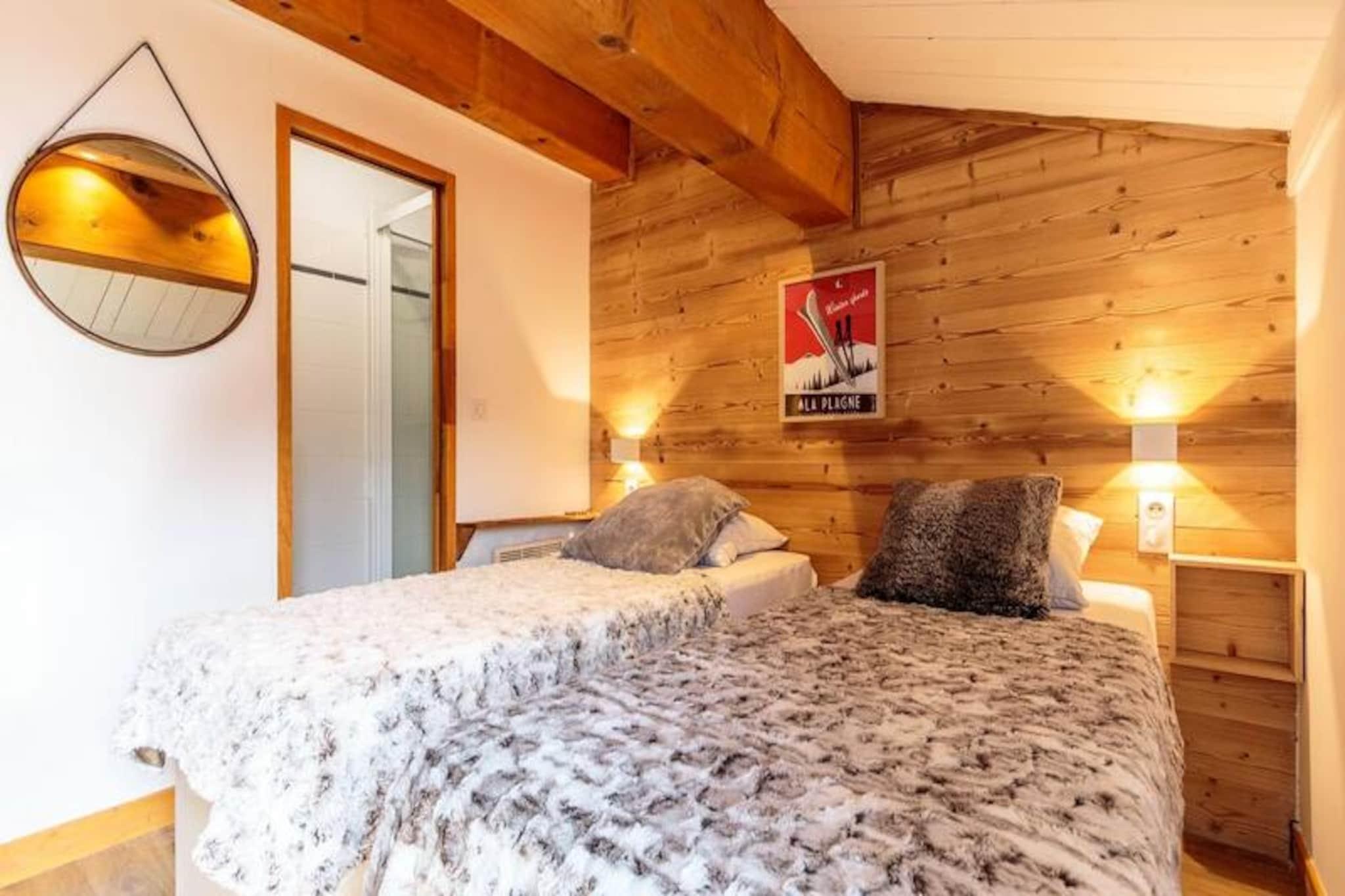 Högt uppe i den fridfulla alpbyn Plagne Soleil inbjuder denna charmiga stuga dig att uppleva den perfekta bergsupplevelsen. Badad i solljus och omgiven av hisnande toppar, erbjuder den en lugn tillflyktsort där de franska Alpernas skönhet möter det moderna livets bekvämligheter. Oavsett om du är här för att skapa nya stigar i backarna eller utforska natursköna vandringsleder, är denna stuga den perfekta basen för dina äventyr. Stugat, som sträcker sig över 80 m² i två våningar, rymmer bekvämt upp till åtta gäster. Den första våningen har ett rymligt och inbjudande vardagsrum med en mysig öppen spis, en solig balkong och en stor matplats perfekt för familjesammankomster. Det öppna köket är fullt utrustat med allt från en Nespresso-maskin till en fondue-set, vilket säkerställer att du enkelt kan njuta av rejäla alpina måltider. Ett privat sovrum med eget duschrum och toalett finns också på denna våning. På övervåningen hittar du ytterligare tre sovrum, alla med eget duschrum och toalett, som erbjuder flexibla sovarrangemang med enkelsängar som kan sättas ihop eller separeras. Ytterligare bekvämligheter inkluderar ett skidförvaringsskåp och en skotork för din bekvämlighet. Plagne Soleils utmärkta läge i hjärtat av skidområdet garanterar enkel tillgång till backarna och vandringslederna. En gratis transferservice tar dig till närliggande Plagne Village, vilket ytterligare ökar bekvämligheten. Efter en dag av äventyr kan du varva ner på balkongen och njuta av panoramautsikten och den friska bergsluften. Med sin blandning av komfort, charm och oslagbara läge lovar denna stuga en oförglömlig alpin semester.